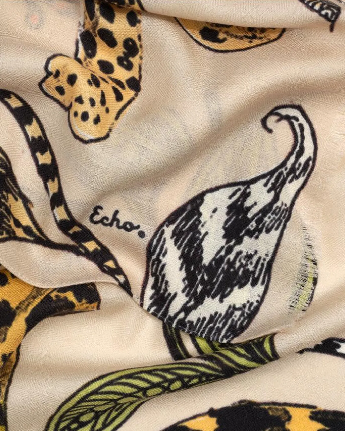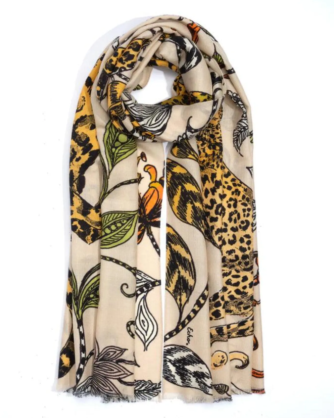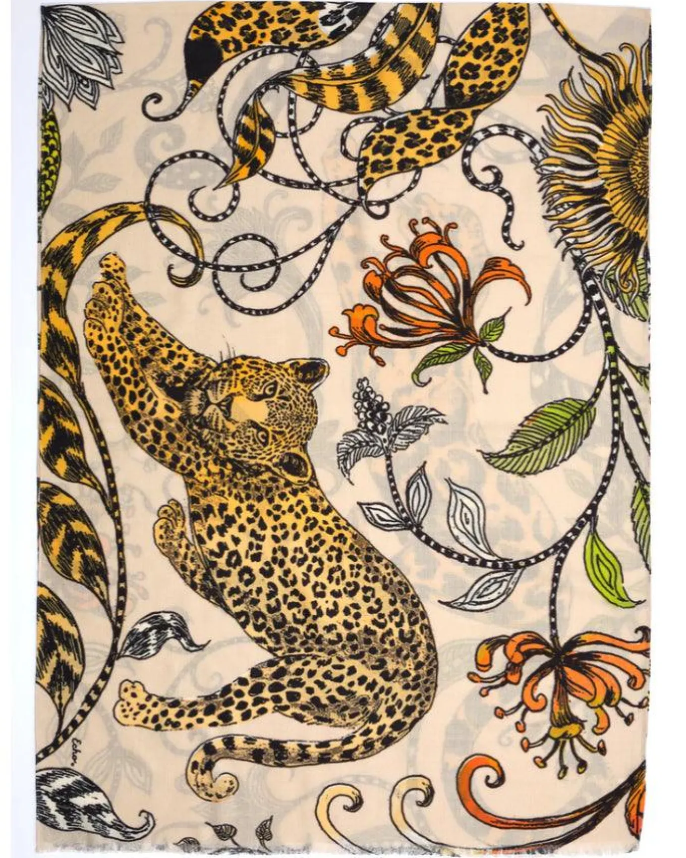 Echo fierce style wool blend wrap with a majestic leopard at center stage amidst a floral backdrop, it’s a statement piece. Dimensions: 27″ x 72″.