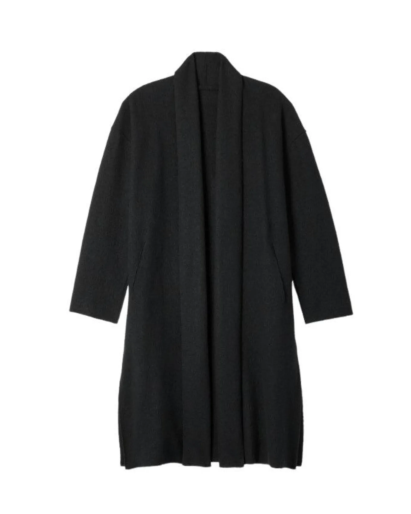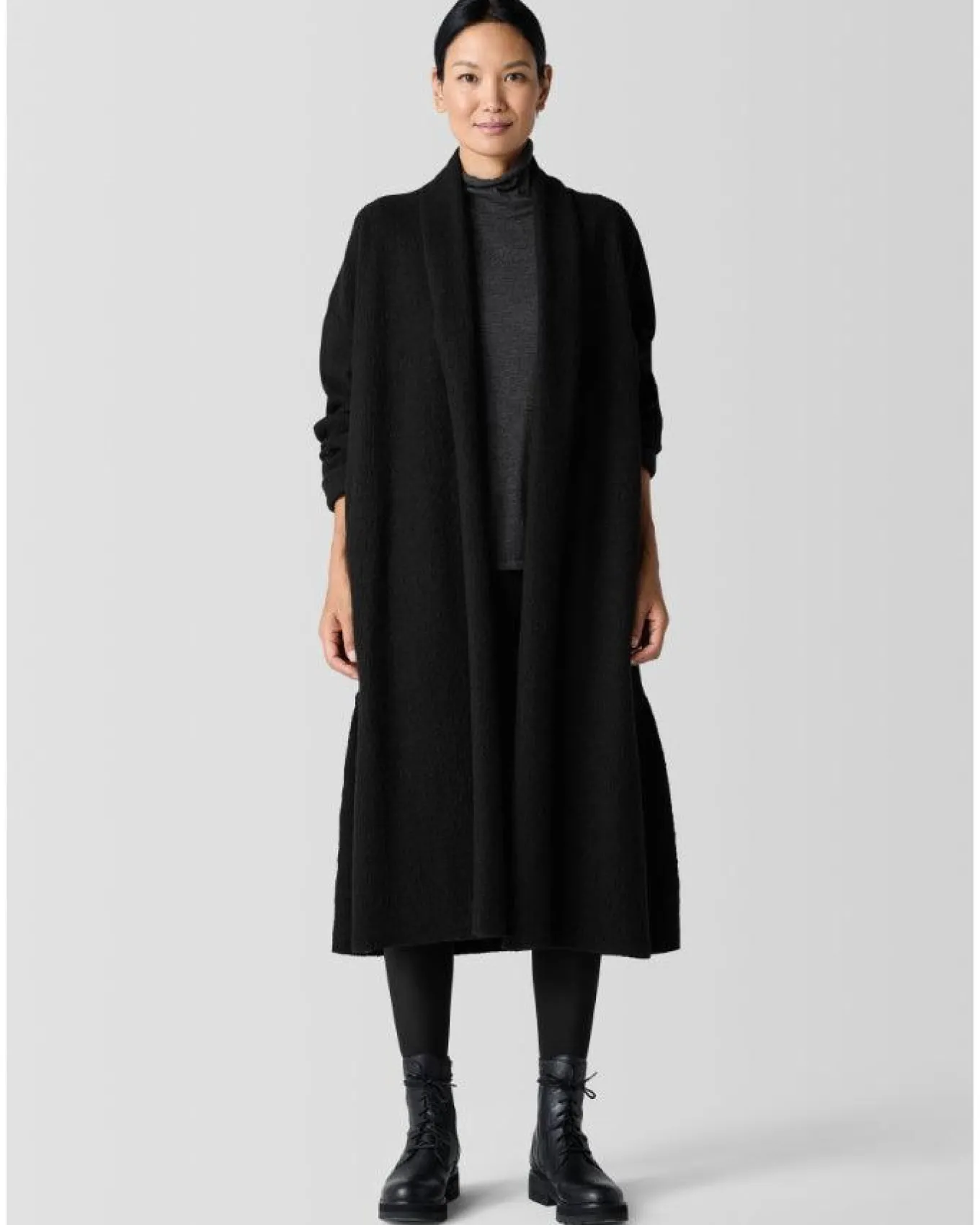Eileen Fisher generous, boxy fit wool open front coat with high collar, drop shoulders, slash pockets, 15 1/2″ side slits and a raw edge hem. Size XS – Length 45″