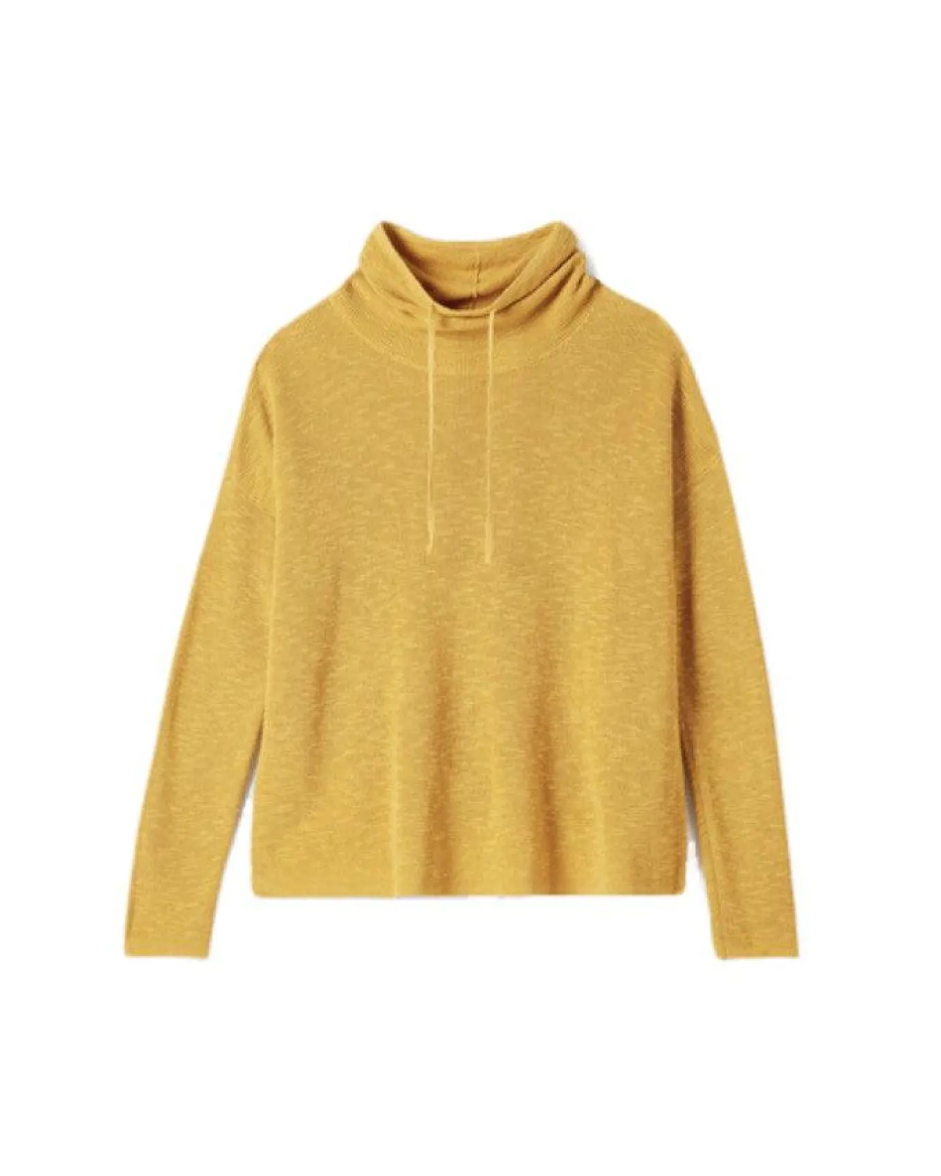 Relaxed boxy fit lightweight linen-cotton blend pullover that drapes away from the body with a touch of texture, drawstring funnel neck and drop shoulders, Size XS – 26″ Length
