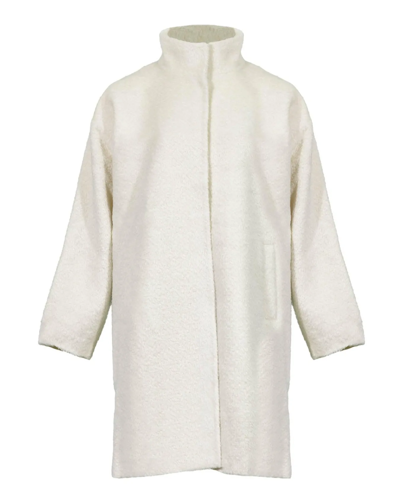 Luxuriously warm and surprisingly lightweight shearling texture alpaca coat with a stand collar, covered snap button closure, welt pockets, boxy fit knee length, center back seam, Size XS – 38″ length