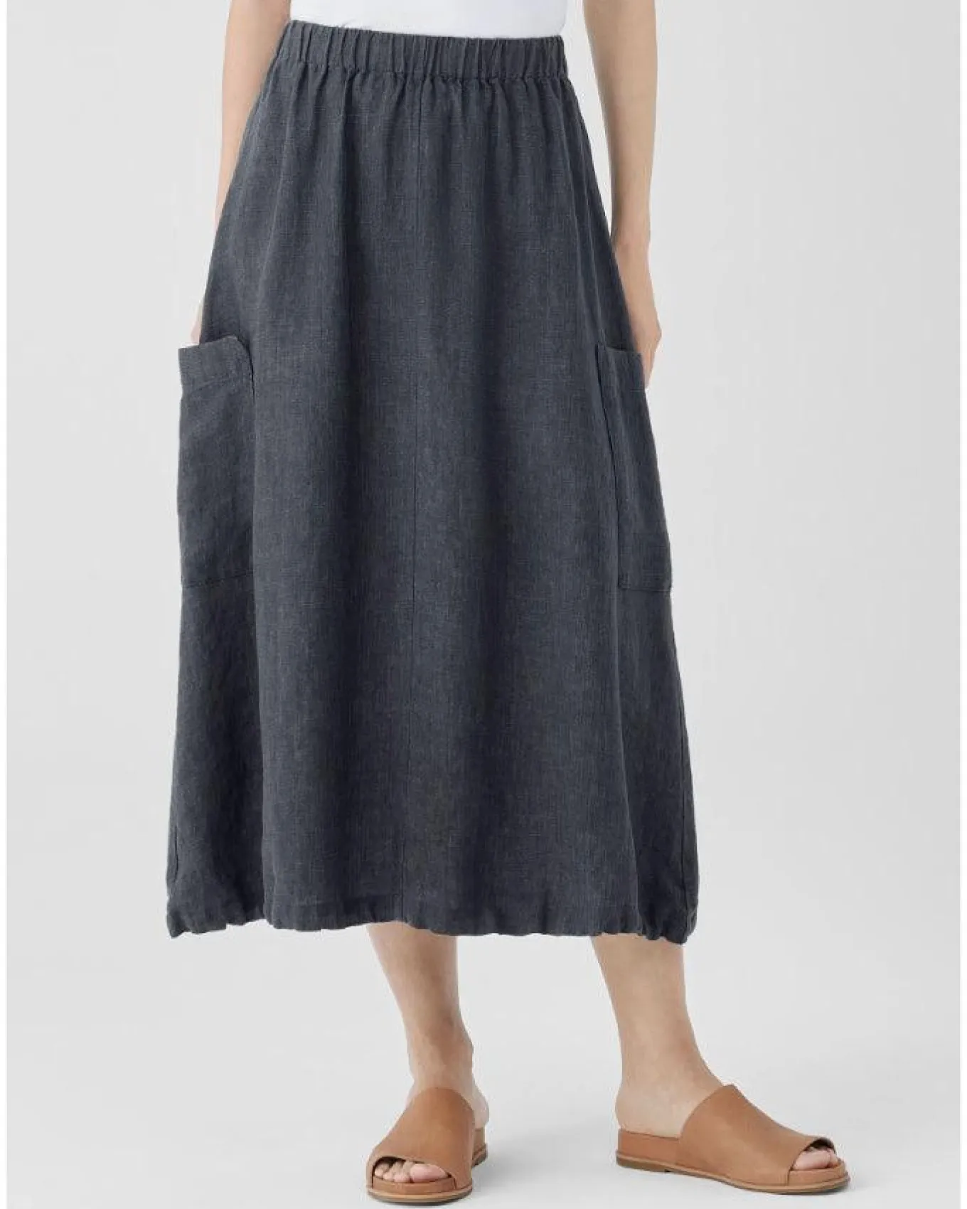 Eileen Fisher linen weave A-line skirt with cargo pockets, 1 1/2″ elastic waistband, centre front and back seam and adjustable drawstring hem, Size XS – Length 32 1/2″.