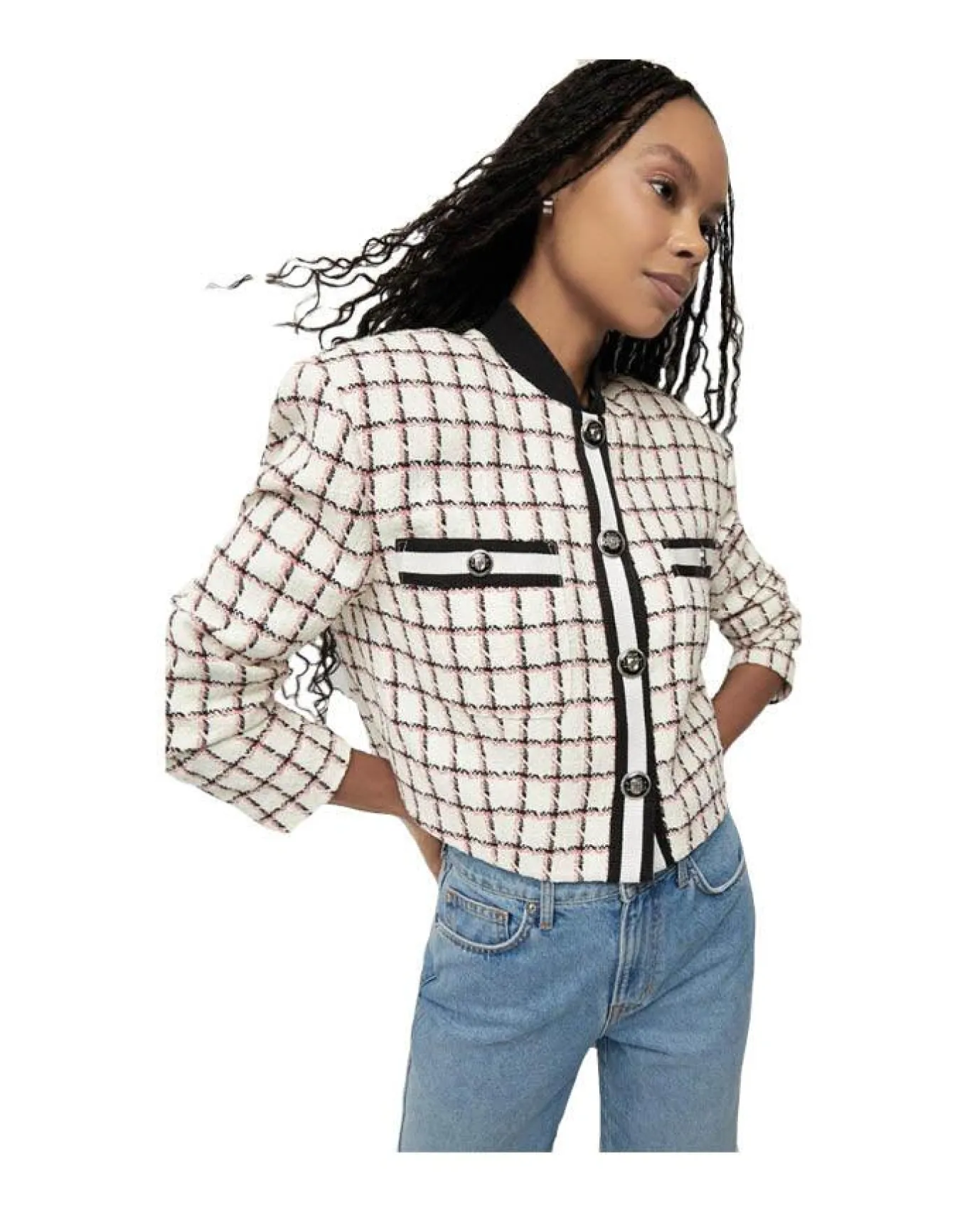 Whether you’re dressing up for a formal event or adding a touch of class to your casual ensemble, the Ellicot Graphic Tweed Jacket promises to be a versatile and striking addition to your wardrobe., Size 2 – Sleeve length 31″ , Legnth 19 3/4″