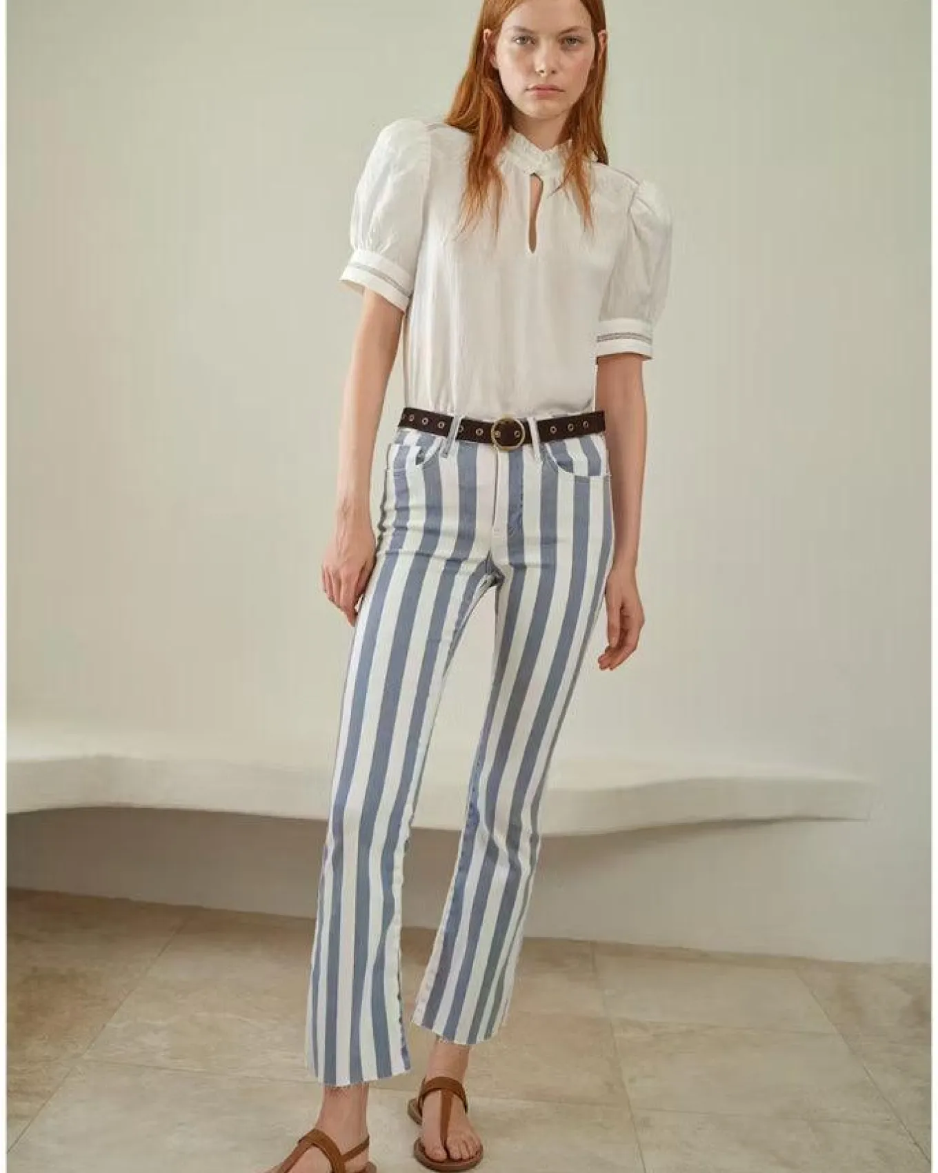 Frame linen rayon blouse with slight puff sleeves, a ruffle stand collar, keyhole neckline and lace inset details.