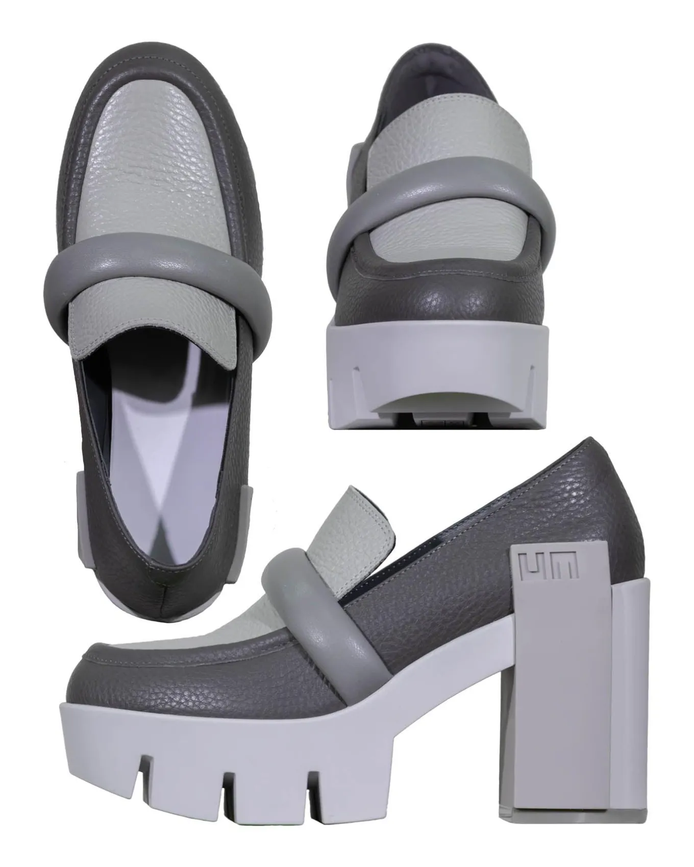 Tumbled leather slip on loafer shoe with a platform lift, a statement logo block 4″ heel and a defining lug sole, Runs small, recommend sizing up