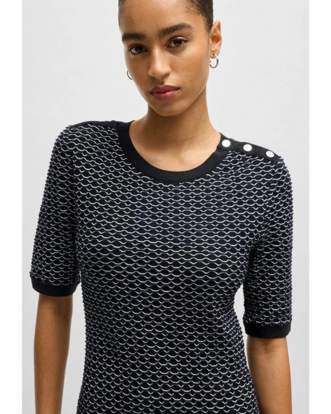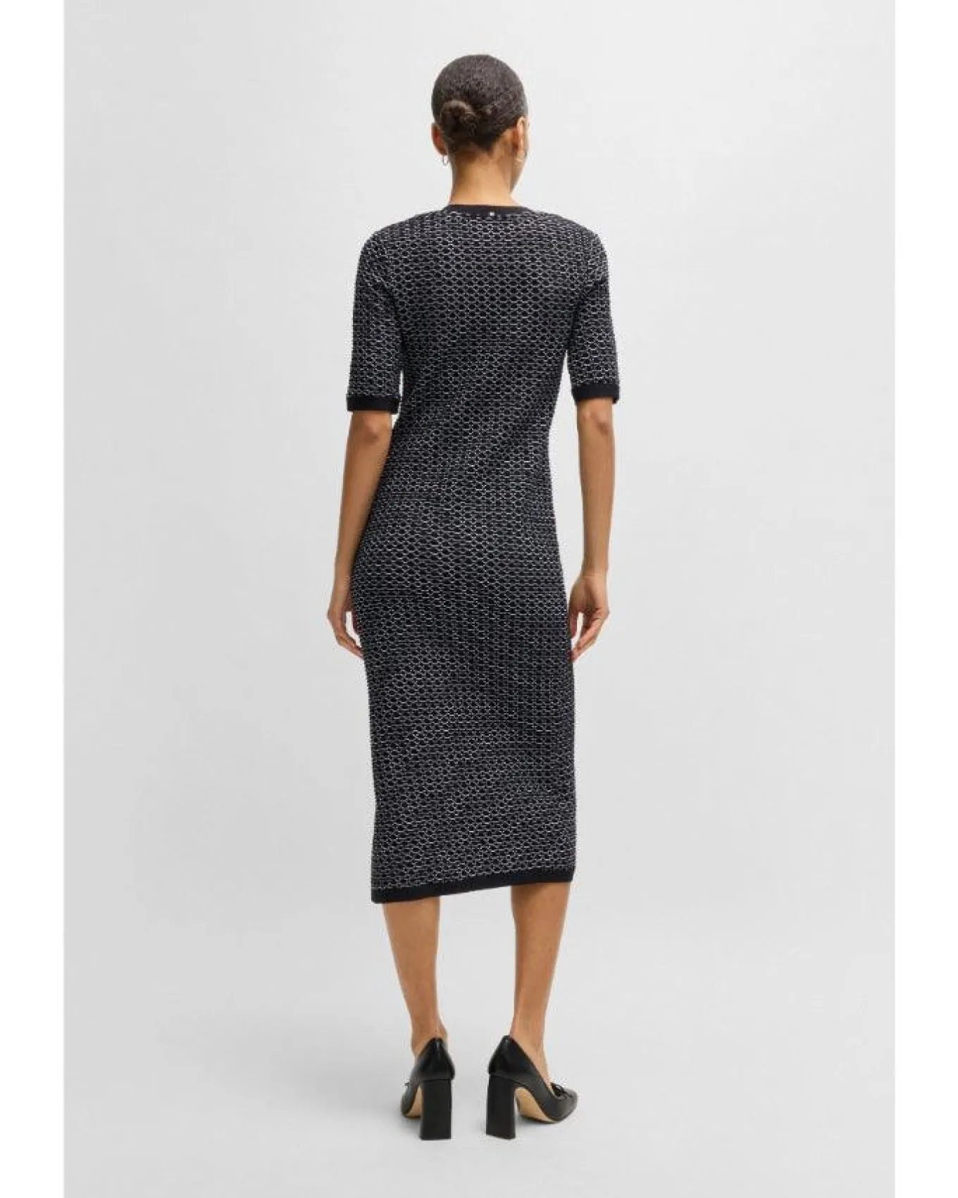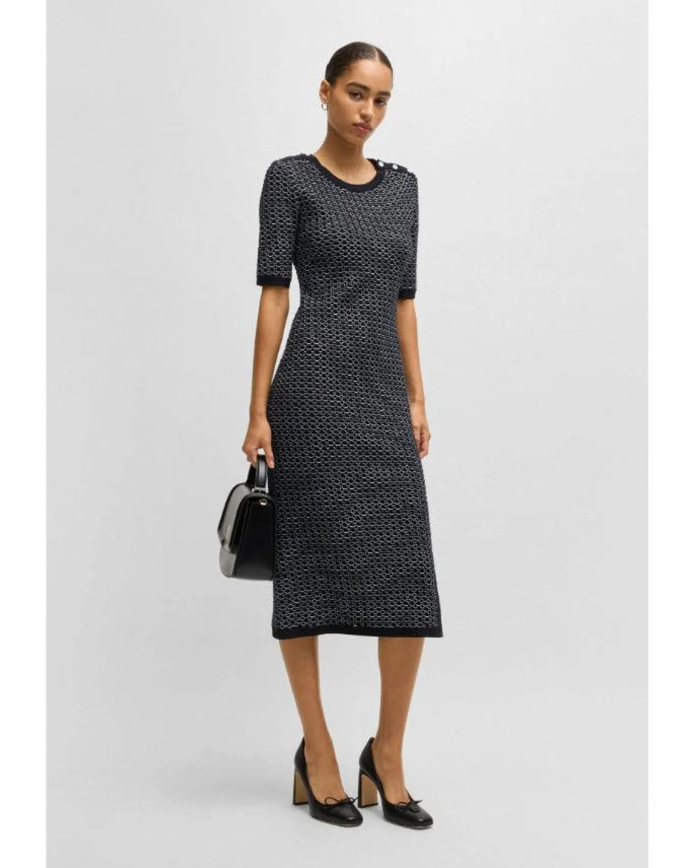 Hugo Boss distinctive soft cotton blend jacquard jersey knit dress with elbow length sleeves, button trimmed left shoulder, side slit,black banded trims accents the dress. The fabric features a structured stripe in signature colors for an iconic look.