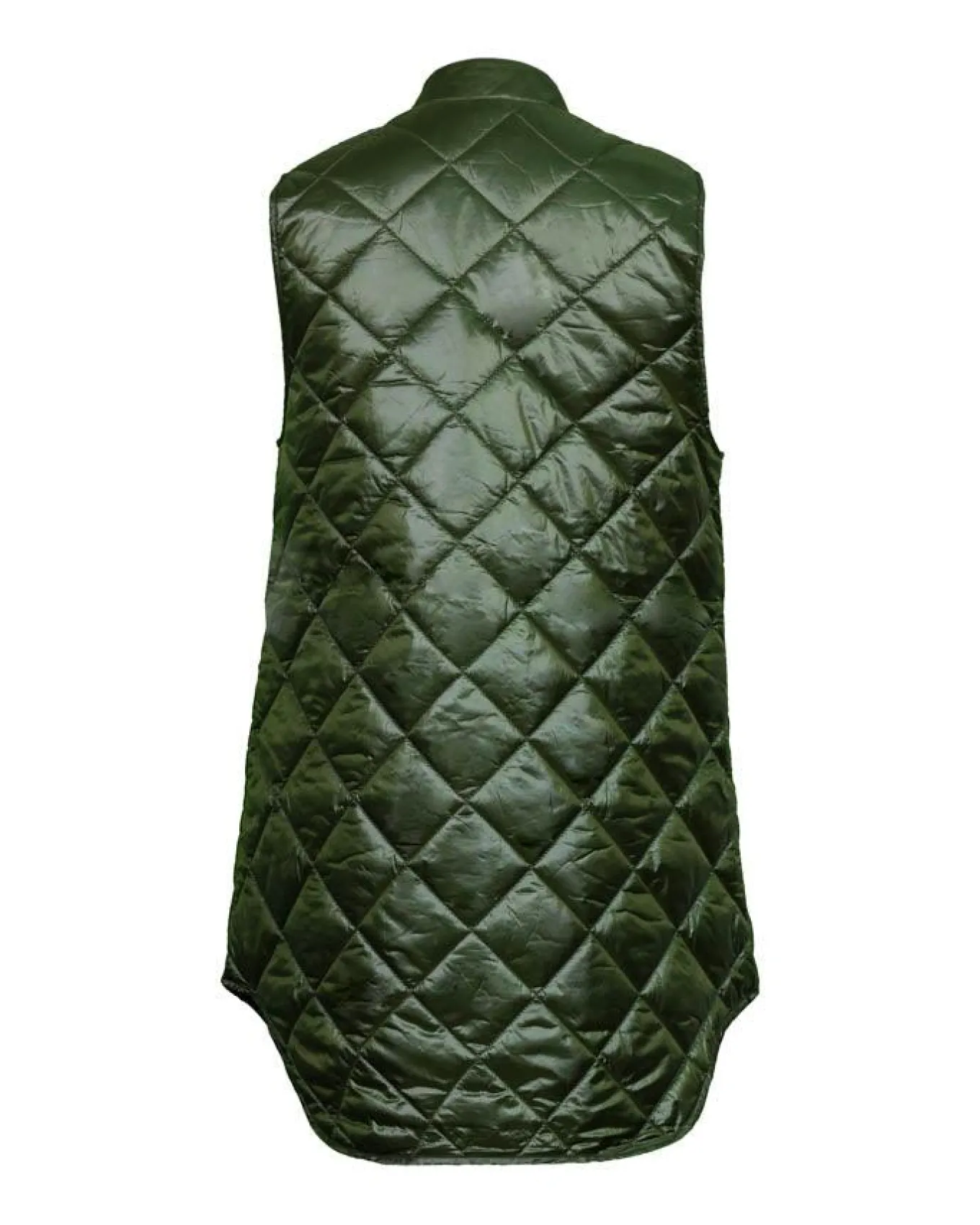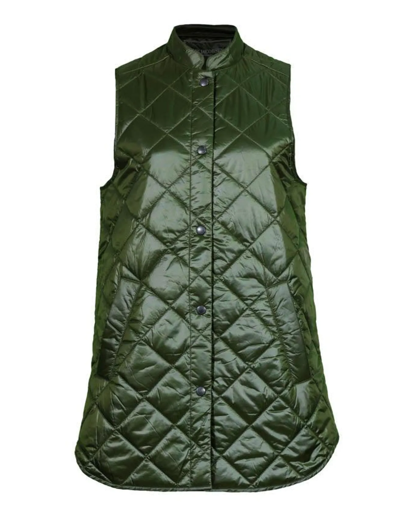 llse Jacobsen short lightweight sleeveless quilted vest is slightly A-shape features press button down closure, front pockets and rounded high-low hem.