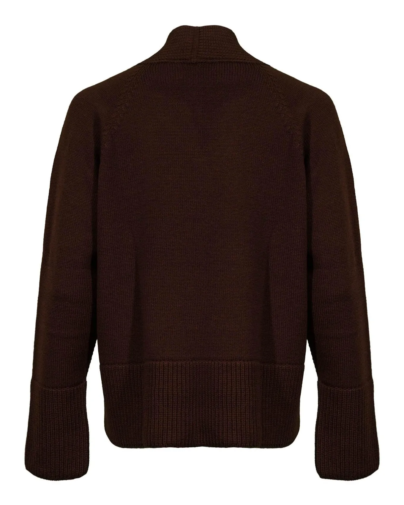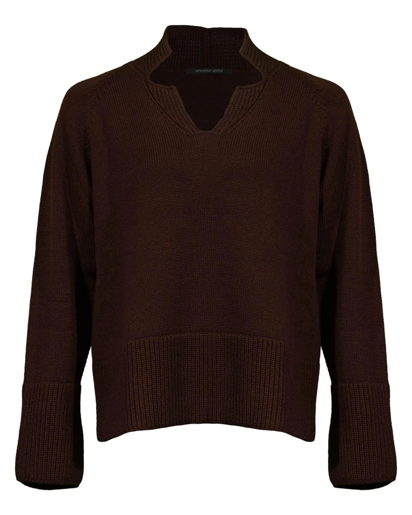 Fine wool knit v-neck pullover with stand collar and wide ribbed cuffs and hem