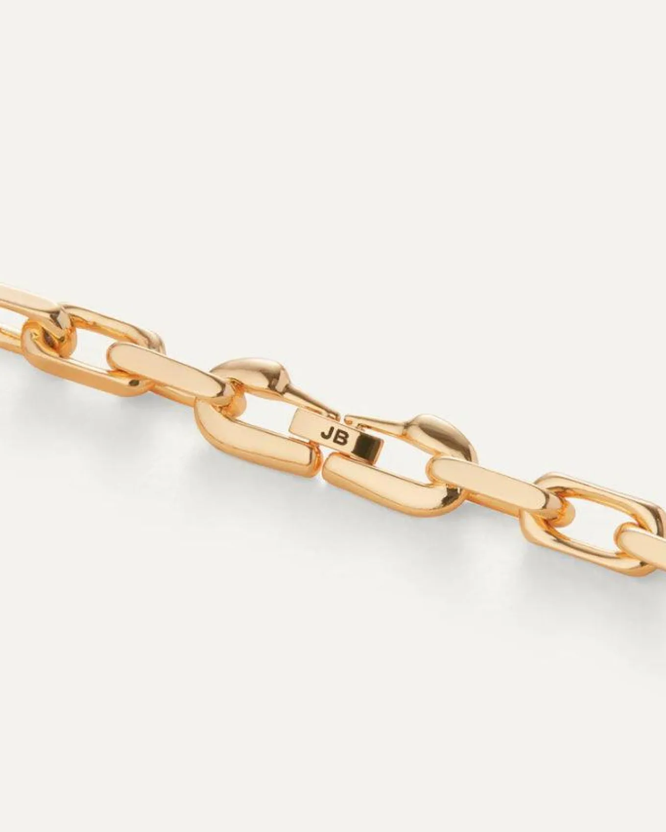 Jenny Bird’s necklace features crisp, faceted links that secure around the neck with a hidden egret closure.