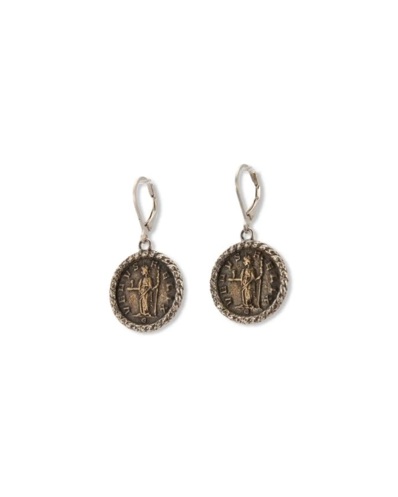 Karyn Chopik, Venus Goddess of Love coin earrings cast from authentic bronze coin dating back to 275AD with sterling silver grecian bezel.