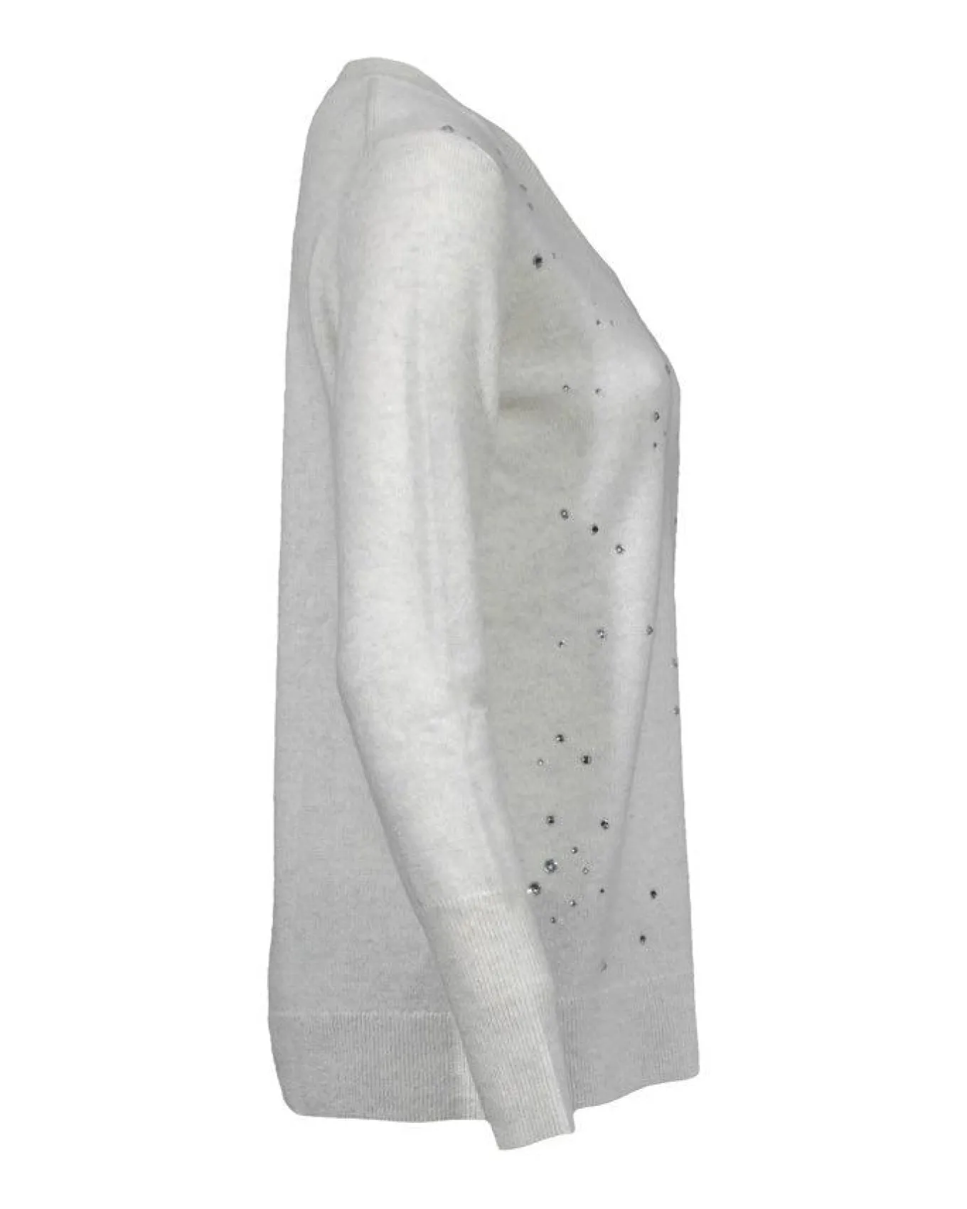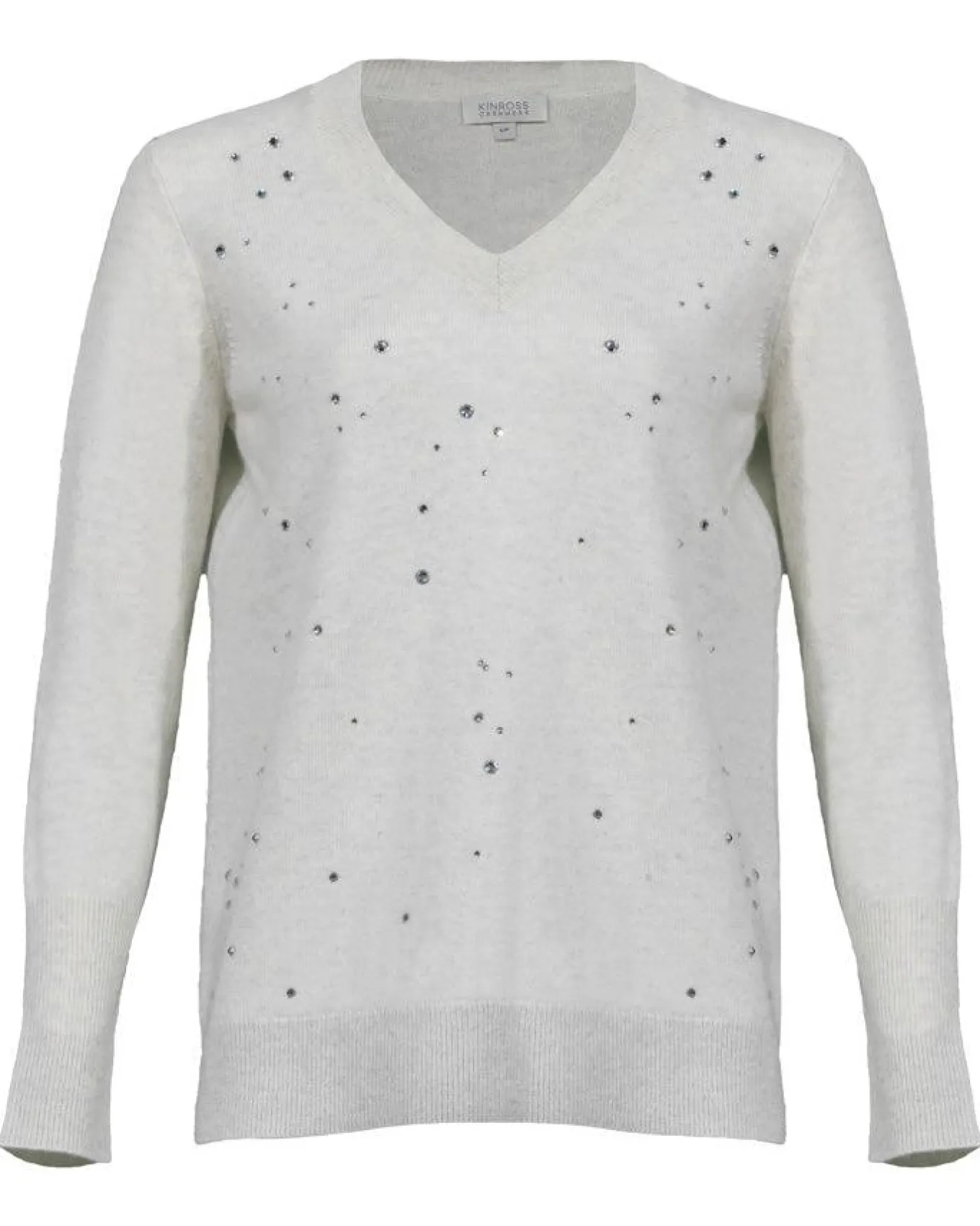 Kinross luxurious, lightweight cashmere pullover with v-neckline, crystal studded front and ribbed trim.