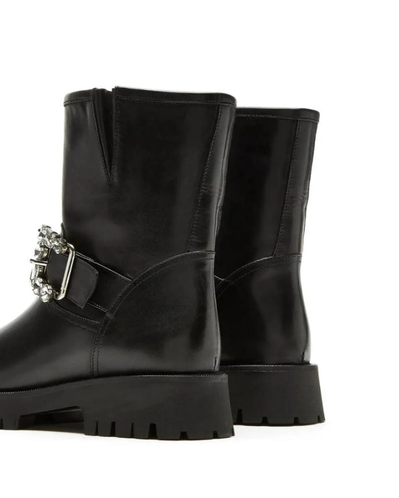 La Canadienne leather motorcycle style boot featuring fashionable crystal embellished buckle, comfortable rubber sole, 1.57″ heel with 0.9″ platform and breathable leather lining, waterproof.