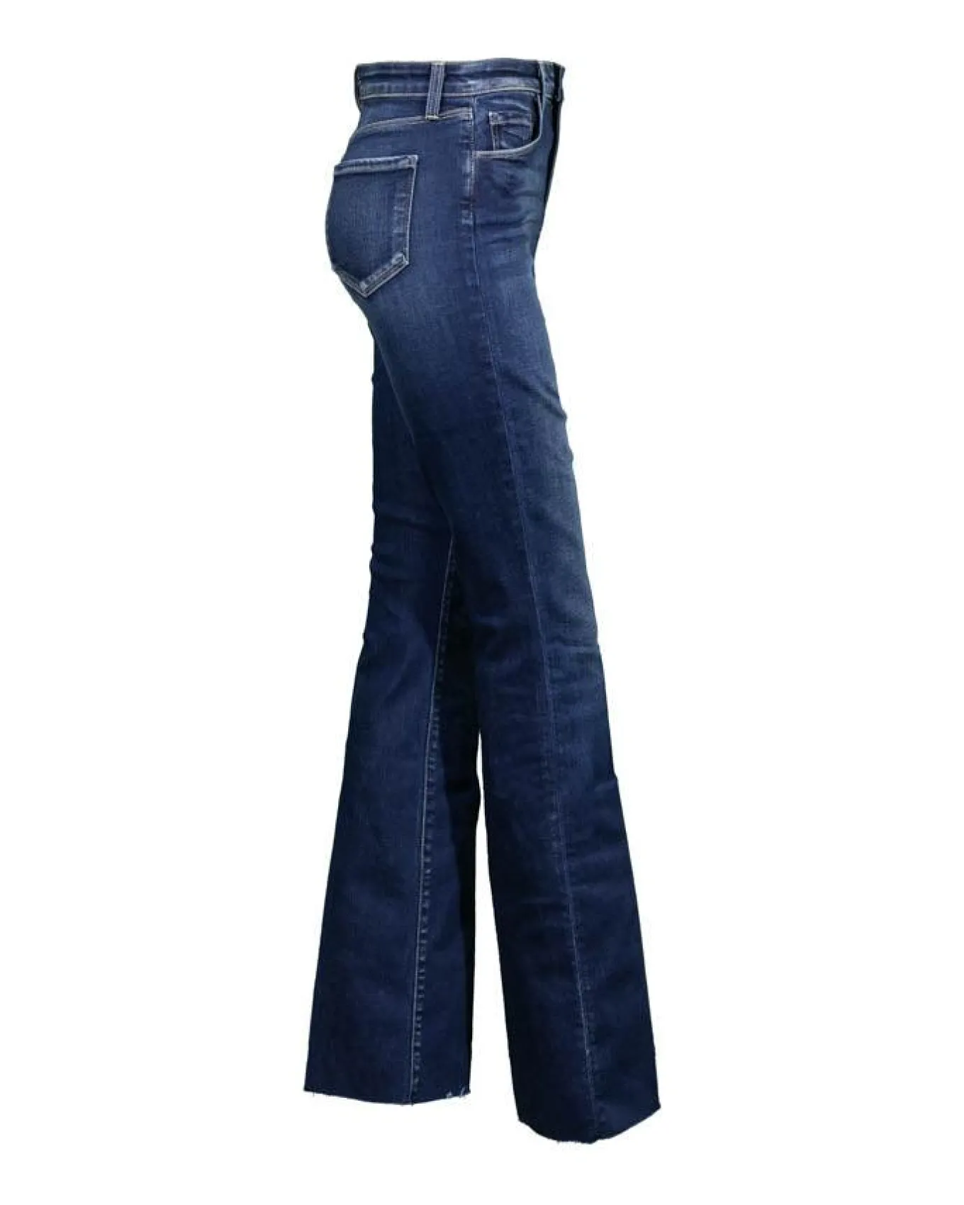 L’Agene classic premium stretch denim high rise jeans with a flattering contoured waistband, style is fitted through hip and thigh before falling in a straight leg to a raw hem, classic five pocket styling, button and zip fly closure, Size 25 – Rise 9.5″, Inseam 34″, Leg Opening 17″.