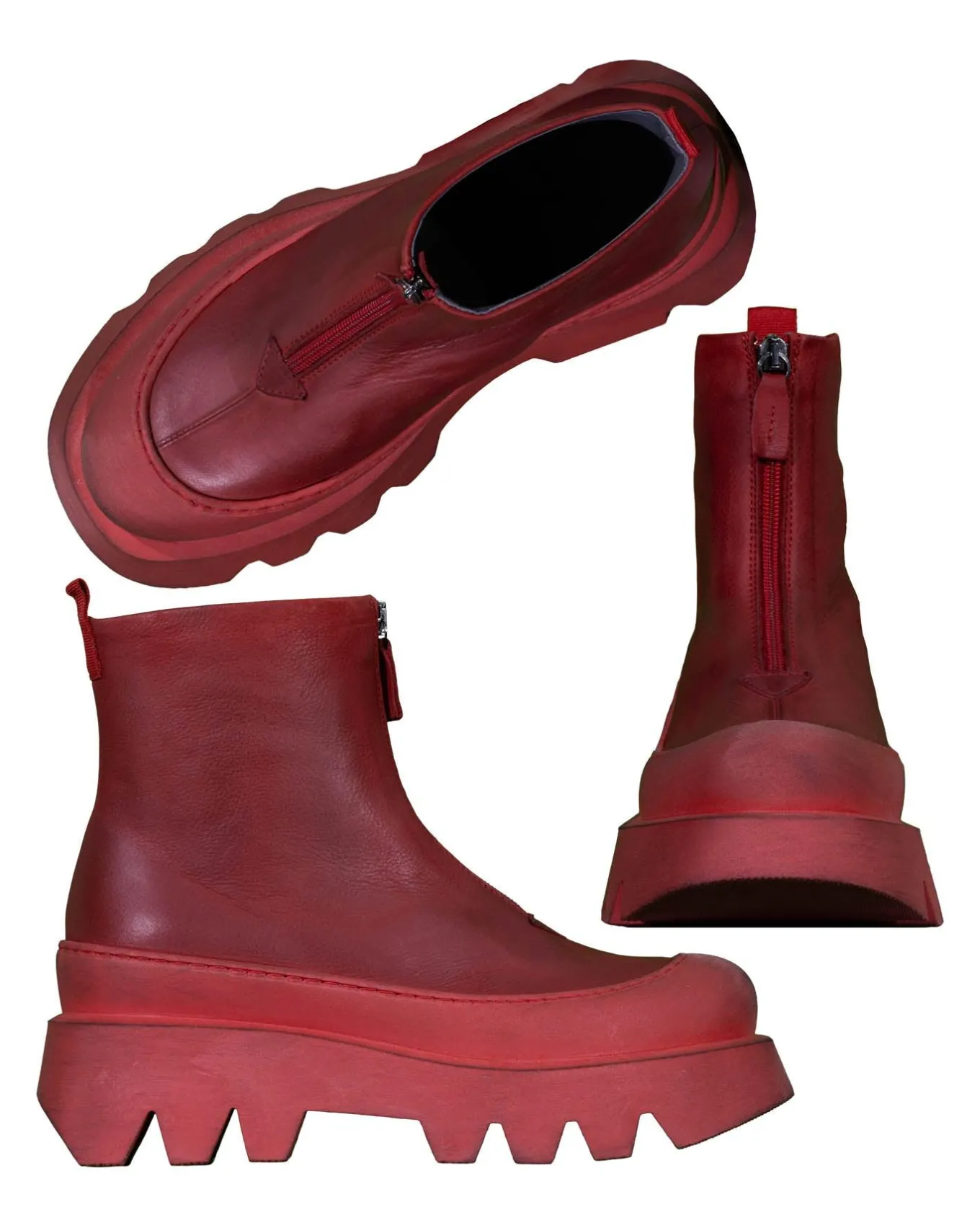 Red leather front zip ankle bootie with lightweight micro chunky sole