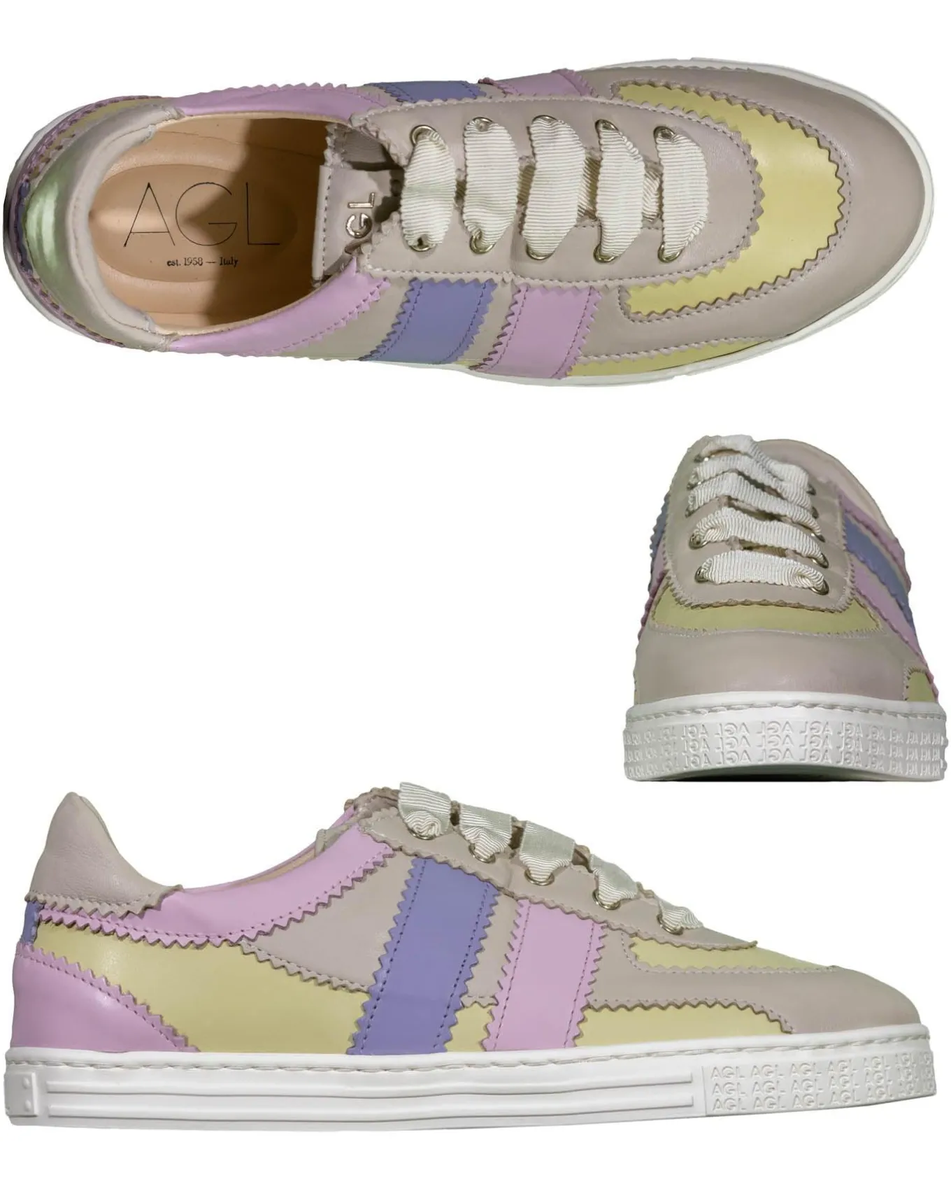 Leather sporty color pattern lace up flat sneaker, 2 cm rubber sole