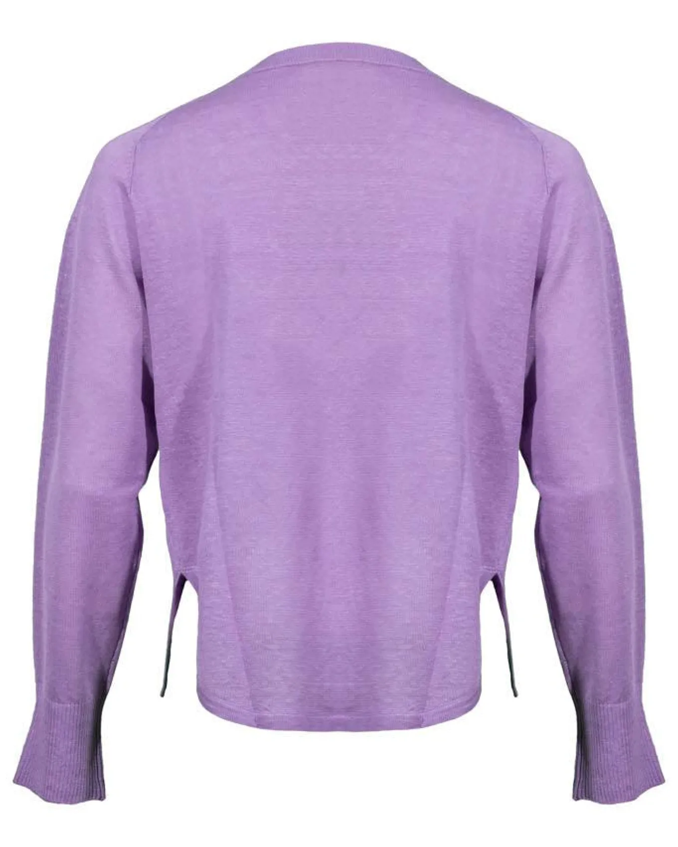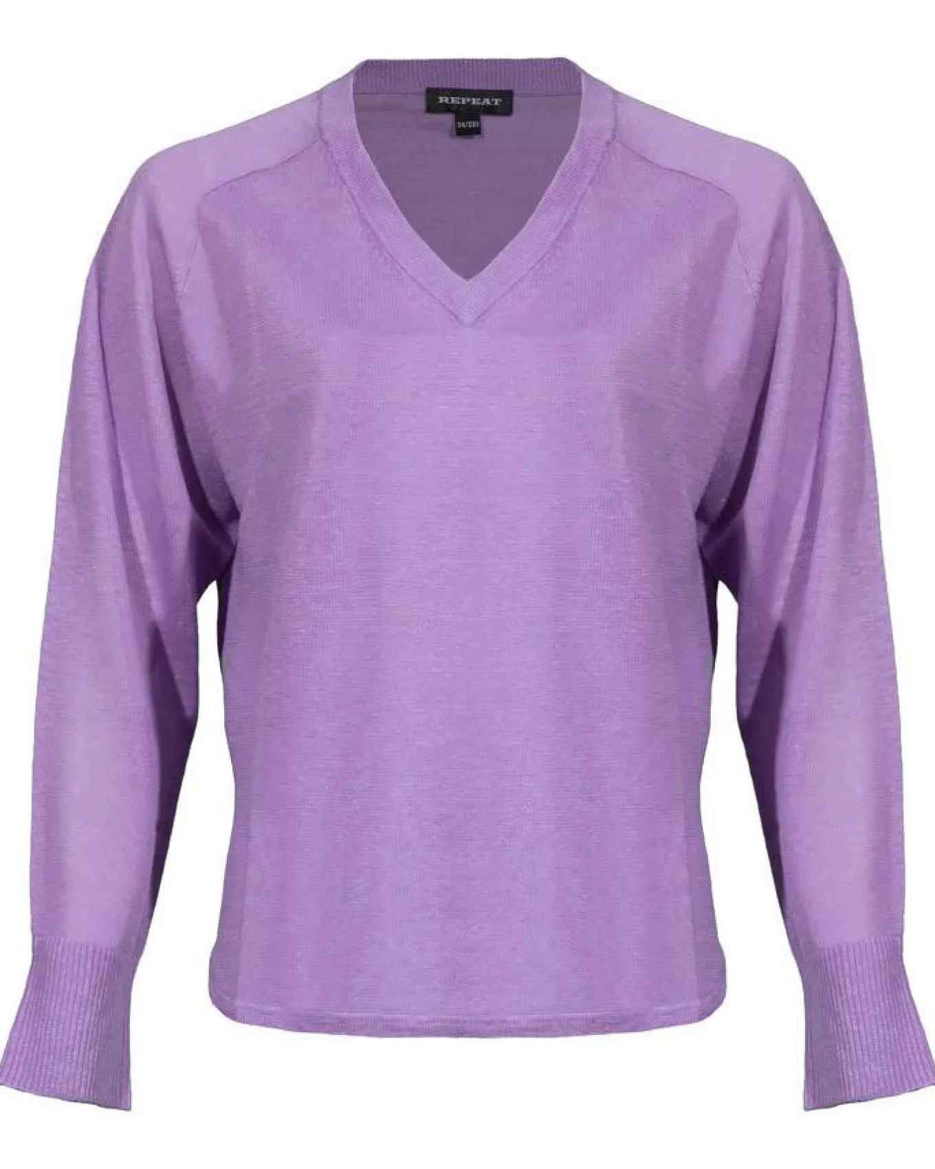Repeat linen knit v-neck pullover with ribbed trim and round slit hem.