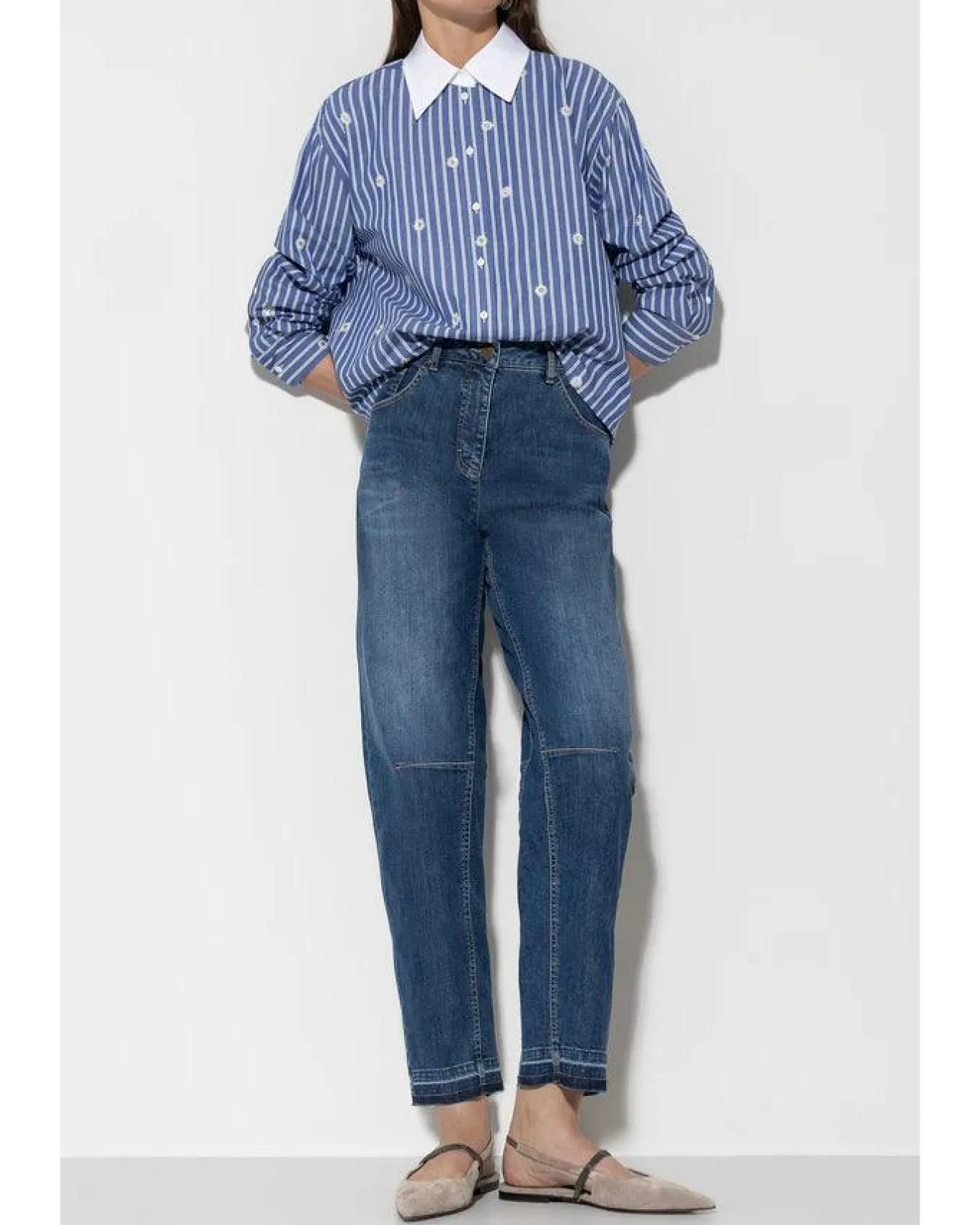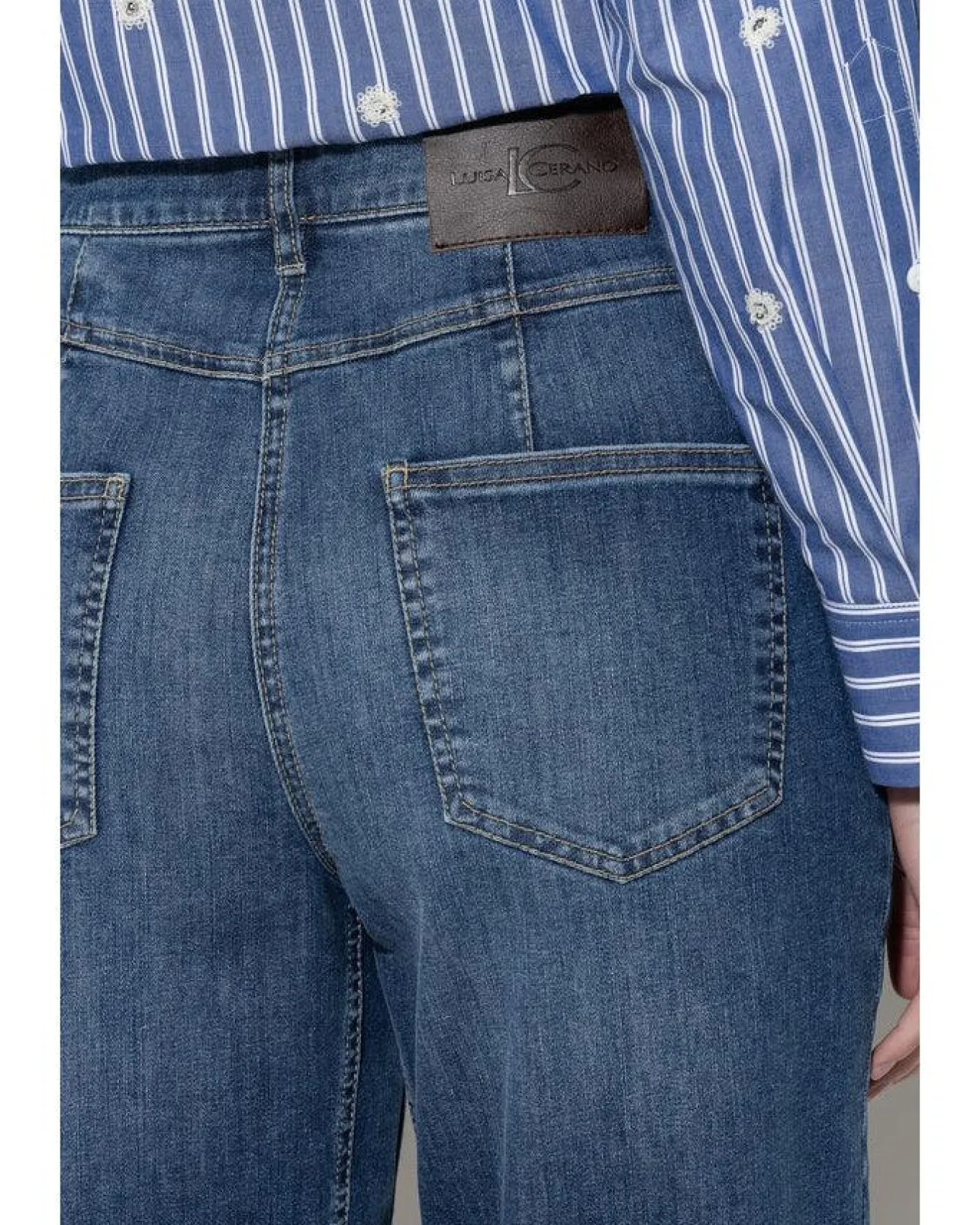 Luisa Cerano loose fit high stretch cropped denim jeans with classic 5 pocket styling, vintage effects, dividing seams and open hem details, button and zip closure.
