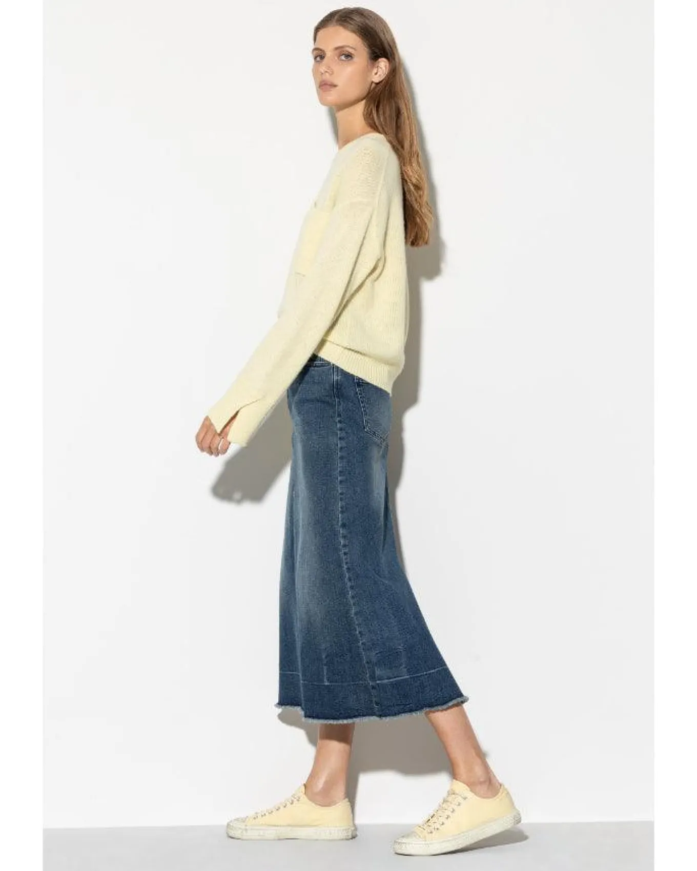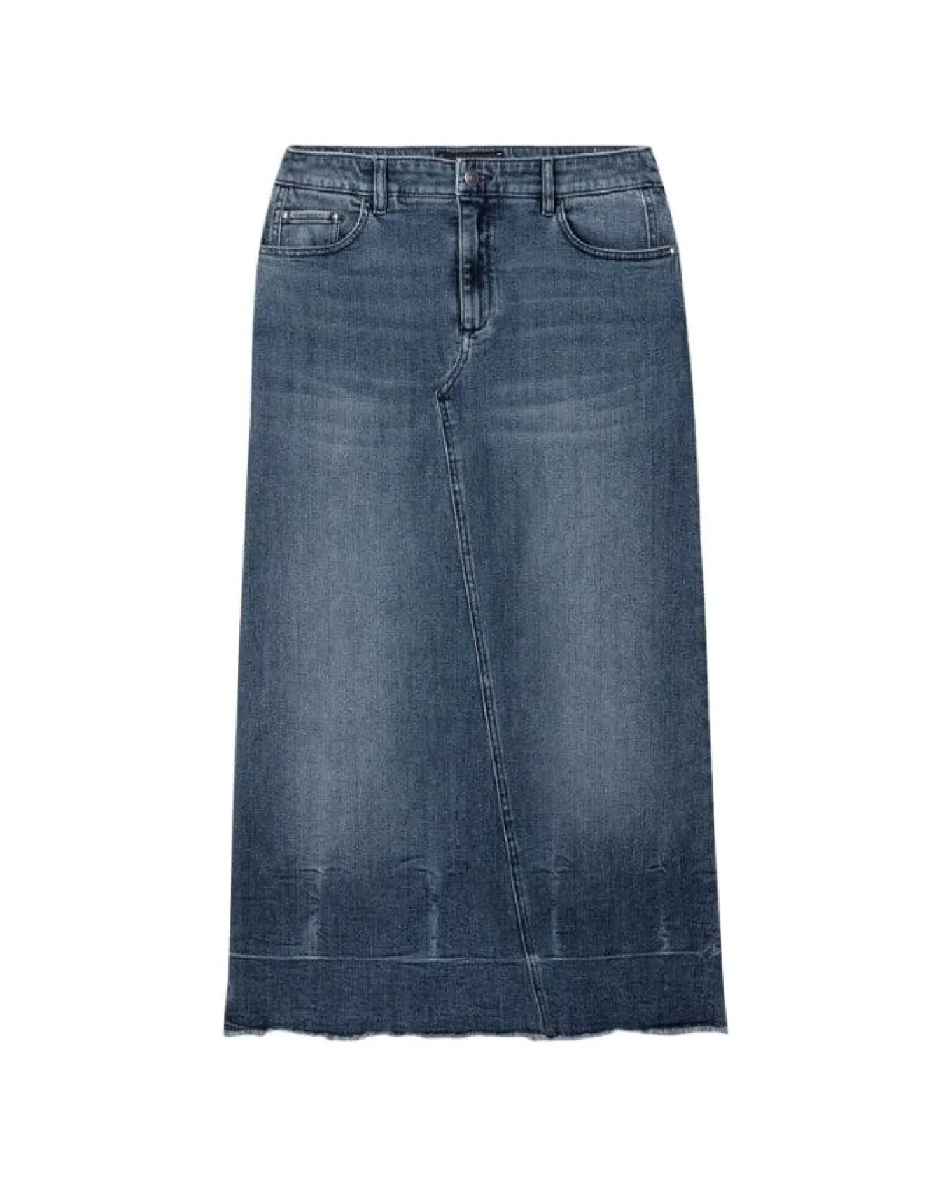 Luisa Cerano long skirt in authentic stretch denim with a subtle used wash and an open hem with short fringes. The skirt has a classic five-pocket design and features asymmetric seams on the front and back and a long slit.
