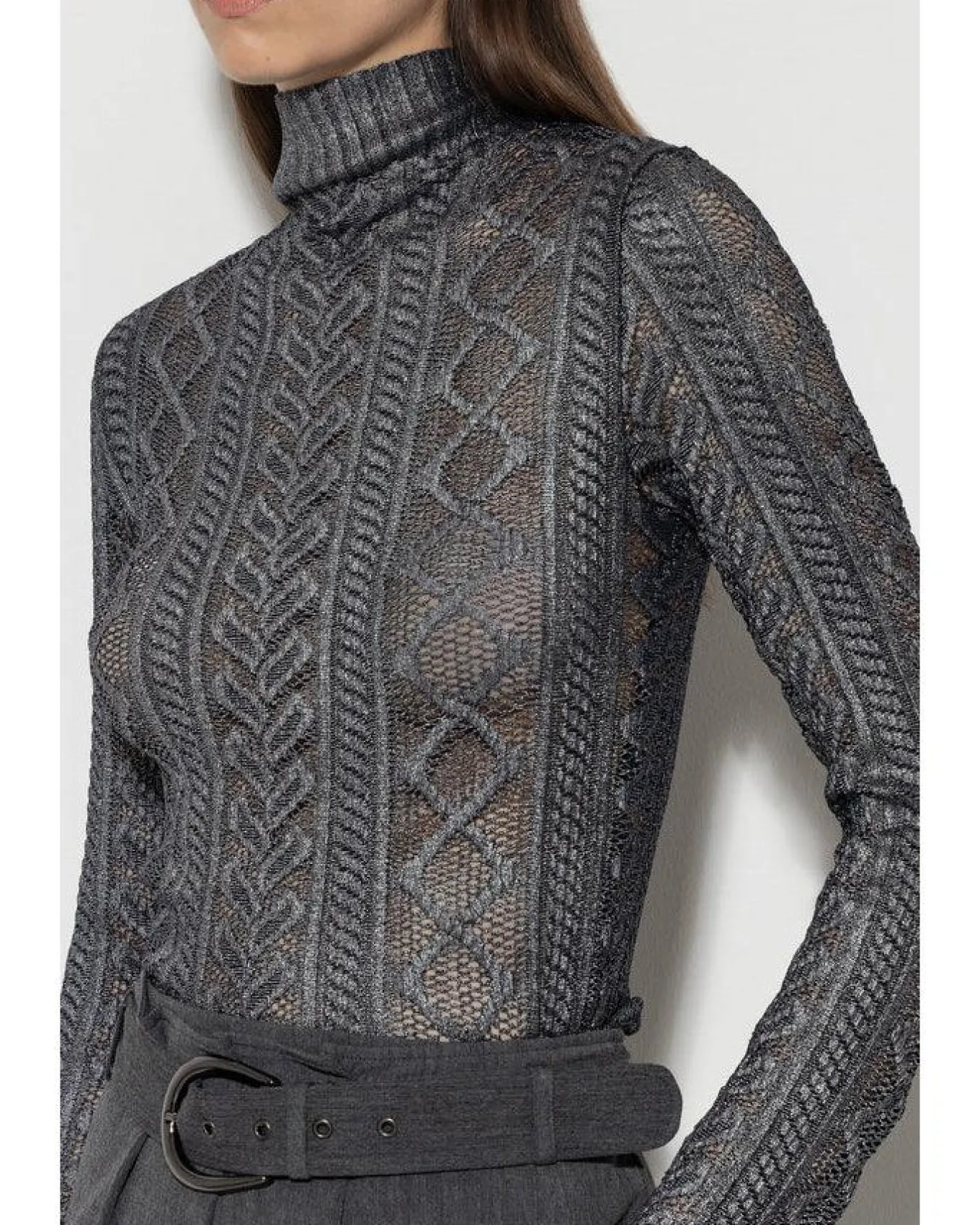 Luisa Cerano semi-sheer stretch lace knit mix pattern pullover with a coating of shiny metallic foil, mock neck collar and ruffled rolled hem.