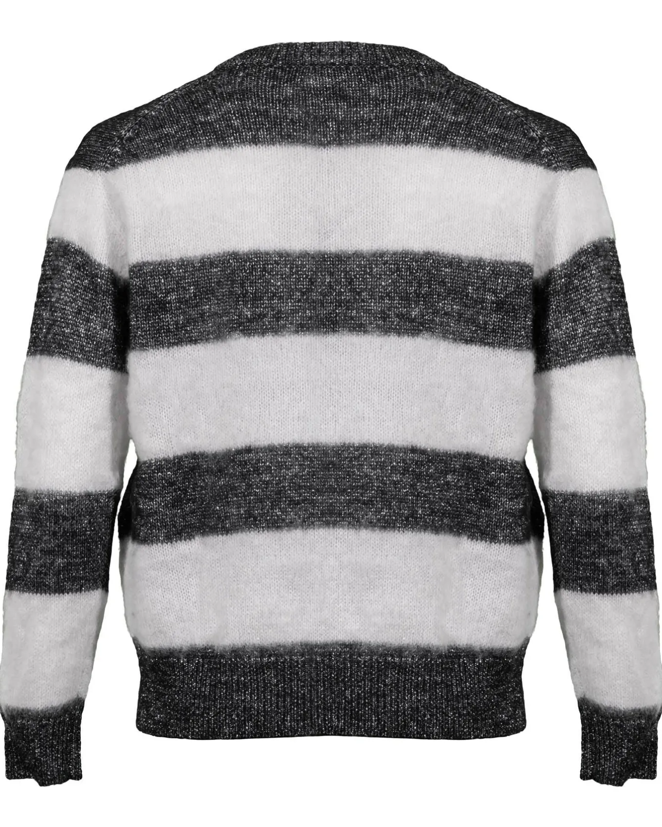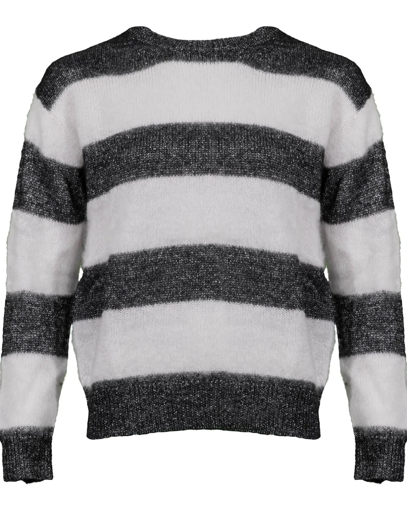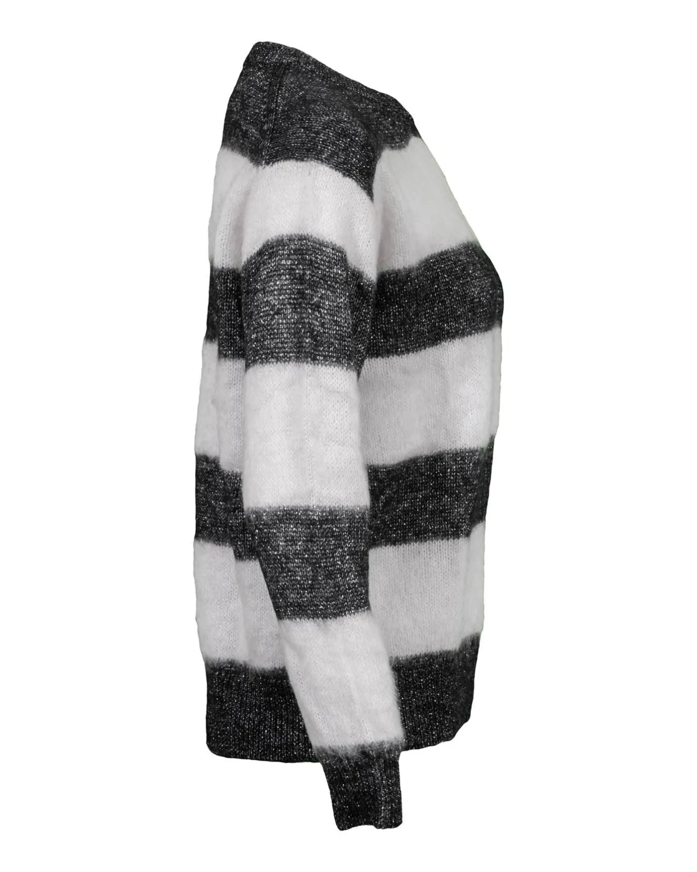 Long sleeve wool mohair blend wide stripe crew neck pullover with metallic thread in the black stripes