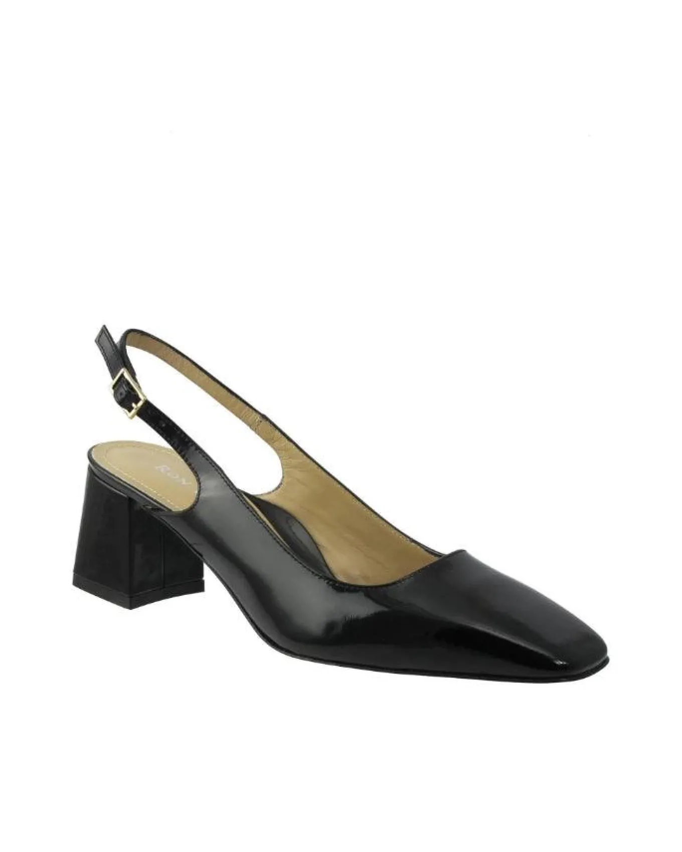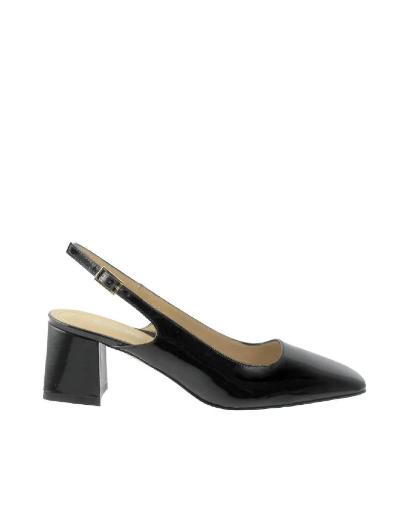 Italian soft patent leather sling back pump with square toe, adjustable buckle ankle strap, arch support, double padding and 2 1/4″ block heel