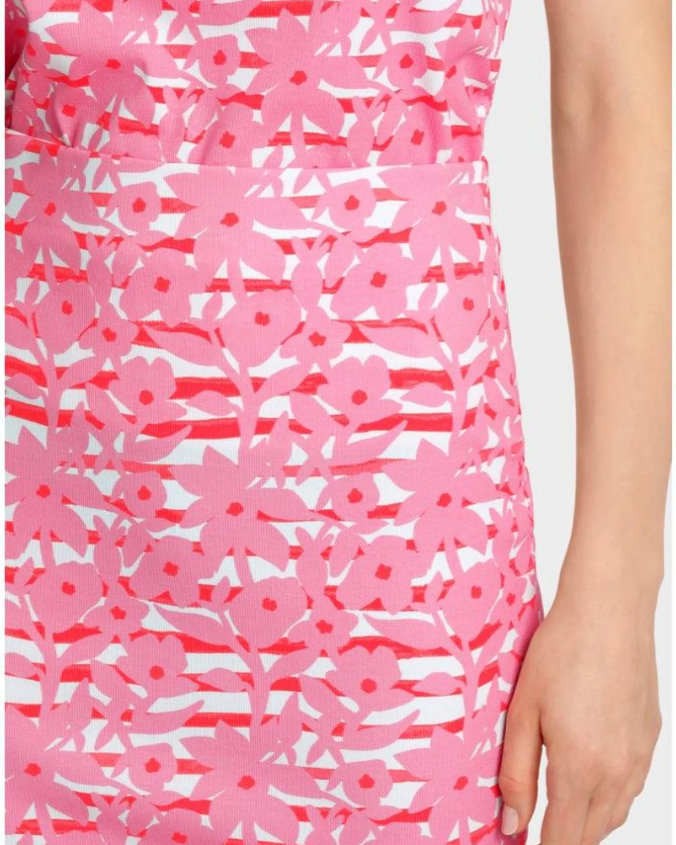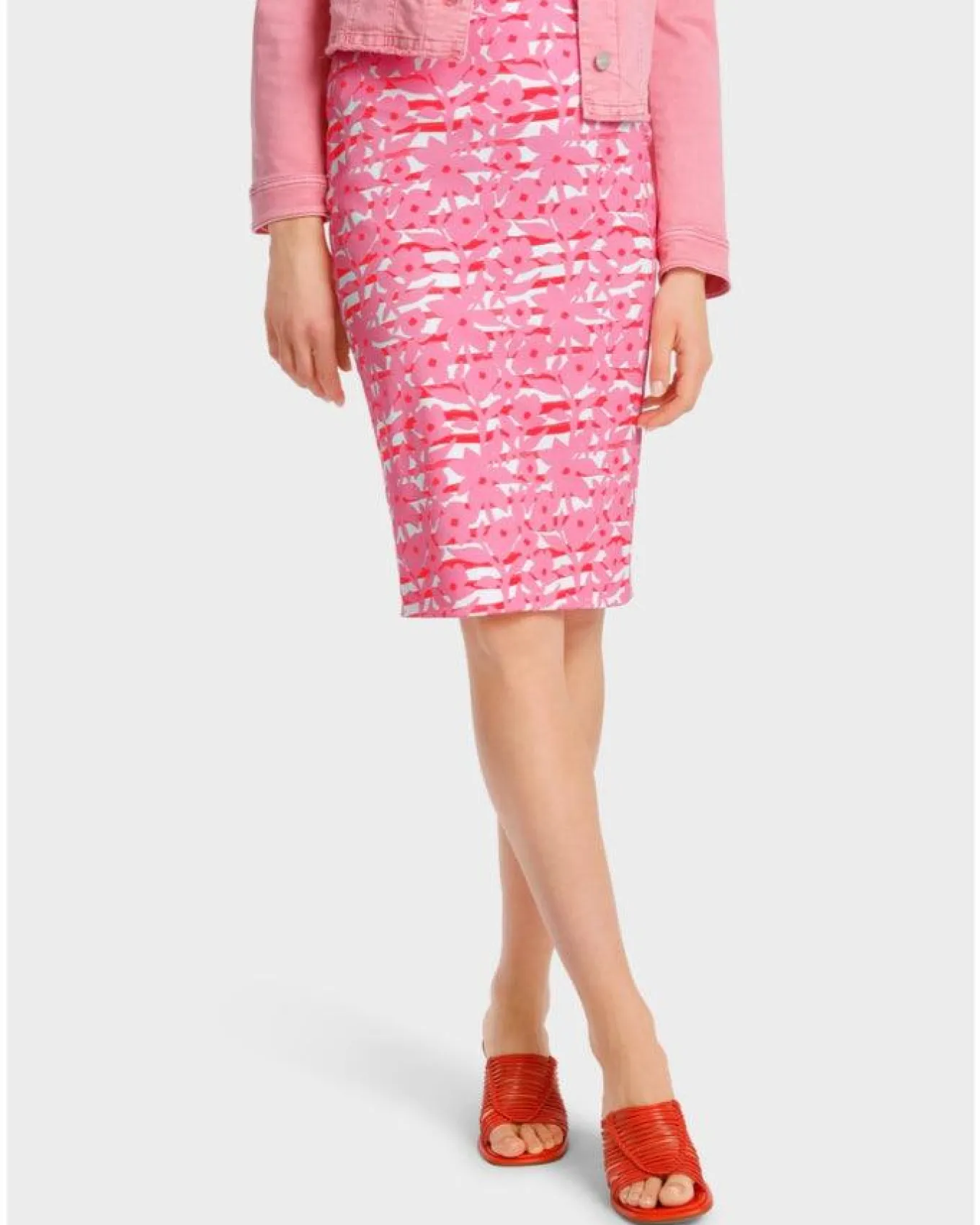 Marc Cain close fitting stretchy cotton rib pencil skirt has no fastening and a high, inner waistband. It is lined and creates a perfect contour. The wow effect is the overprint, in which a brushstroke stripe is overlaid with a stylized floral motif.