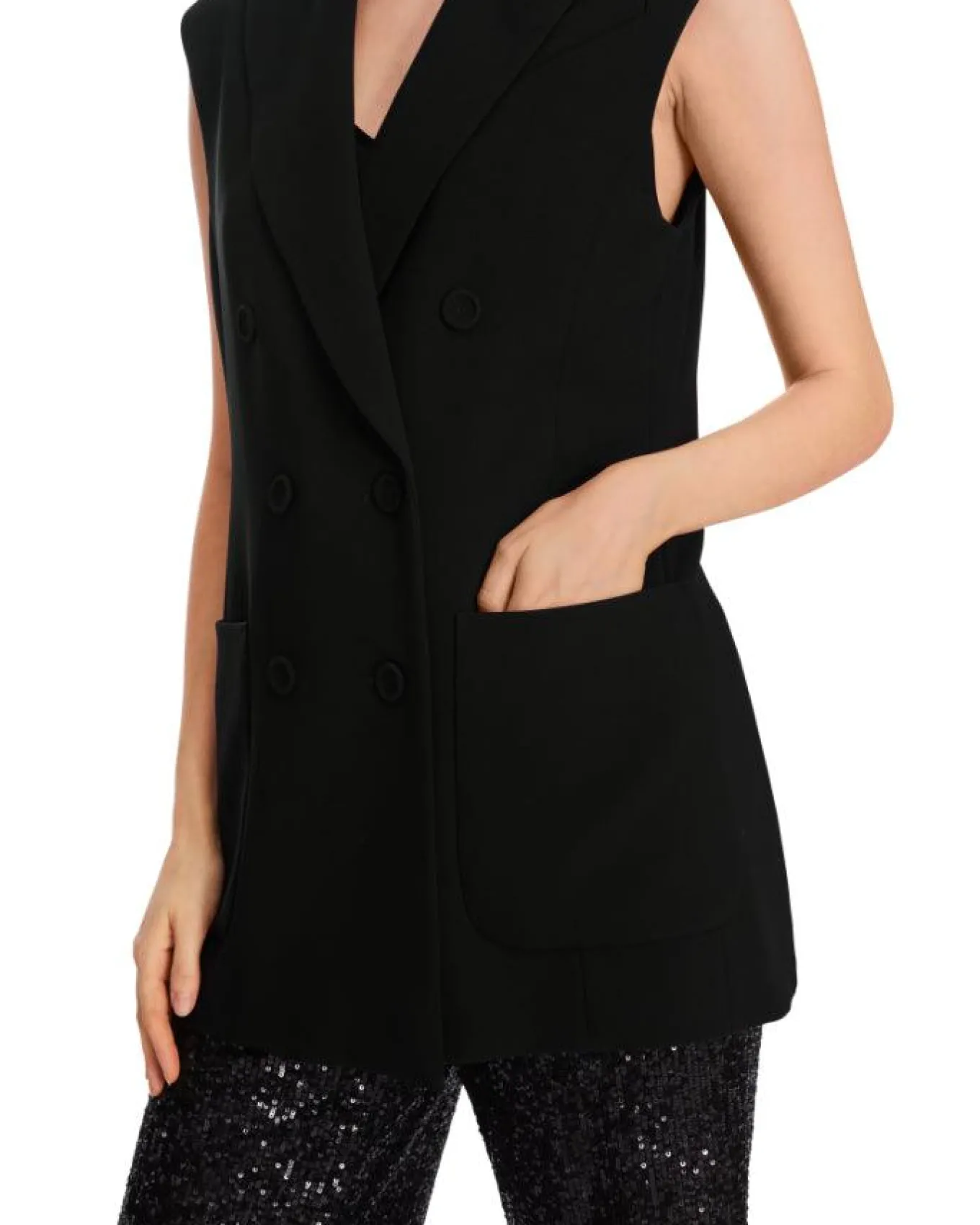 Marc Cain figure shaping fit, soft crepe double breasted vest looks great worn solo. Features rising lapel, patch pockets, left breast pocket and back slit offers freedom of movement.
