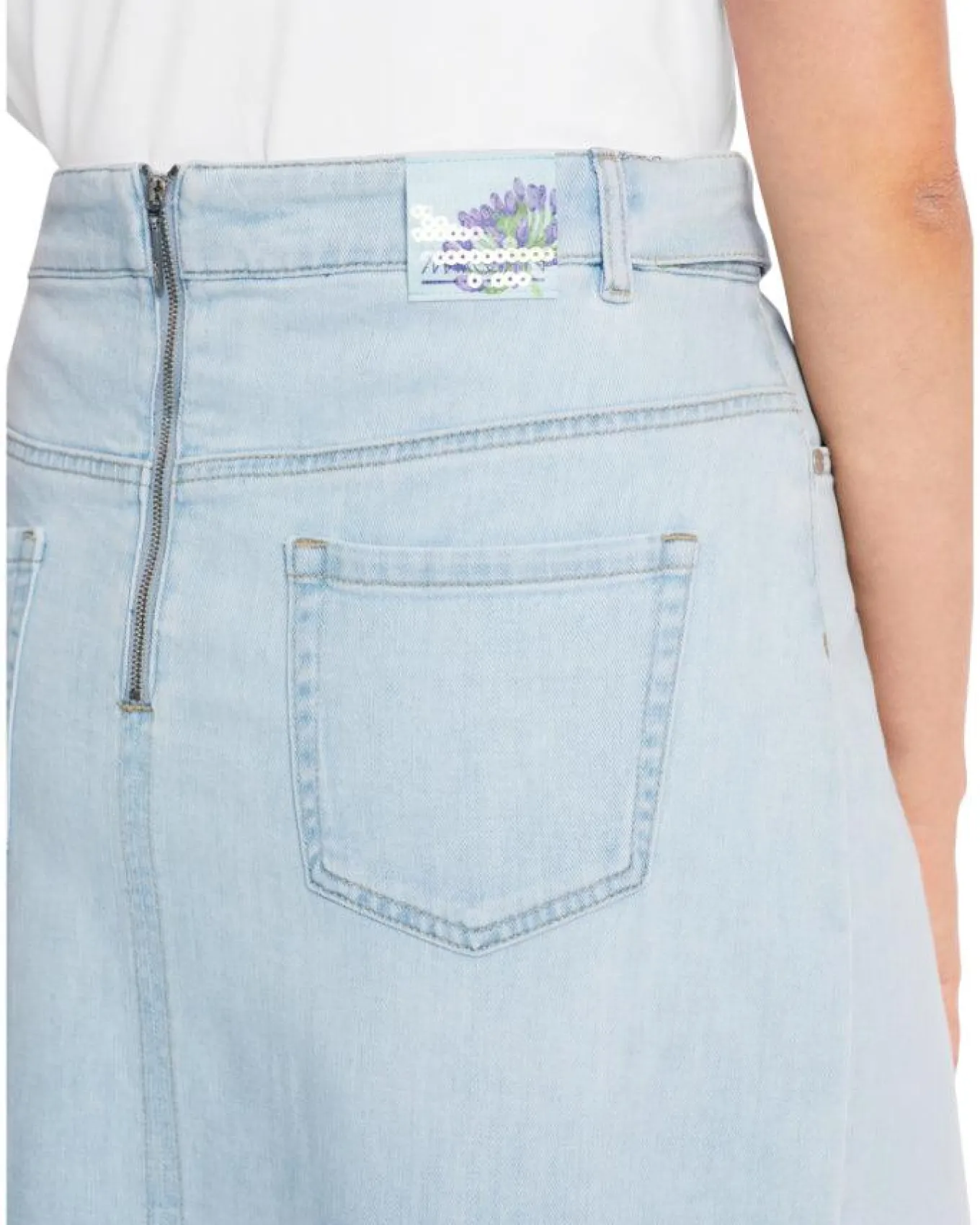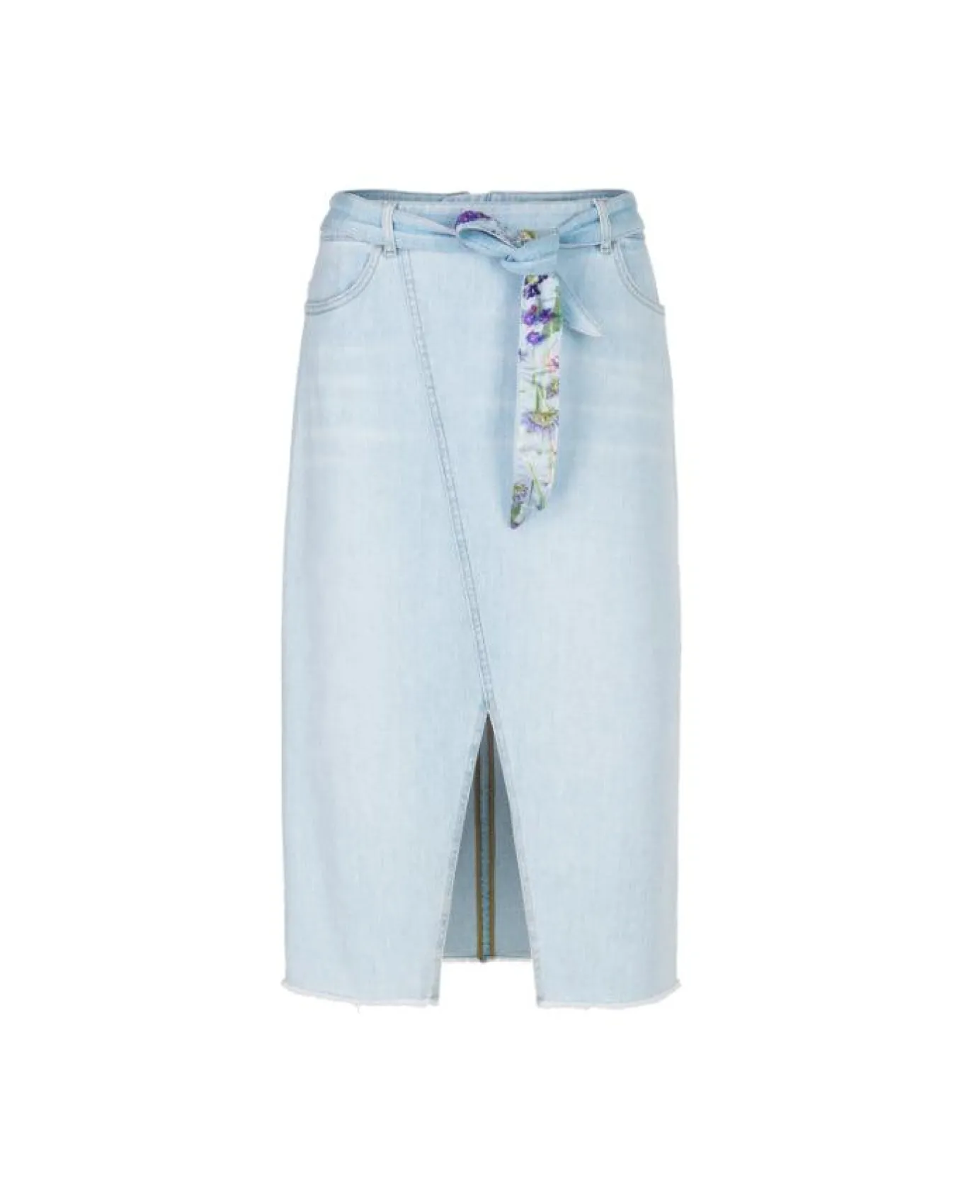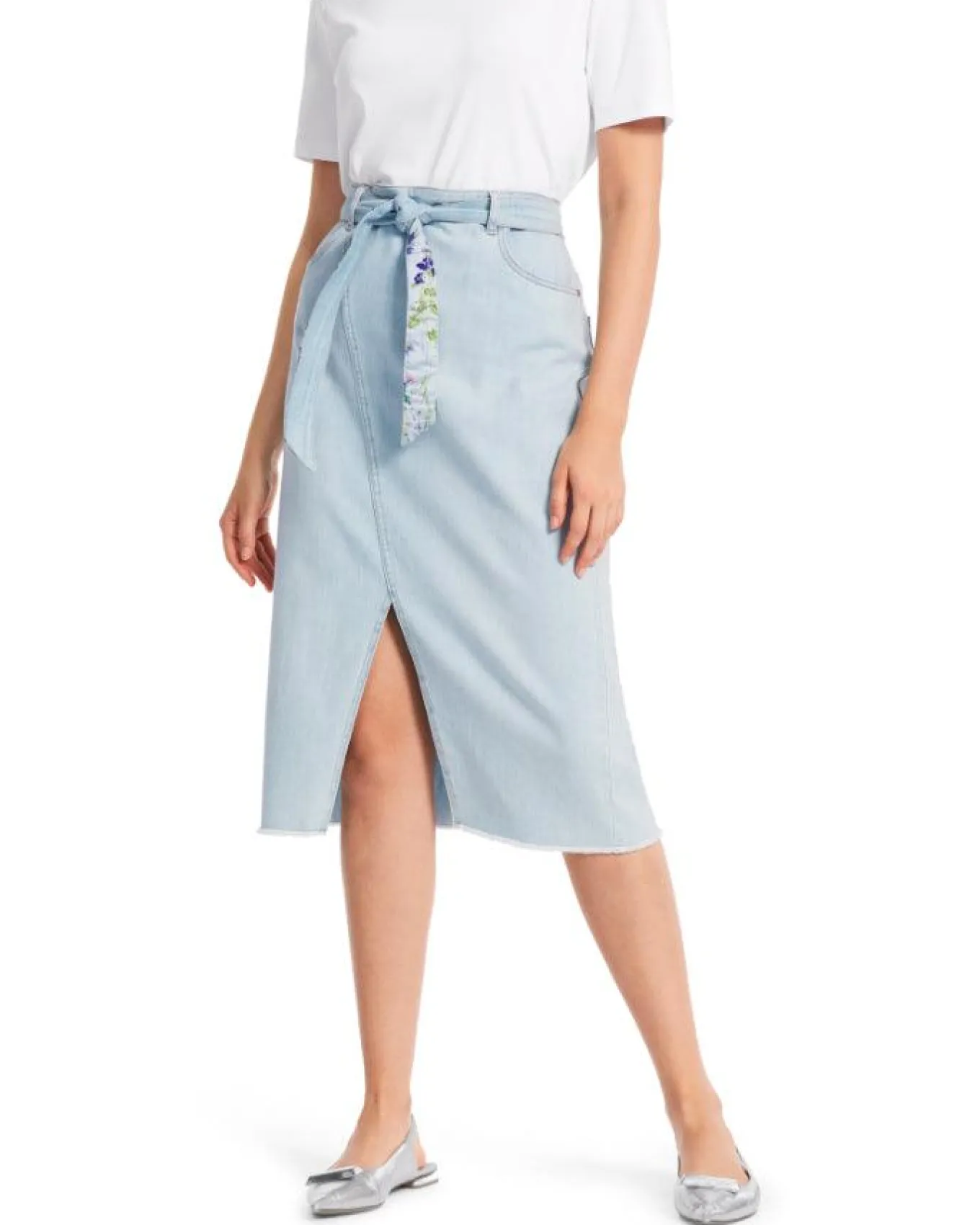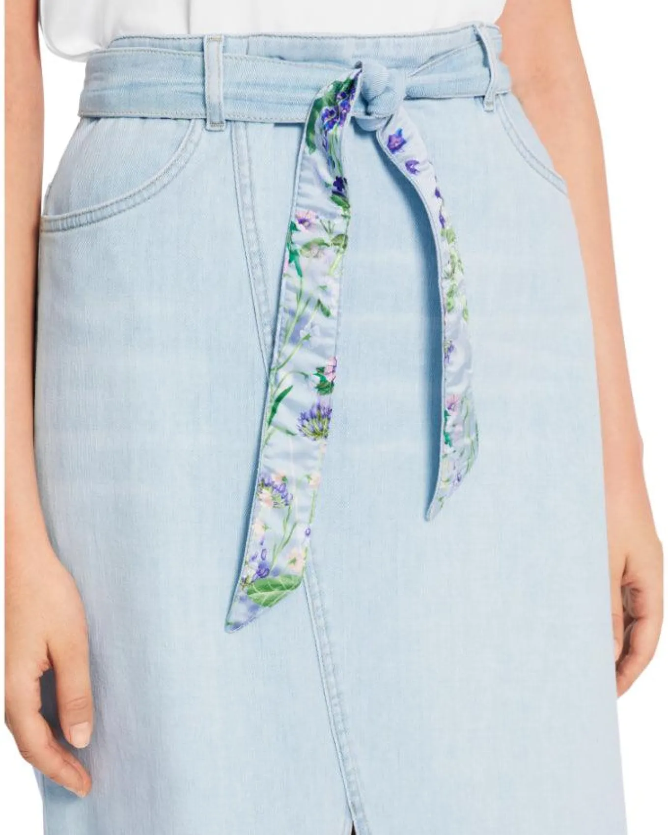 Marc Cain close fitting denim skirt features a front slit and a diagonal dividing seam. The pockets and double-stitched seams emphasize the typical jeans look. A belt with a floral print adds a playful touch. The midi length skirt is fastened with a back zip.