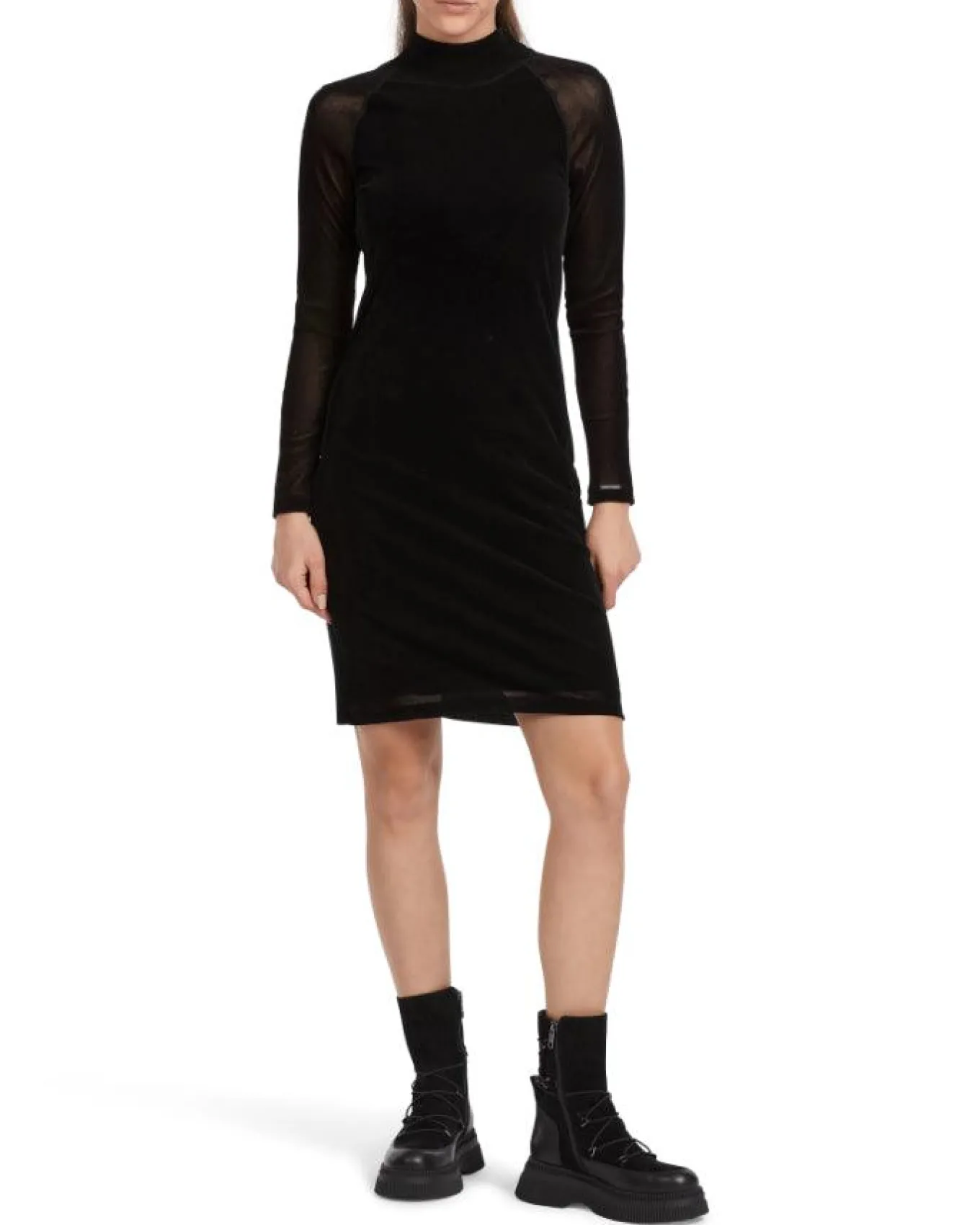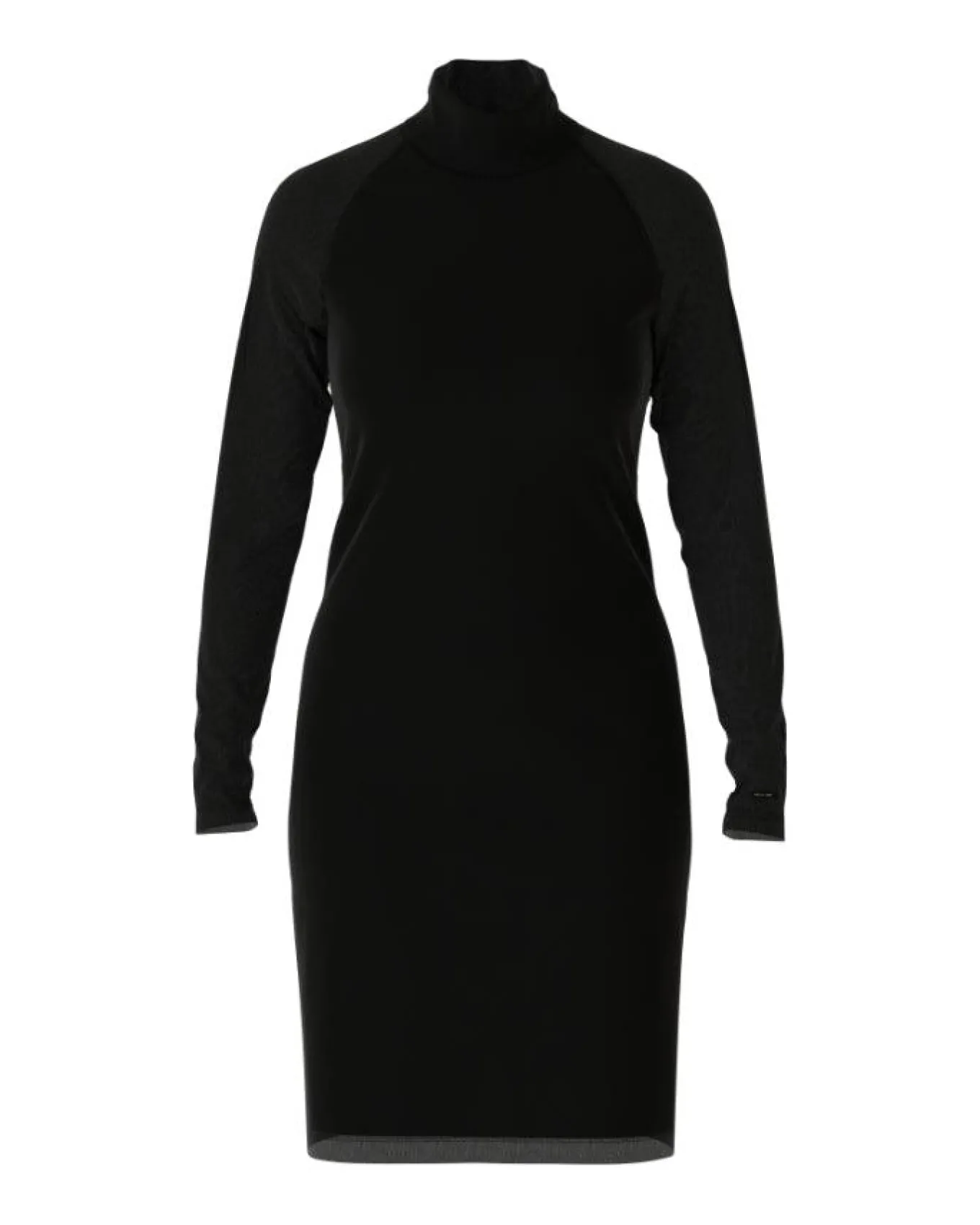 Figure hugging sporty look dress with sheer raglan sleeves, high neck, mesh details, Size 3 – Length 99cm.