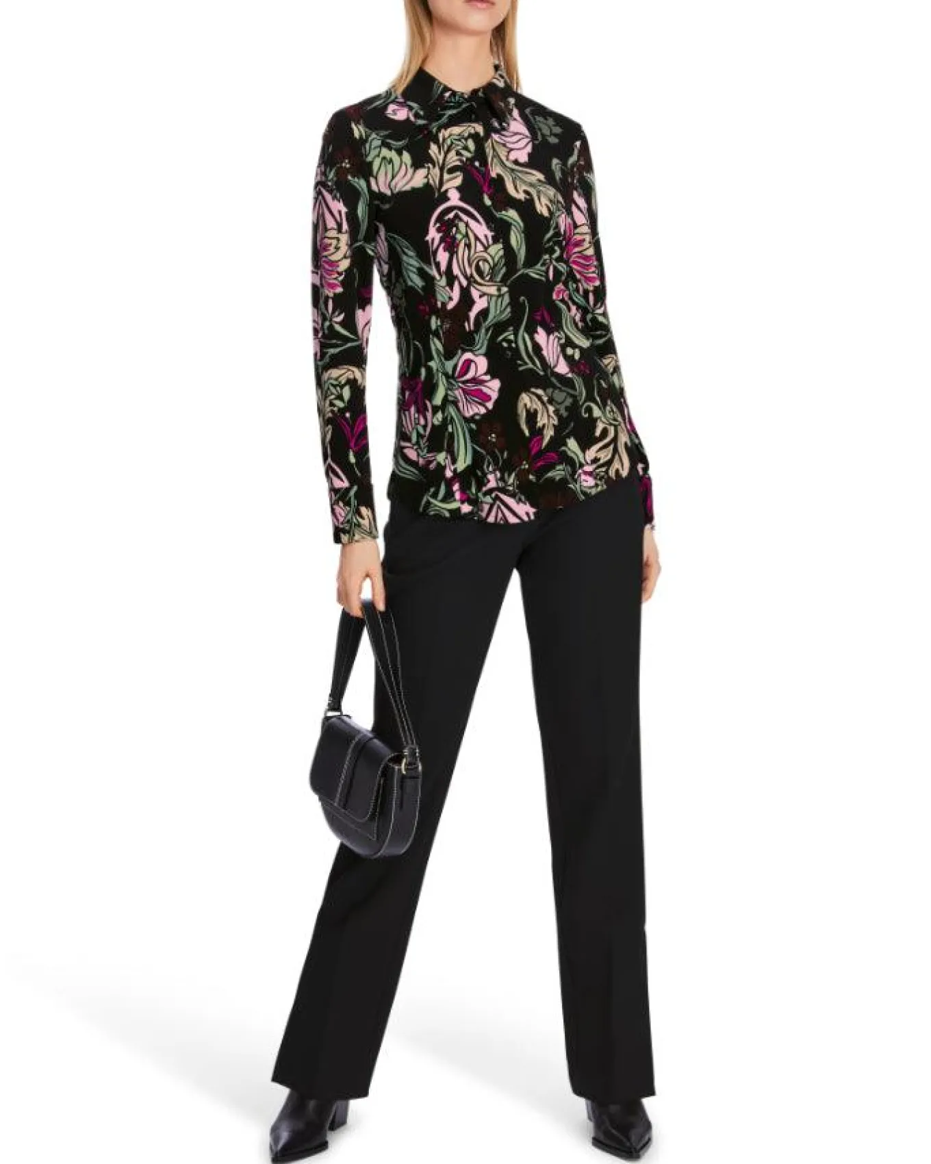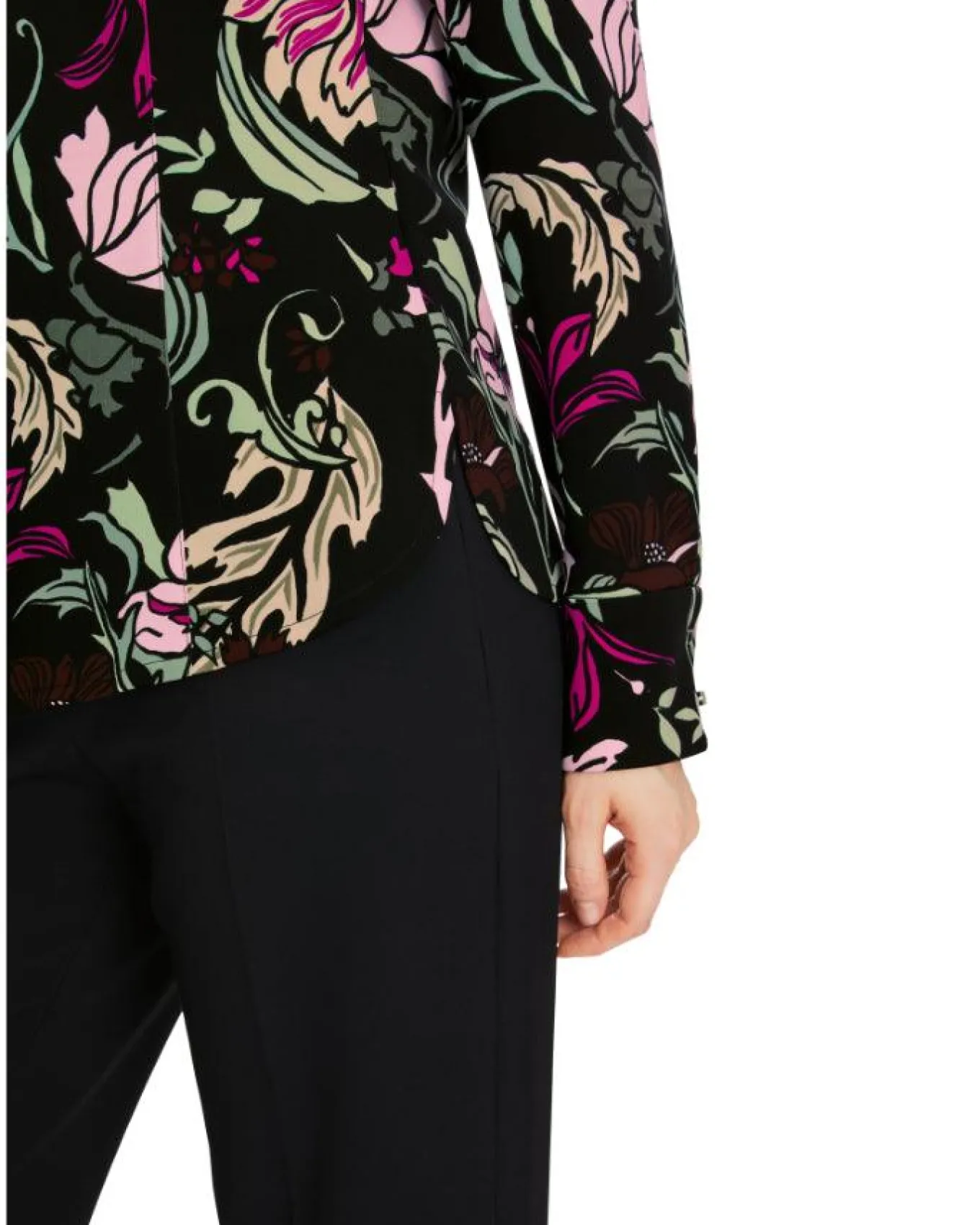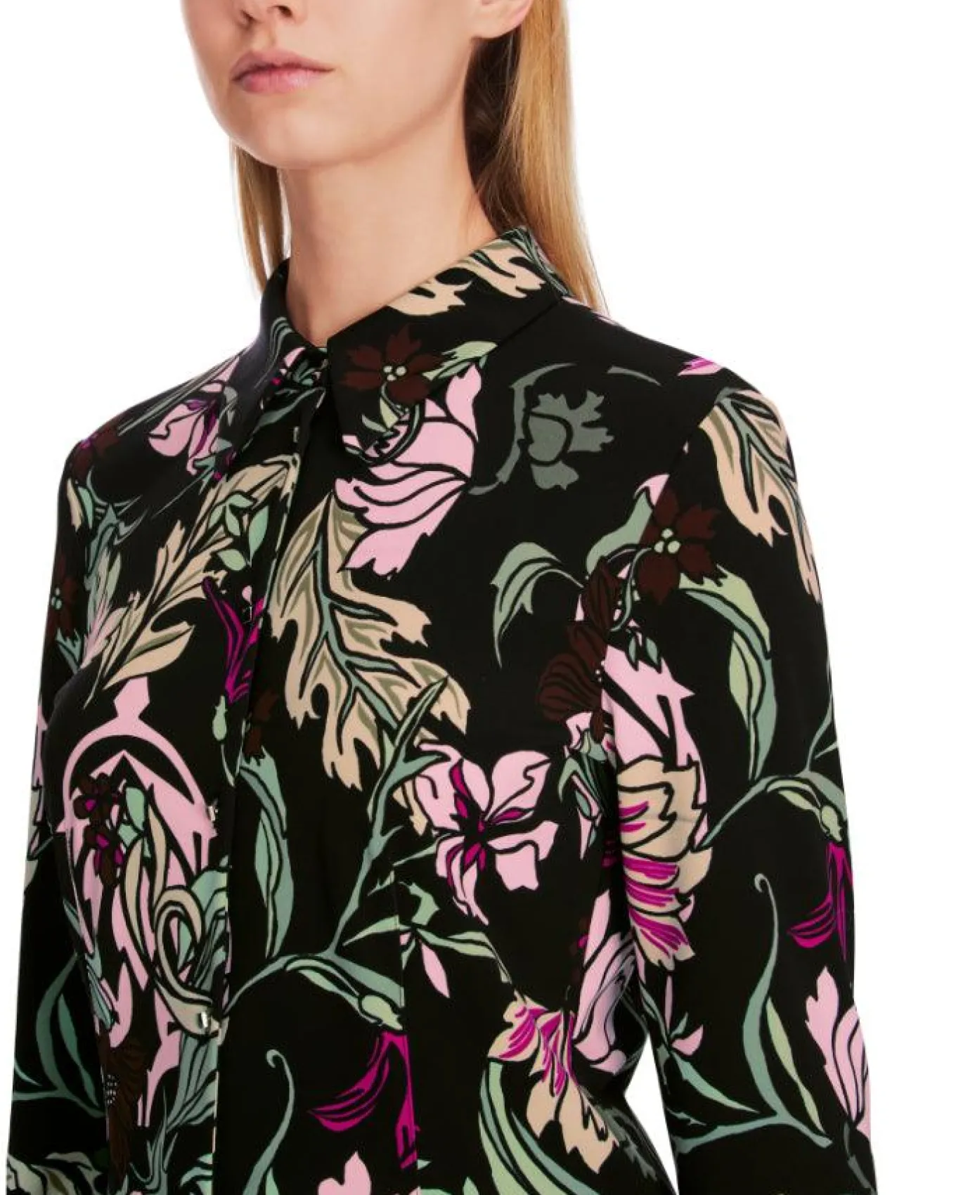 Marc Cain luxurious stretch fabric floral print shirt features traditional shirt styling with a collar, long sleeves with button cuffs, and button front closure.