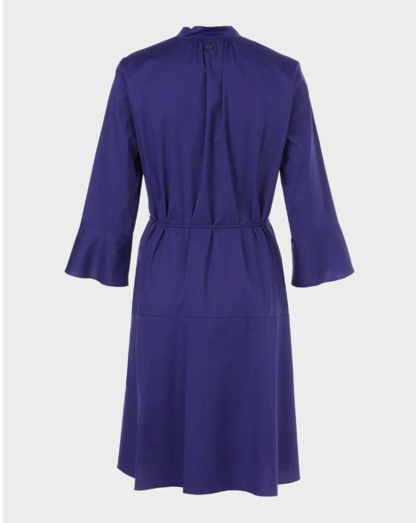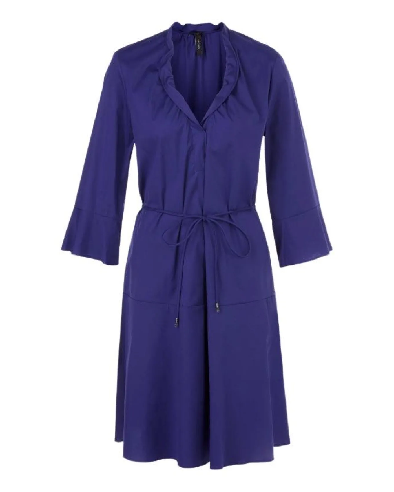 Marc Cain summery lightweight cotton blend dress with flounce 3/4 sleeves, v-shape ruffle neckline, loose silhouette fastened with tie belt.