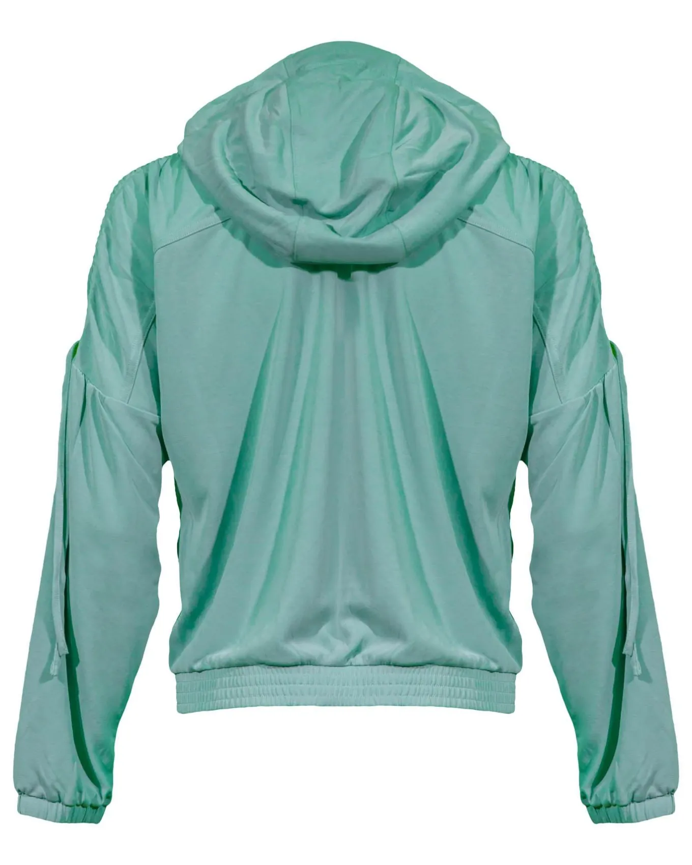 Casual fit ultra soft modal blend flowing hooded jacket with gathered details and stretchy cuffs on the sleeves, inset pockets and two-way zip closure