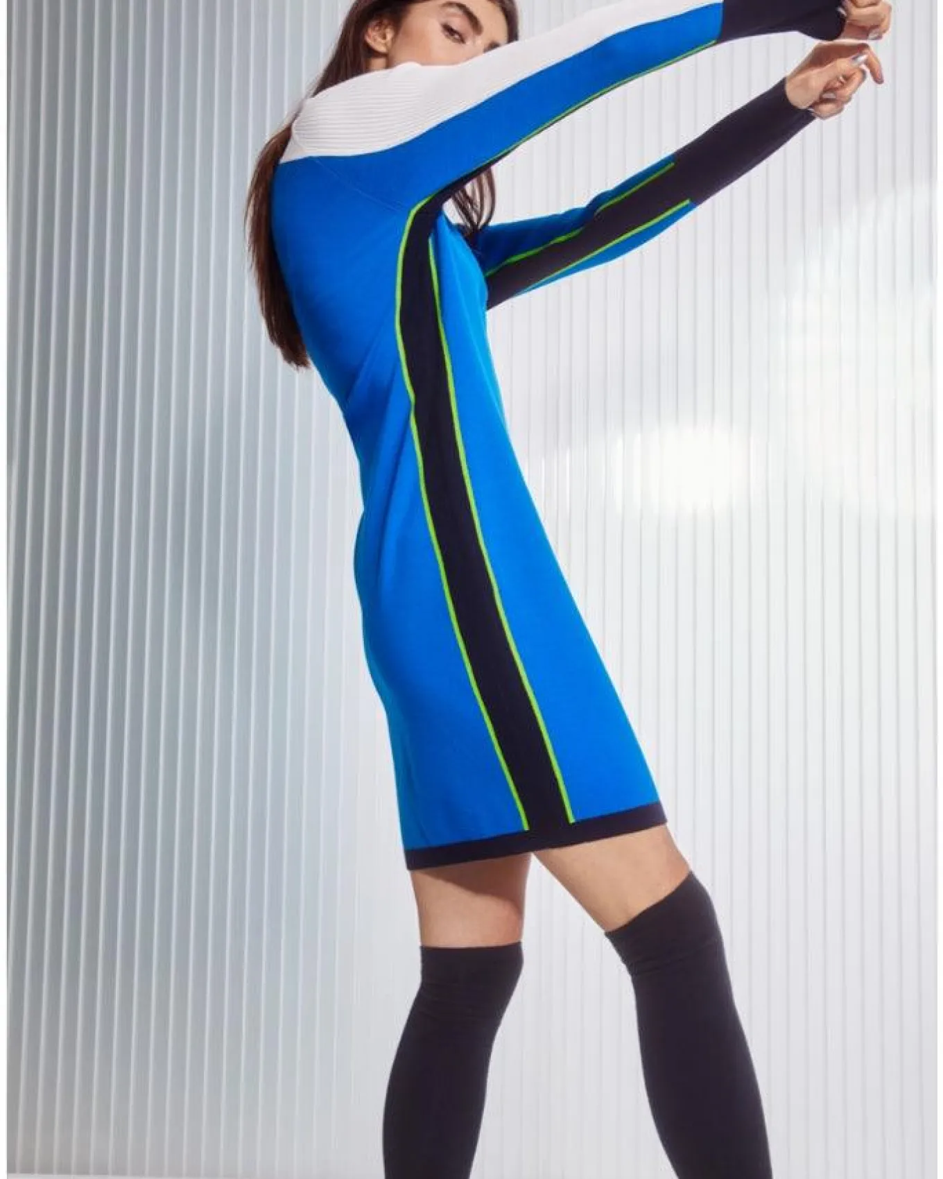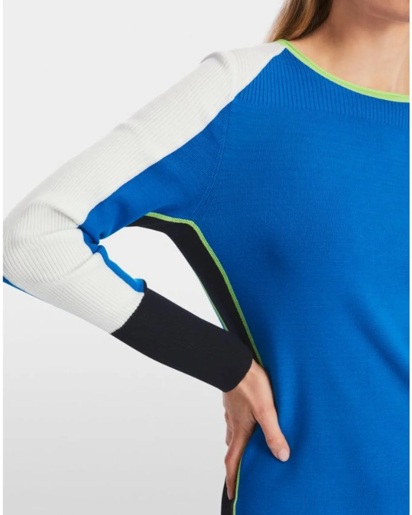 Marc Cain close fitting, soft viscose blend knitted mini dress with vertical color distribution and the vibrant colors of the overlock seams and rolled hem at the neckline create a striking effect. The shoulder area and sleeve inserts are ribbed.