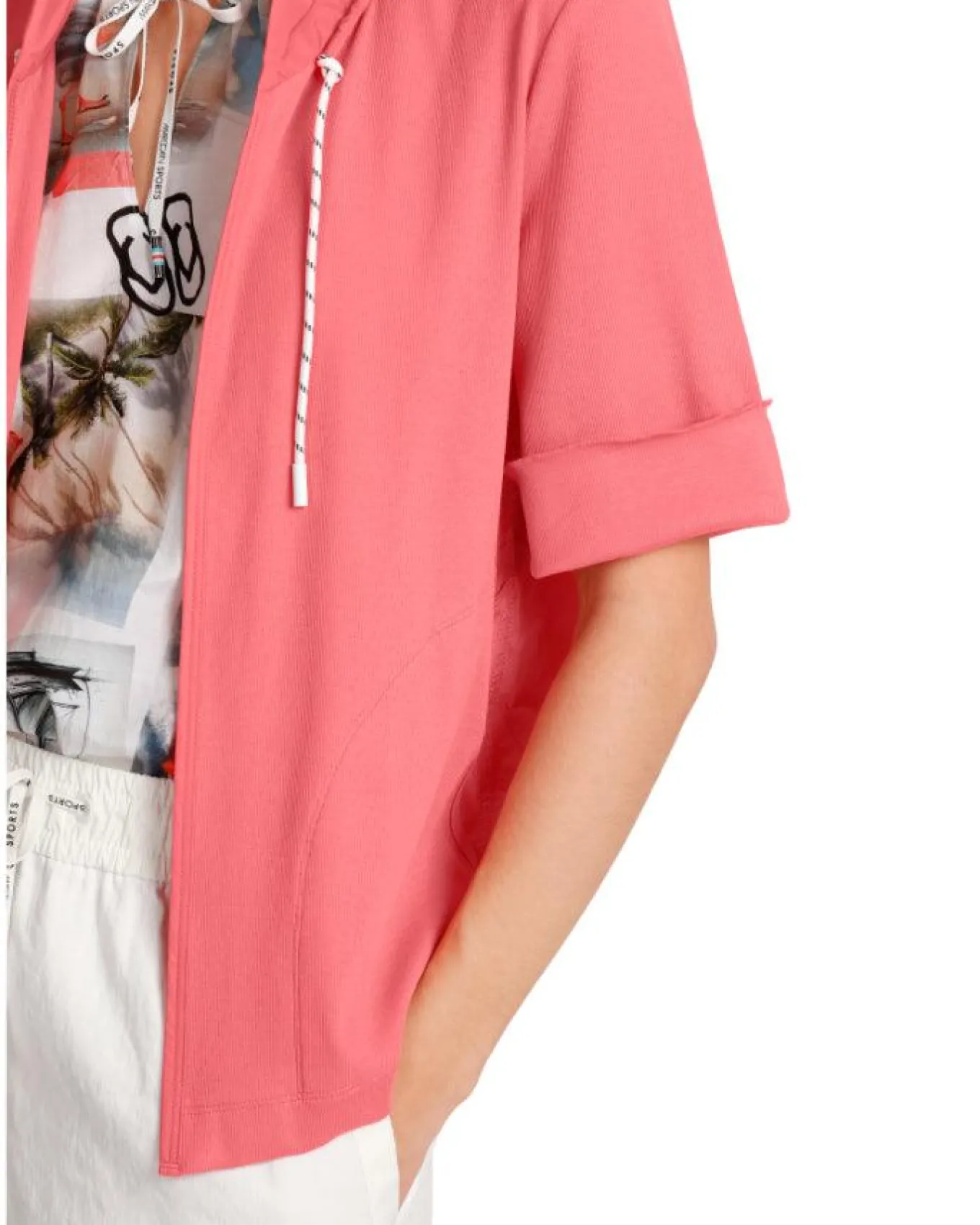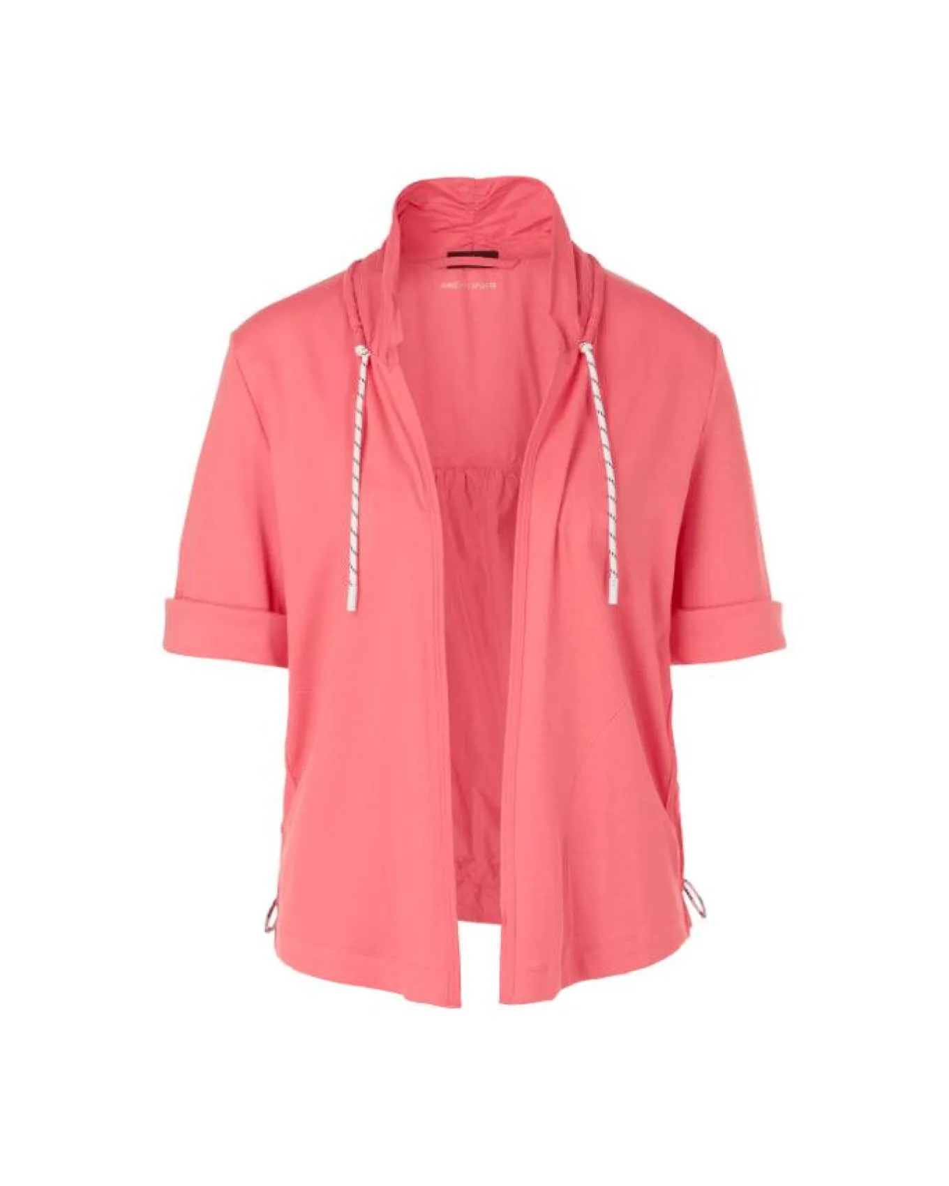 Marc Cain jacket features a sporty blend of soft stretch cotton and woven material. It has a wide silhouette with half-length sleeves and open front. The round pockets and the sailor cord on the collar emphasize the casual style.