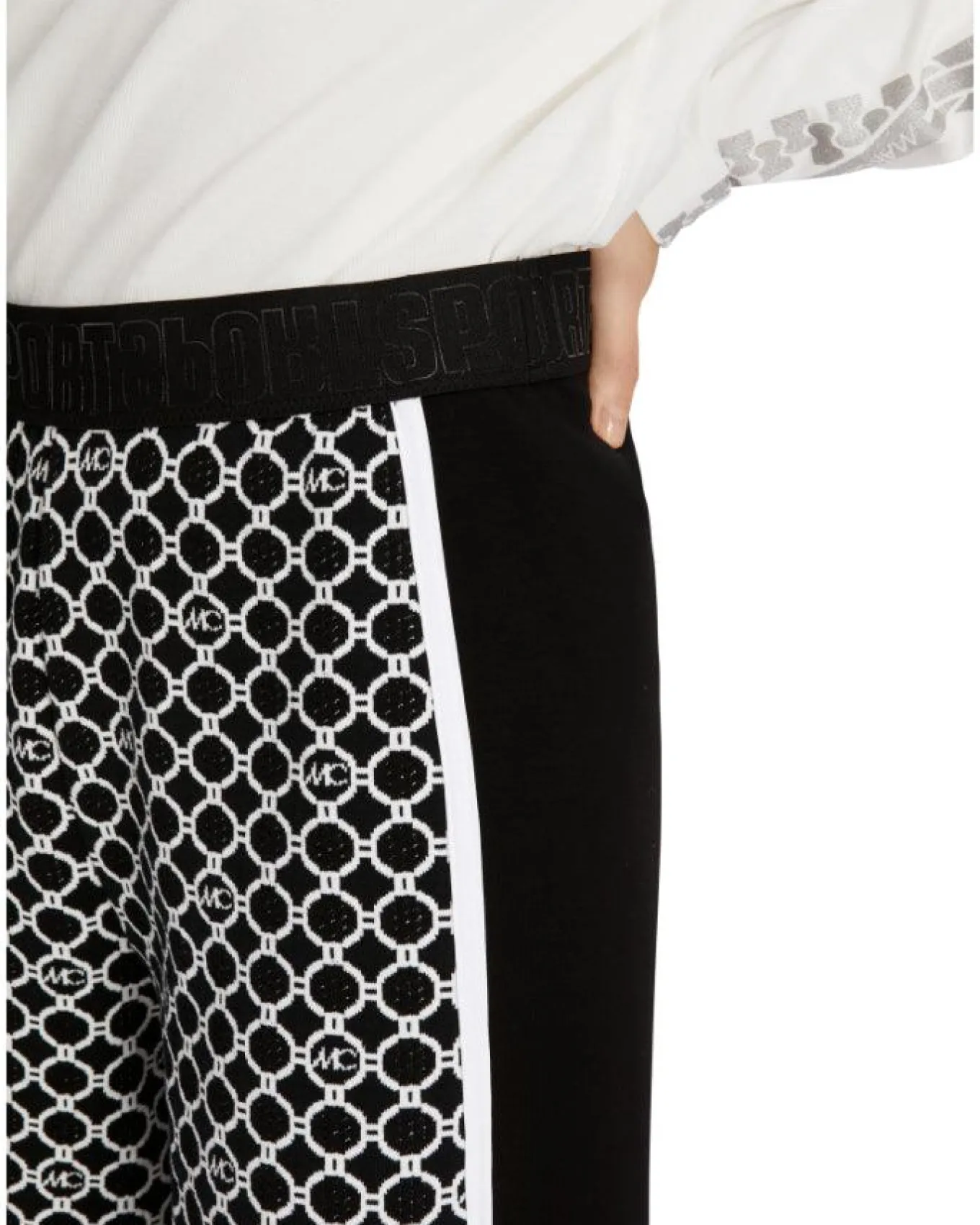 Marc Cain stretchy pull on cropped, flared leg pant with exclusive MC print front panel, solid back, side stripe detail, SPORT embossed elastic waistband.