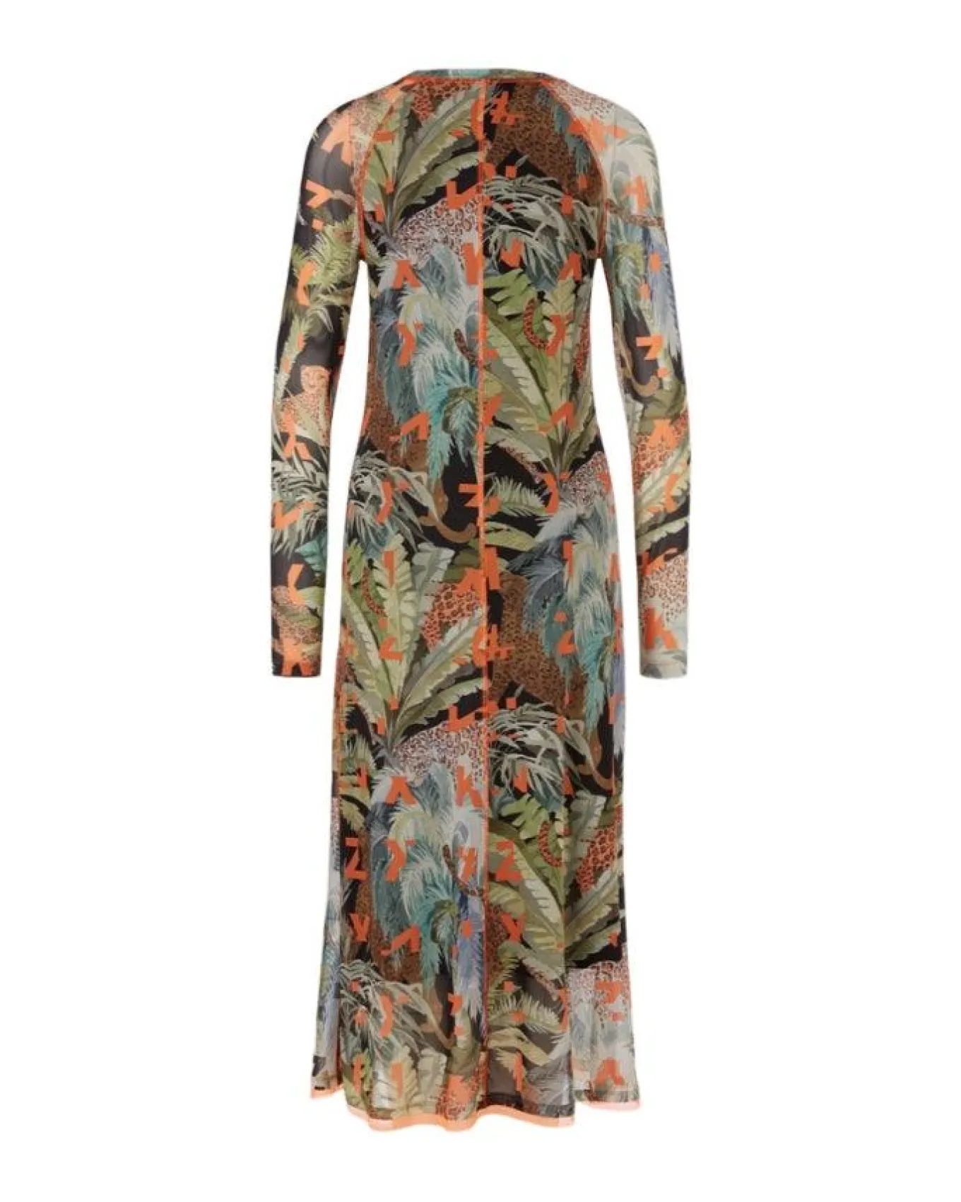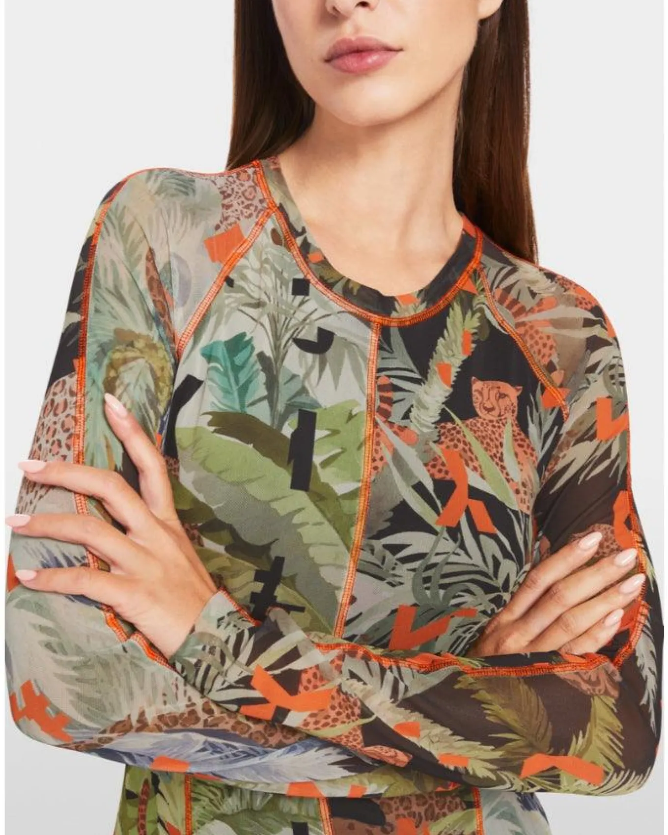 Marc Cain sporty elegant silhouette print dress fits close to the body and flared towards hem with long raglan sleeves. The cut panels and hem are accentuated with fluorine-coloured details. The mesh material is made from stretch jersey and has a plain lining. The design features Marc Cain Leo in a collage of leaves and letters.Length 125cm