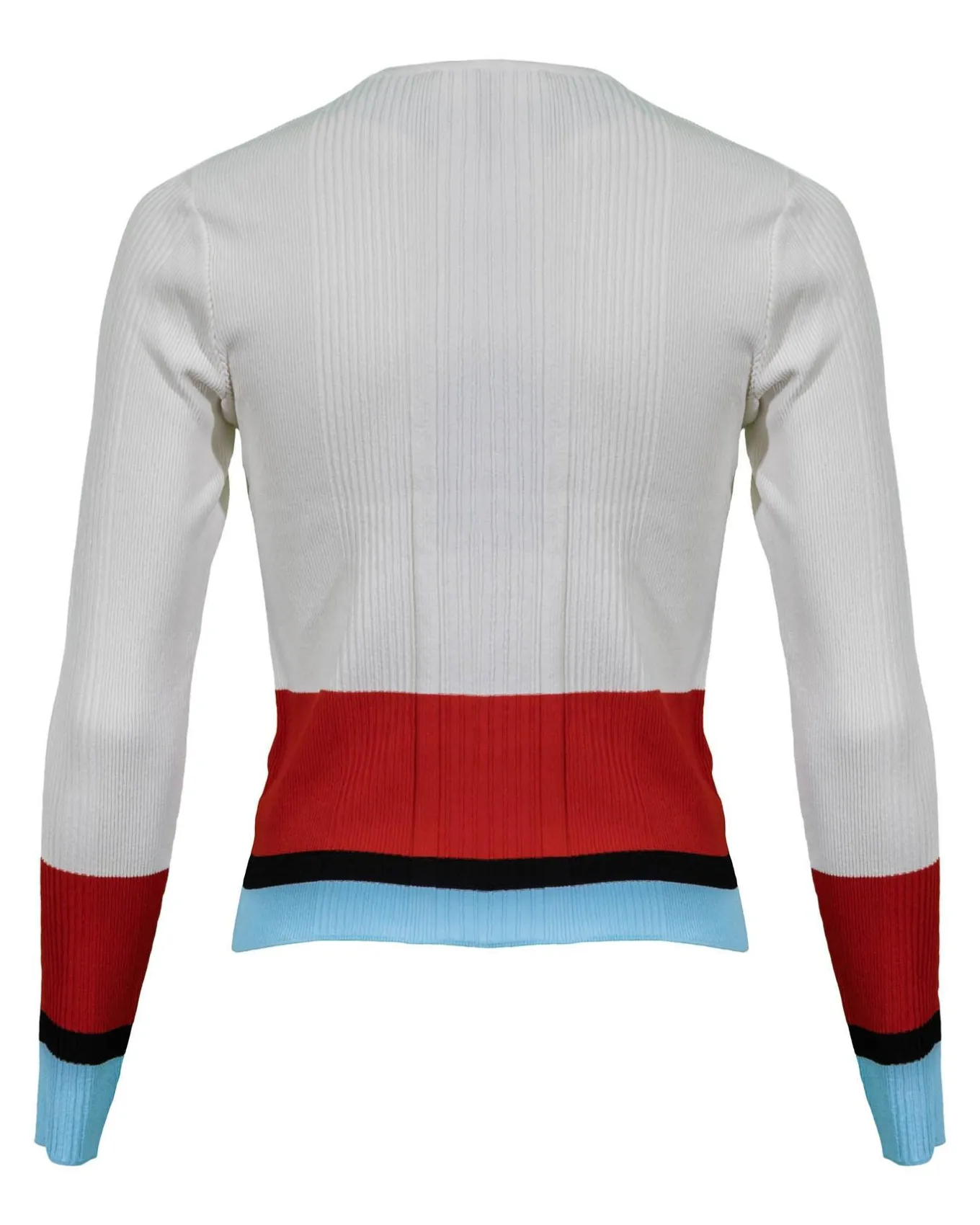 Round neck long sleeve button down caridgan in ribbed texture and color block pattern