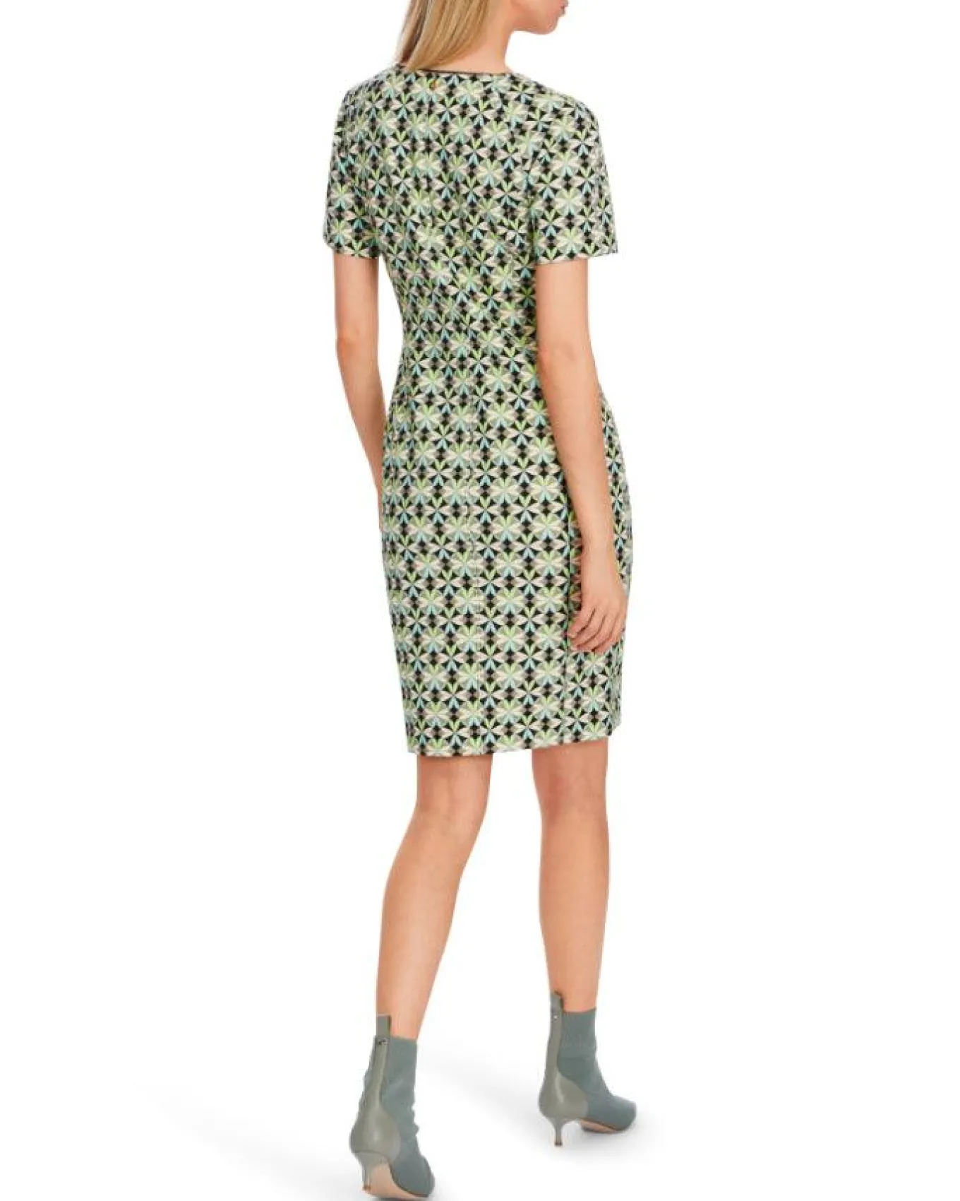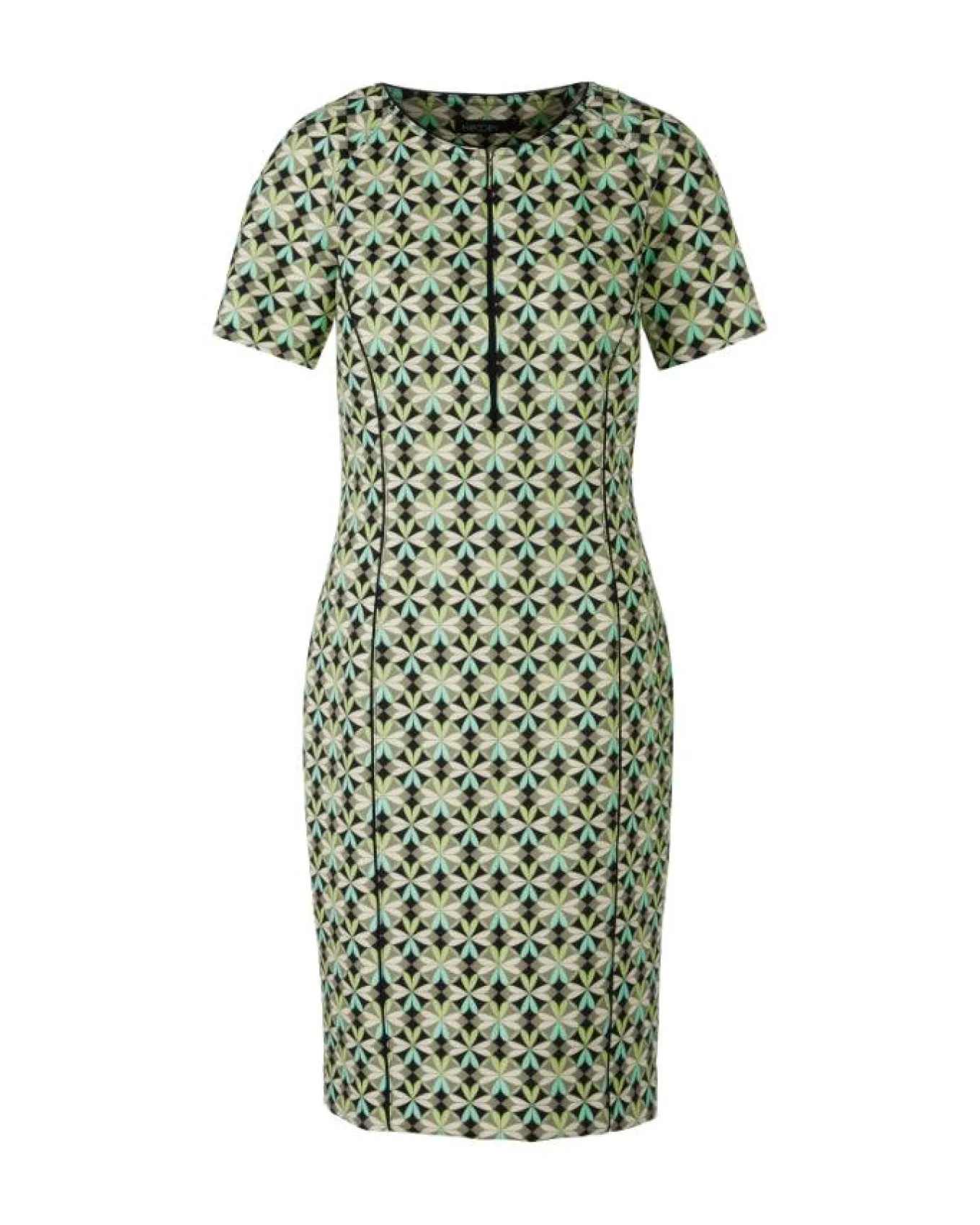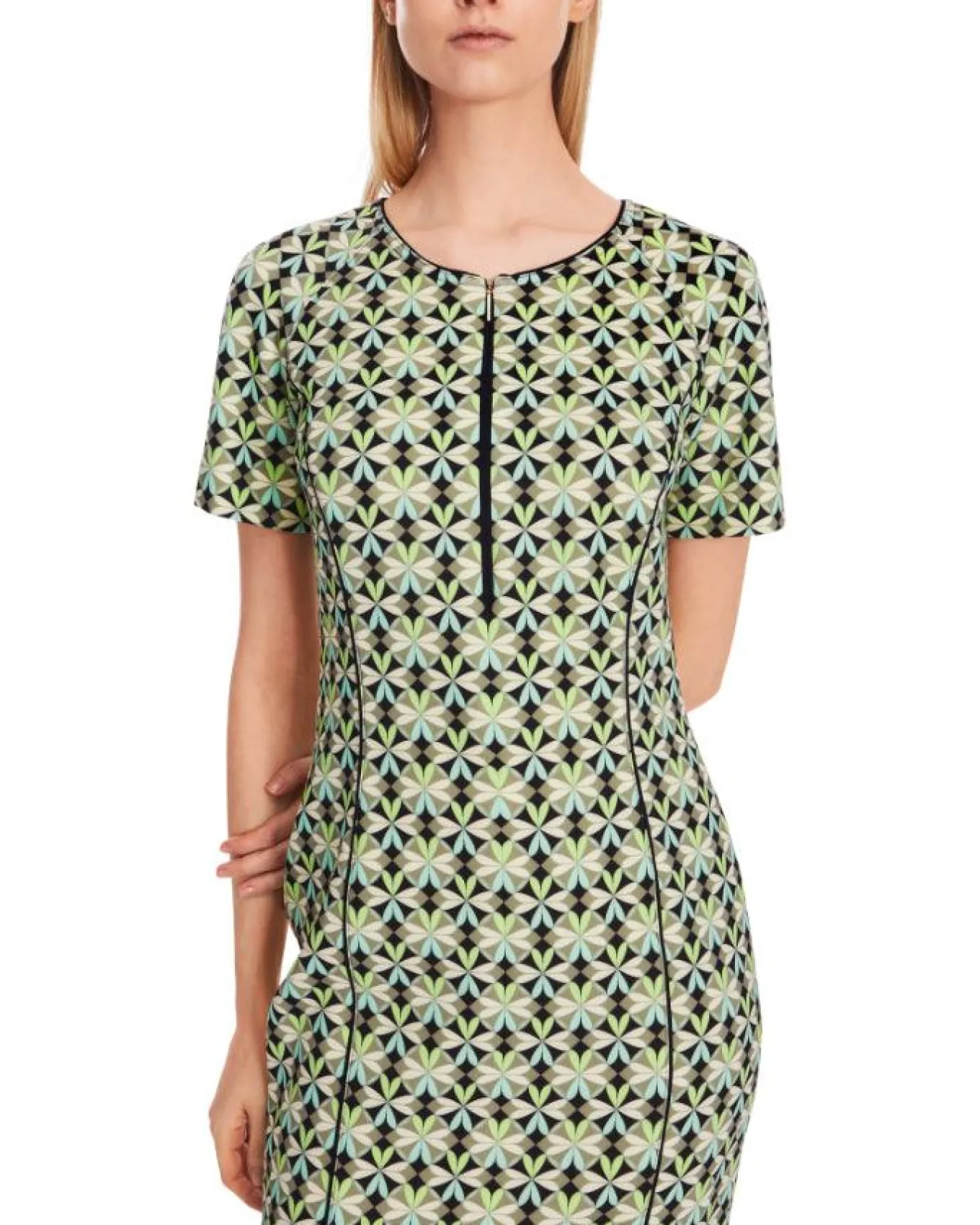 Marc Cain scuba print short sleeve dress features round neck with slit, fitted silhouette, Length 95cm.
