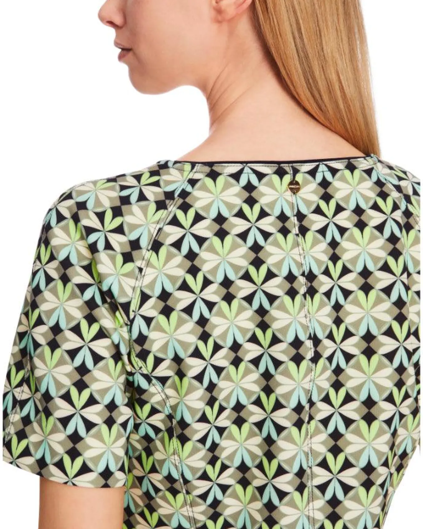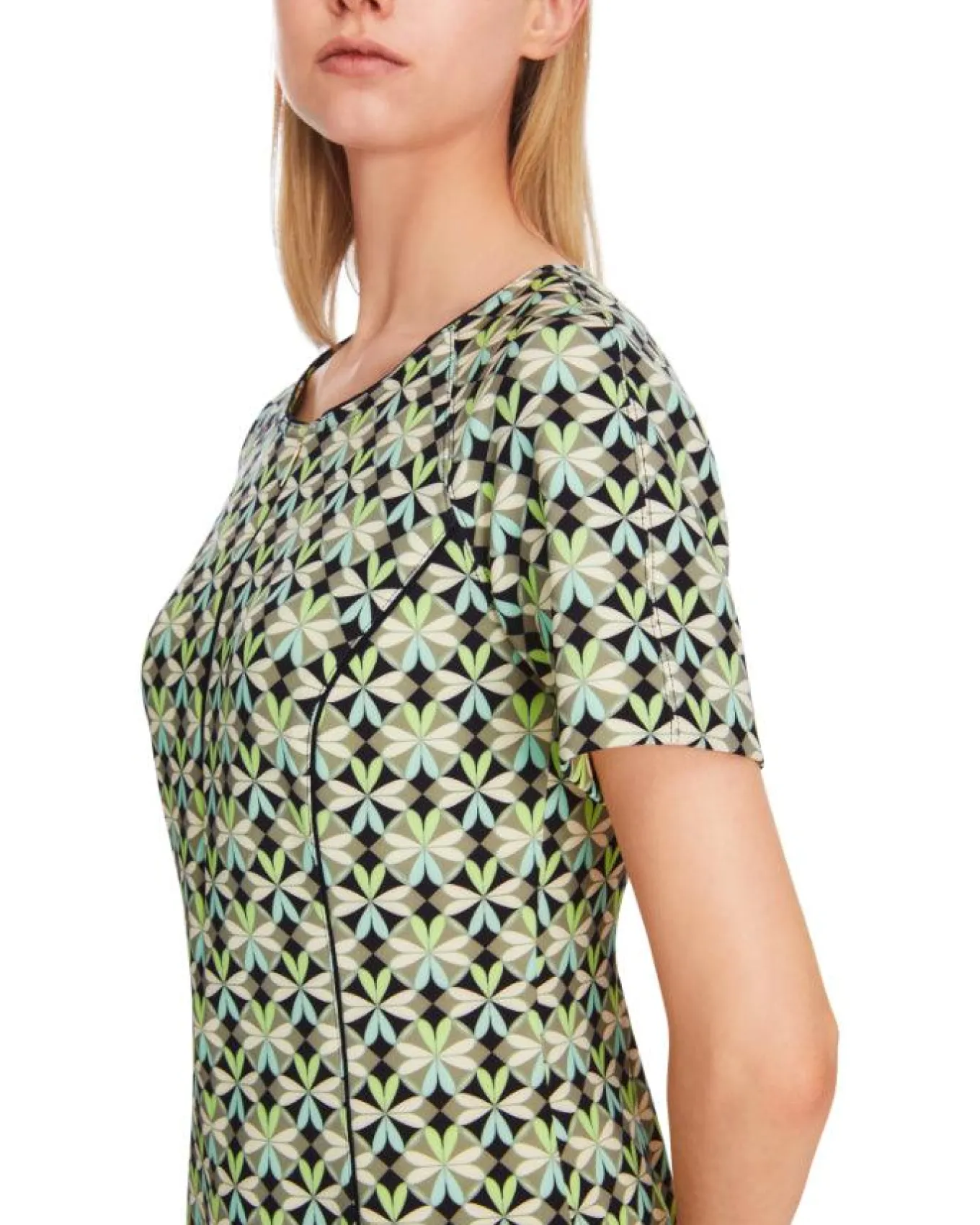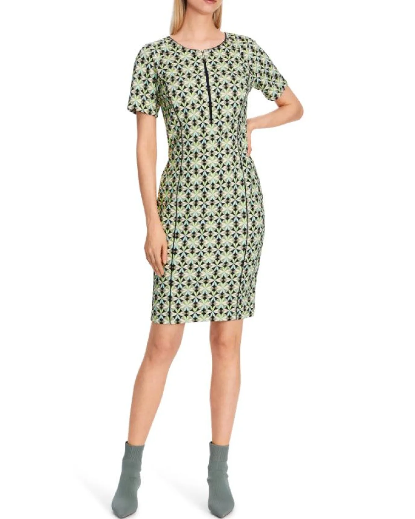 Marc Cain scuba print short sleeve dress features round neck with slit, fitted silhouette, Length 95cm.
