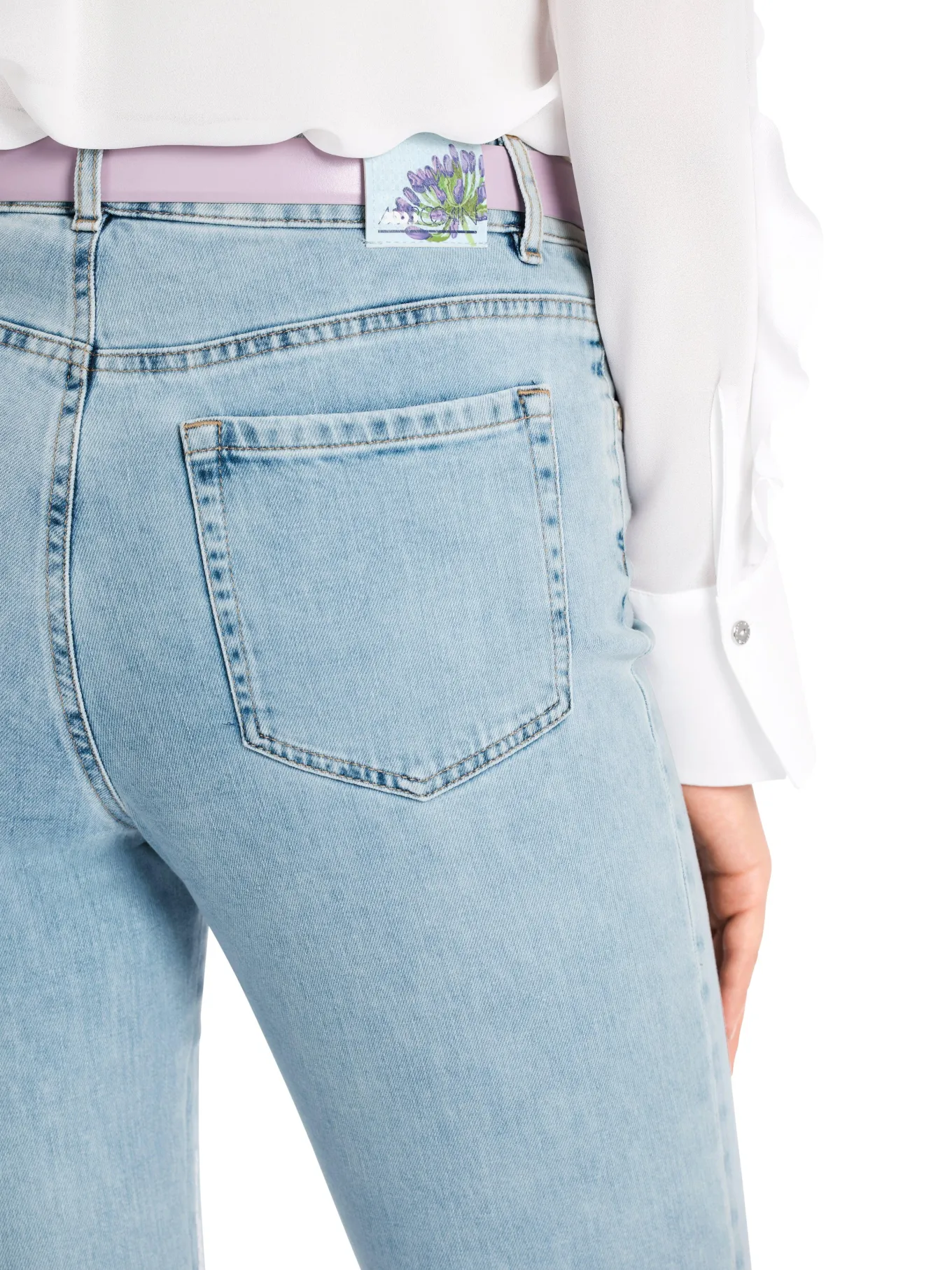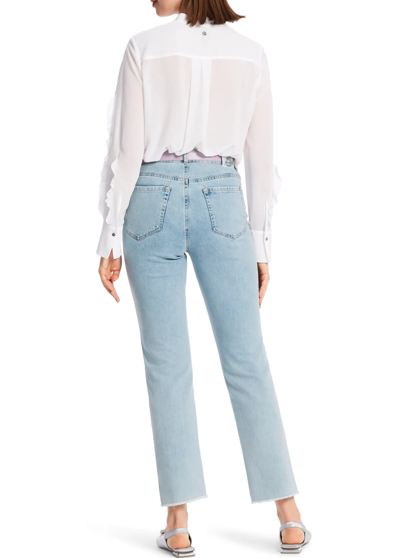 Marc Cain organic cotton distressed jeans characterized by the sequin embroidery on the front lower leg. They have a feminine silhouette with a regular-height waistband. The cropped leg has a fringed hem. A five-pocket cut and zip-fly fastening. Size 3 – Length 28″