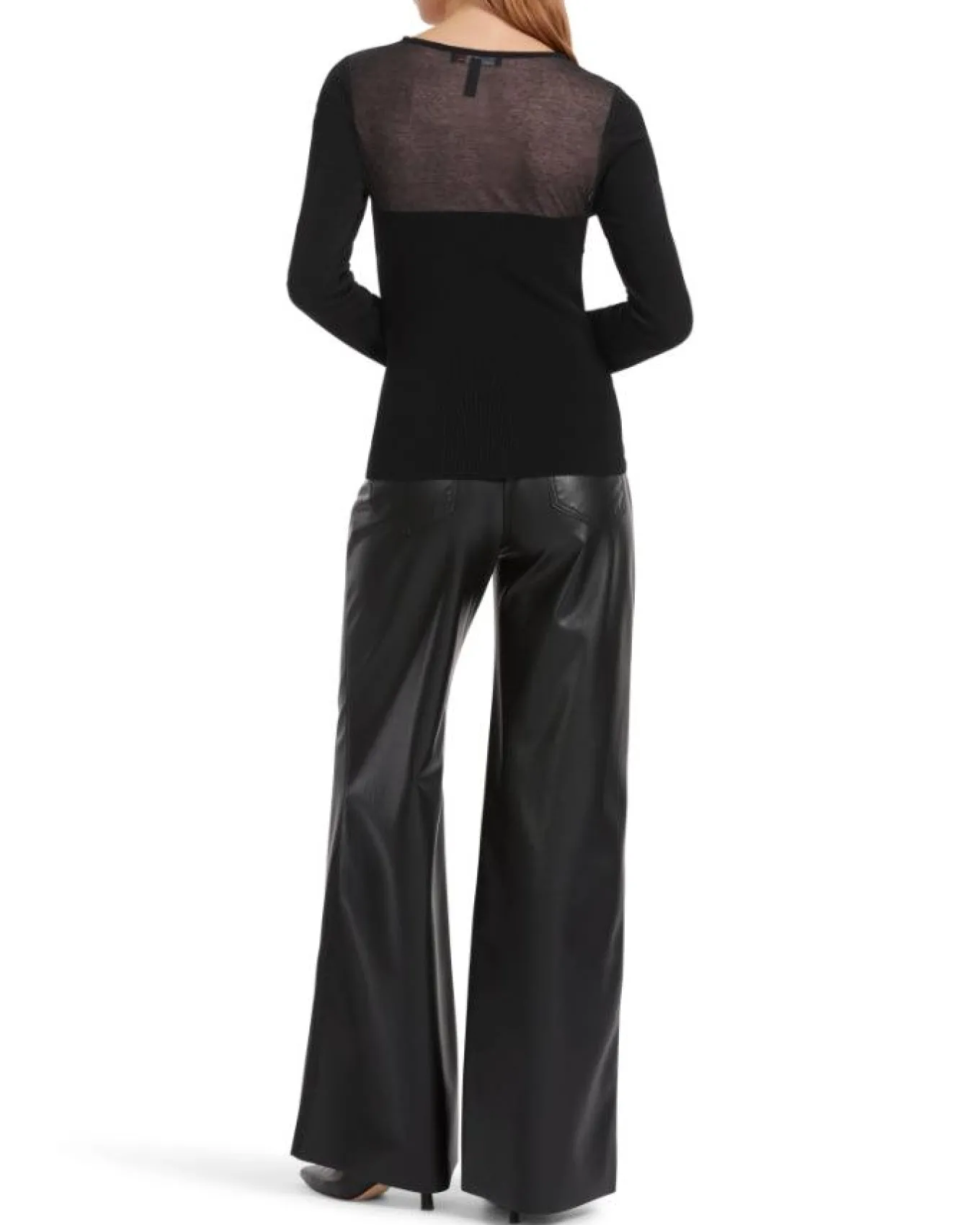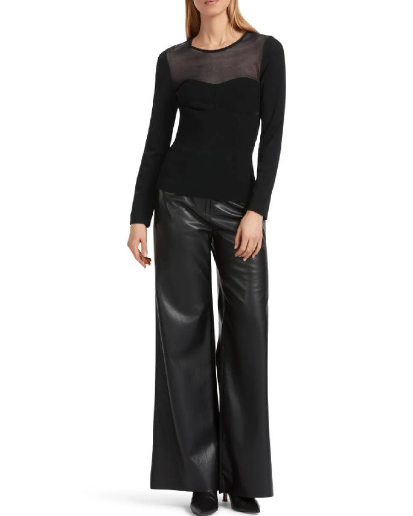 Lightweight fine knit long sleeve pullover with a sheer yoke for a feminine touch