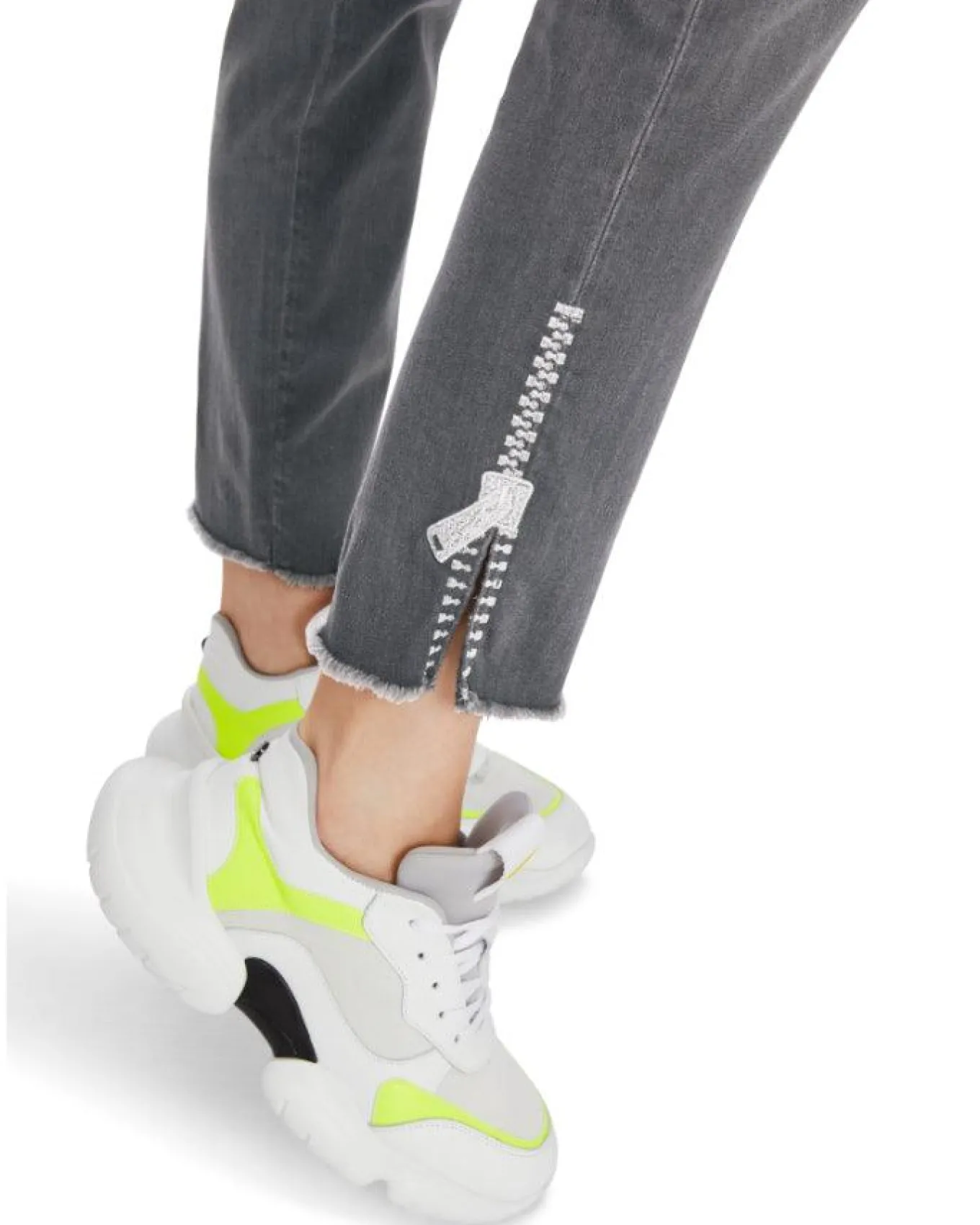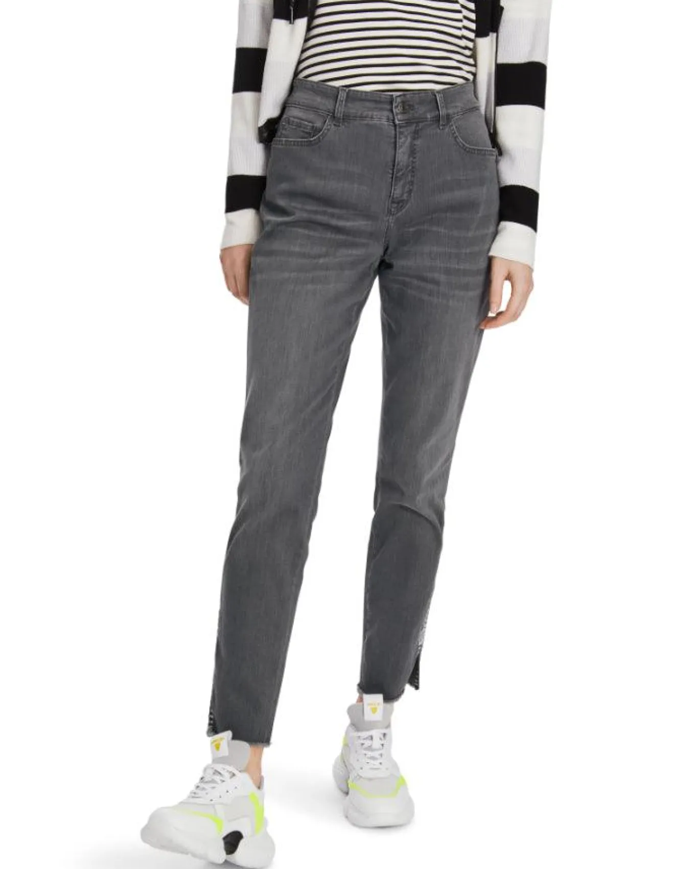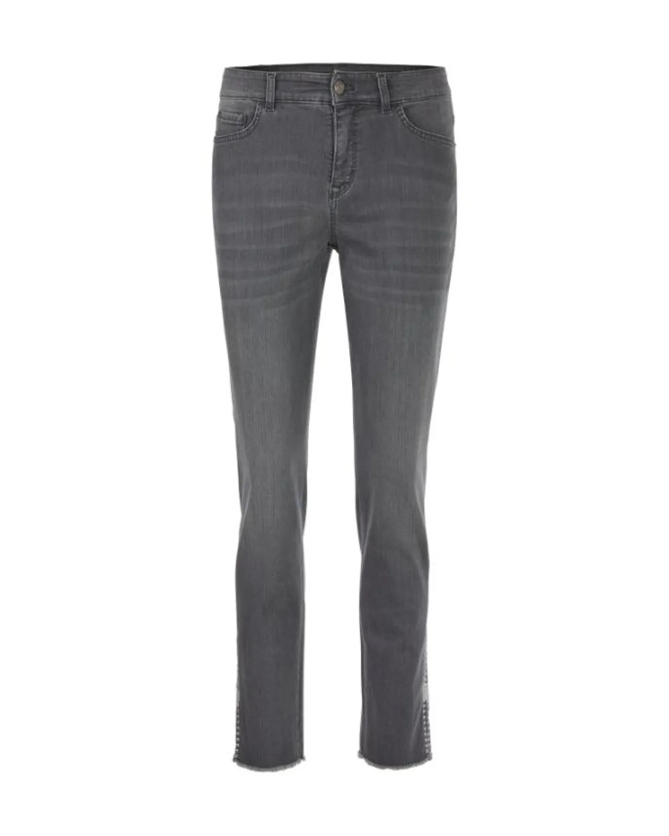 Marc Cain stretchy slim fit jeans with classic five pocket styling, faux zipper embroidered on side at the hem with slit, raw end hem, ankle length, button and zip closure.