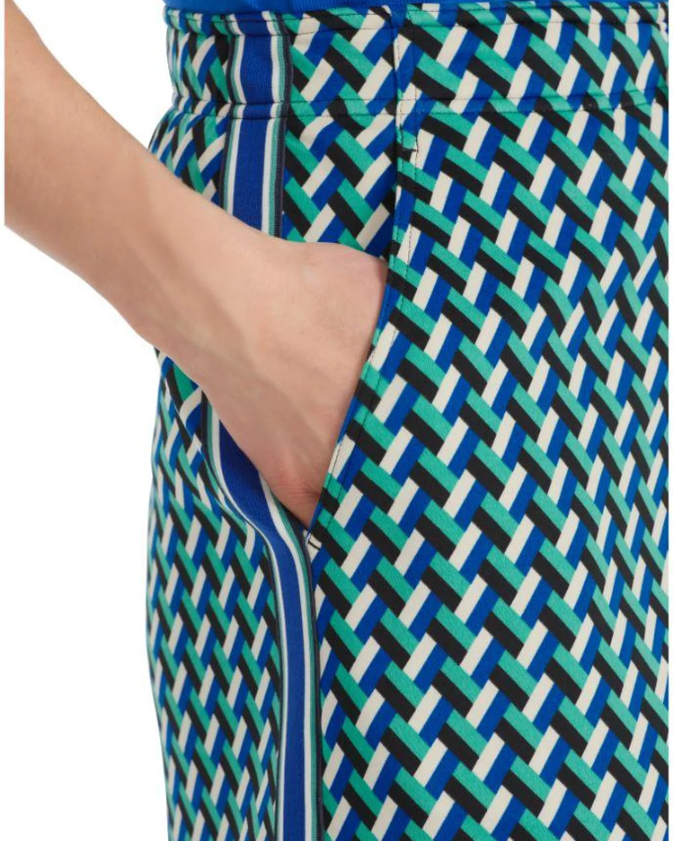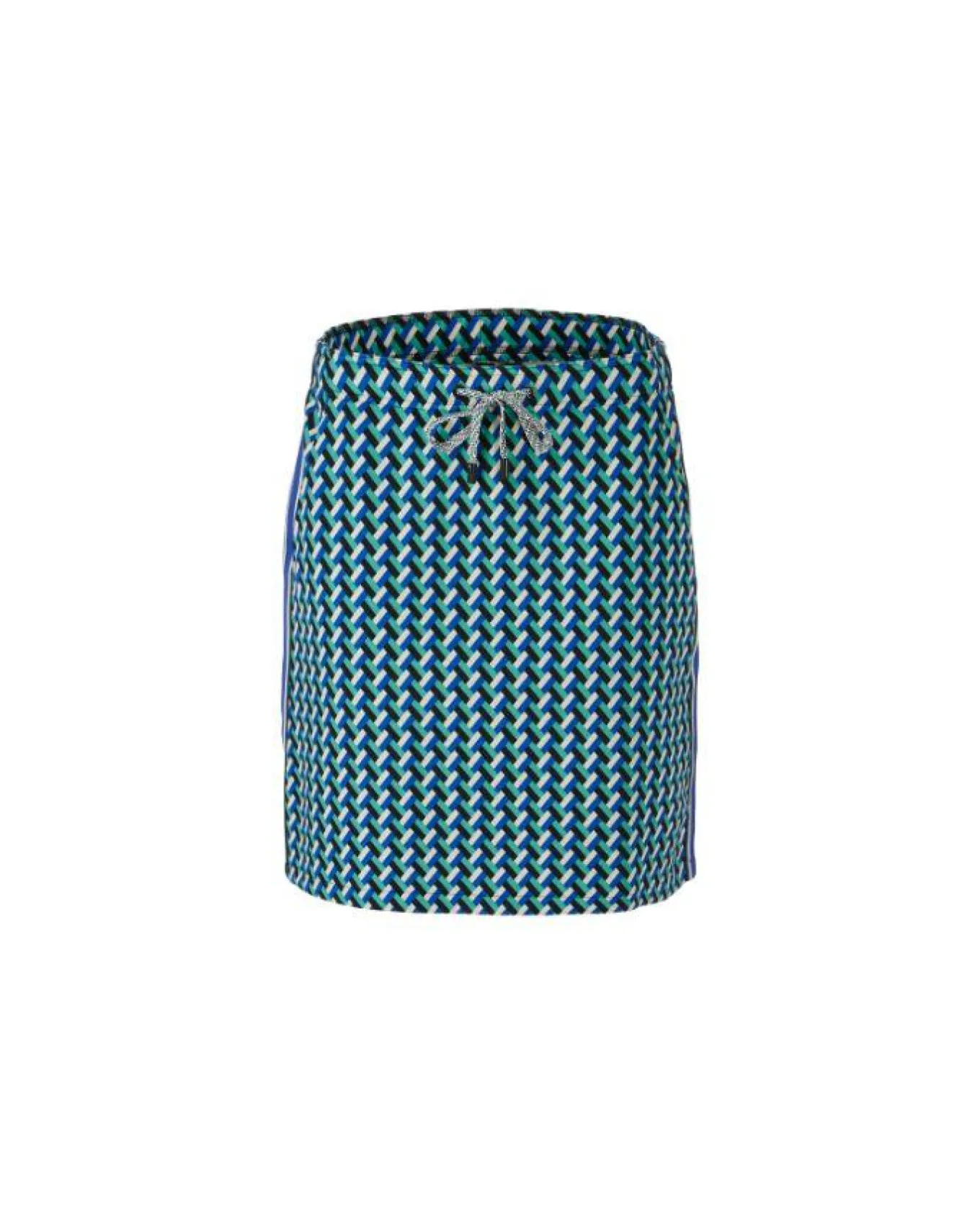 Sporty weave pattern jersey pull on skirt with waist drawstirng, side pockets, side stripe detail, Length – 50cm