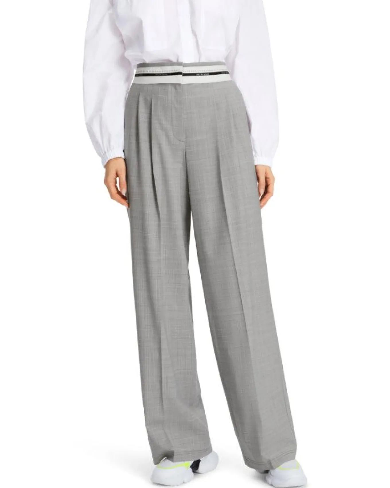 Marc Cain high waist, full length, wide leg pant with front pleat, side pockets, back welt pockets, striped waistband with hook and zip closure.