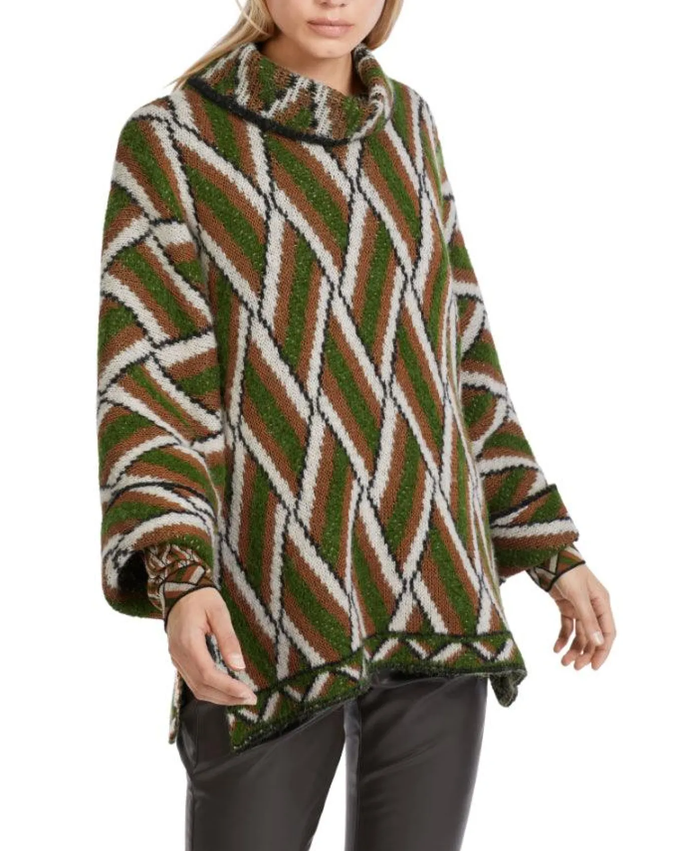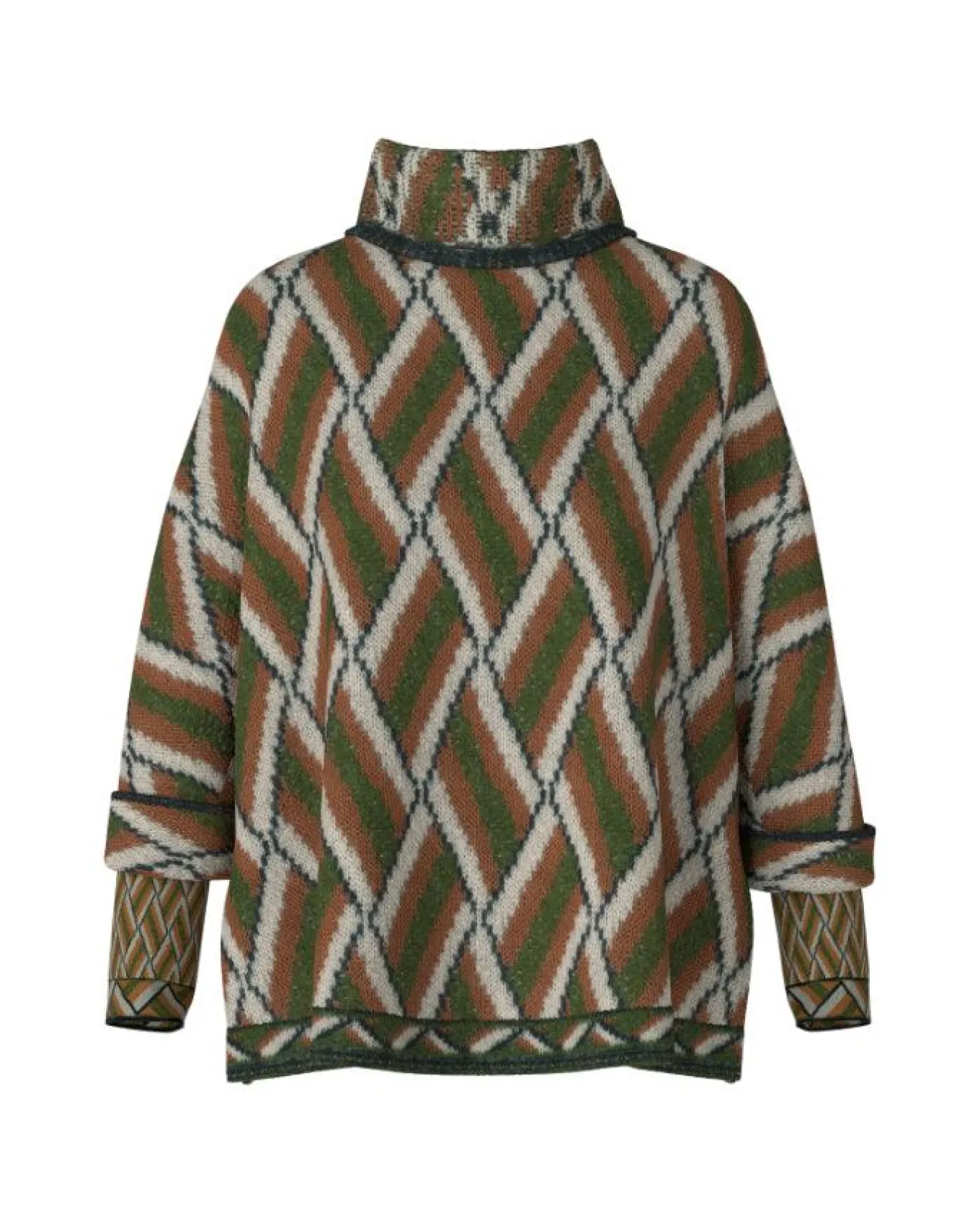 Relaxed fit woven pattern knit pullover with funnel neck, rolled 3/4 sleeves, side slits and contrast hem detail.