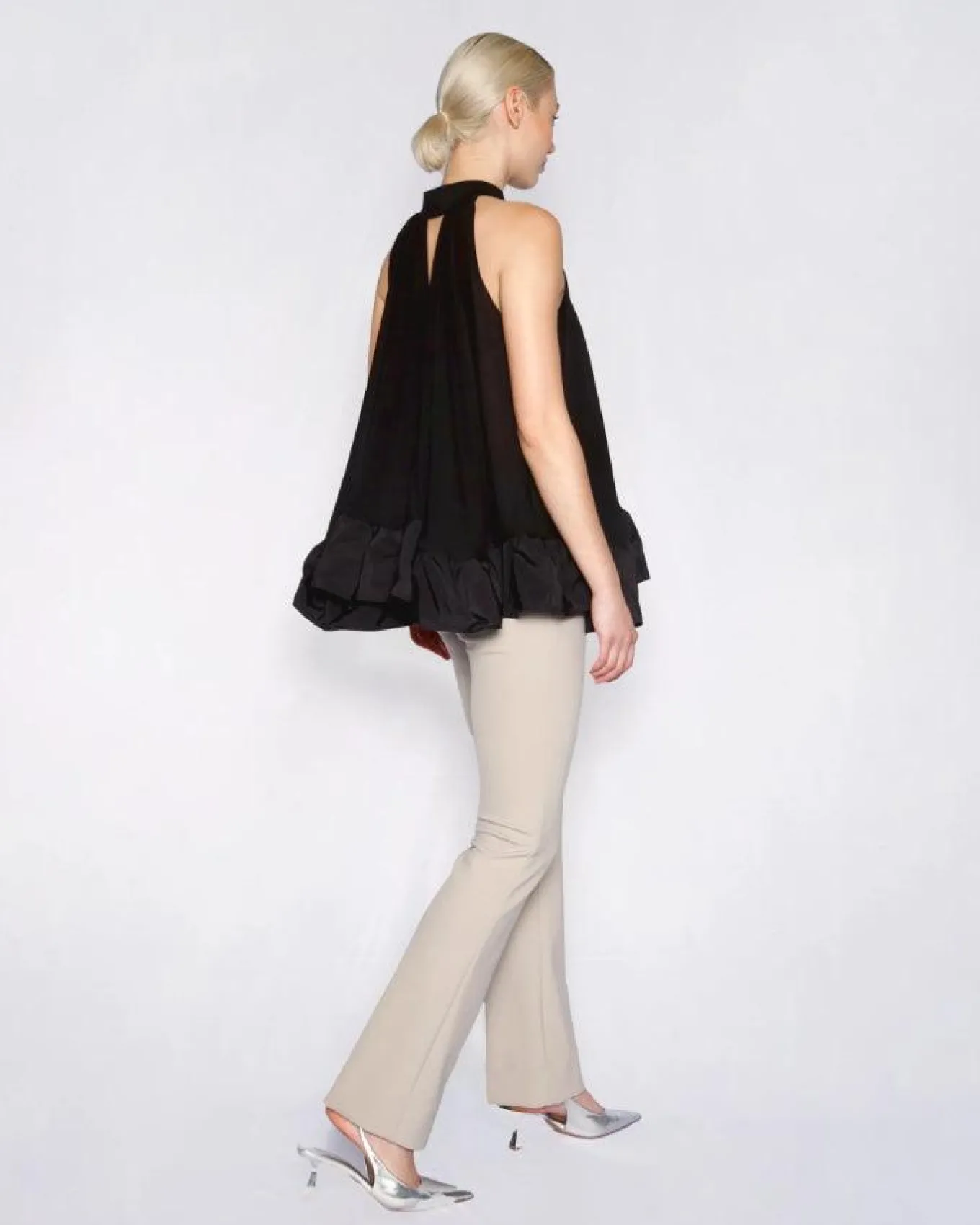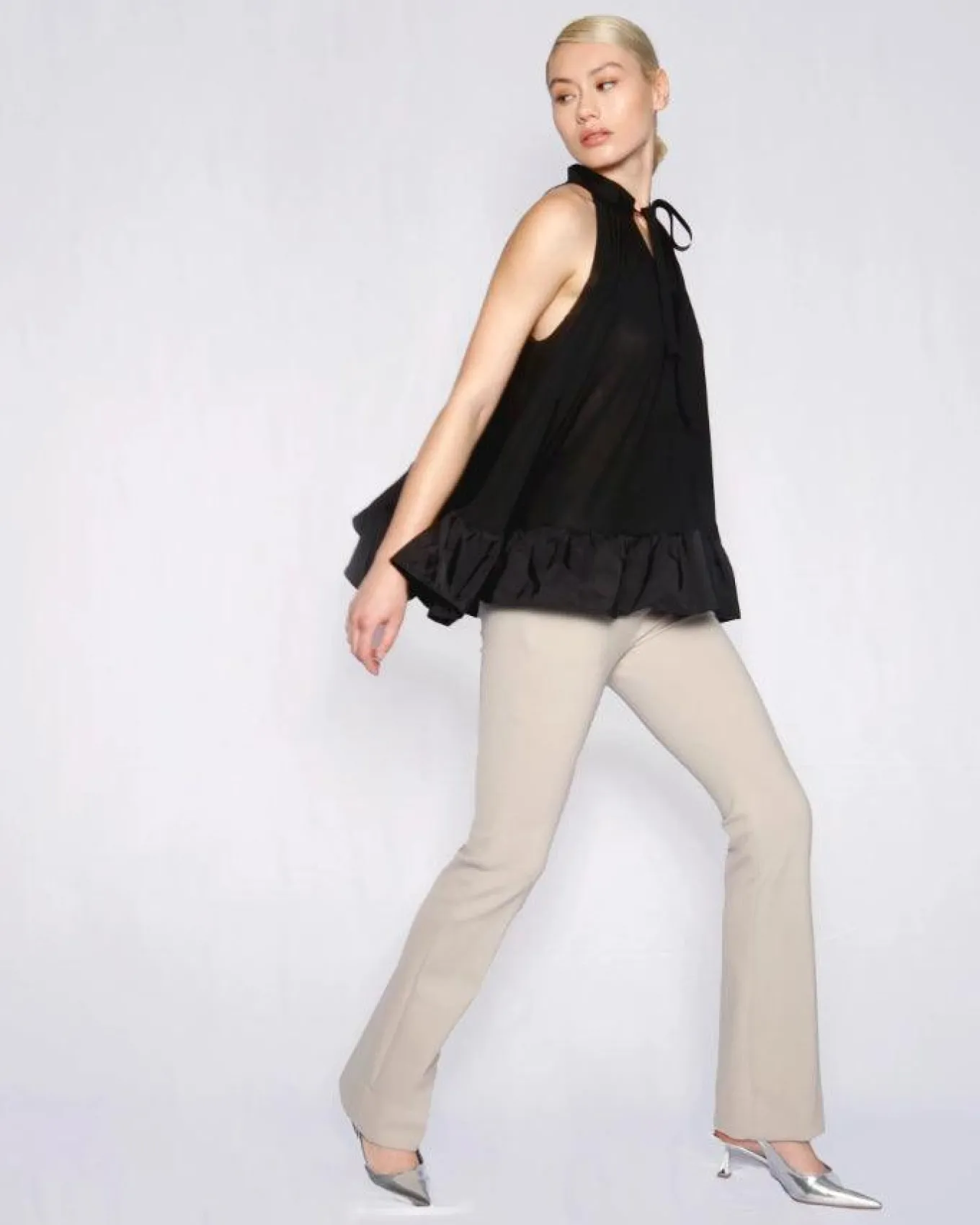 Marie Saint Pierre delightful eye-catching jersey mesh sleeveless top with double jersey trims and a lightweight and soft poly memory frilled hem that embodies fun and sophistication.