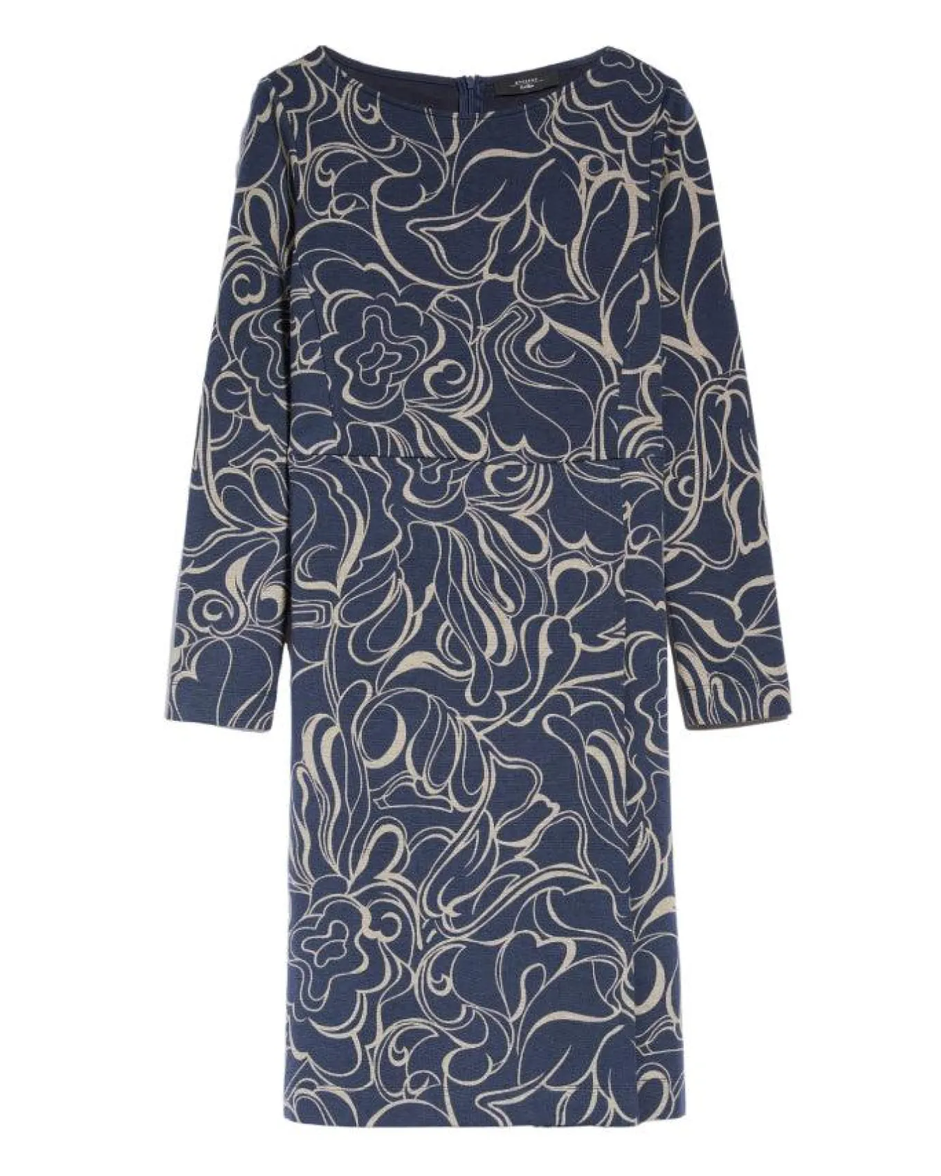 Long sleeved boat neck dress in printed interlock jersey fabric featuring a side pleat decorated skirt. The darted, slightly fitted waist enhances the garment’s femininity. Length: 96 cm