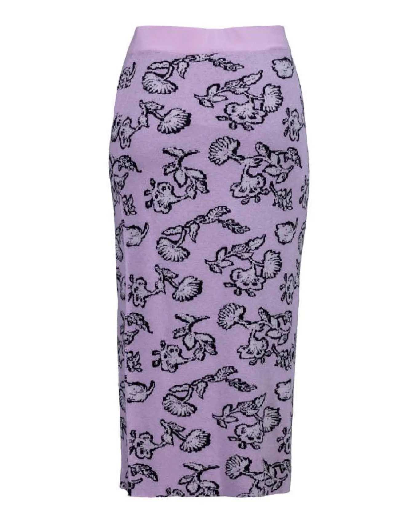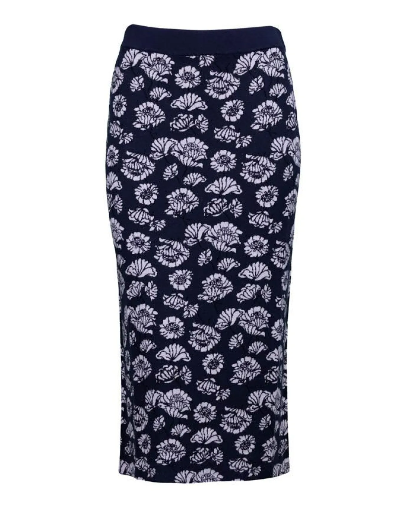 Max Mara floral print jersey knit pull on skirt with elastic band, has a straight silhouette and falls below the knee.