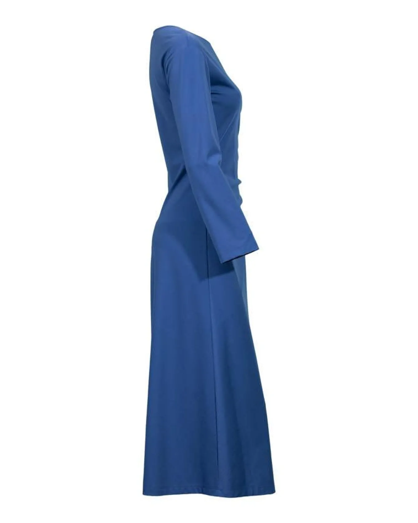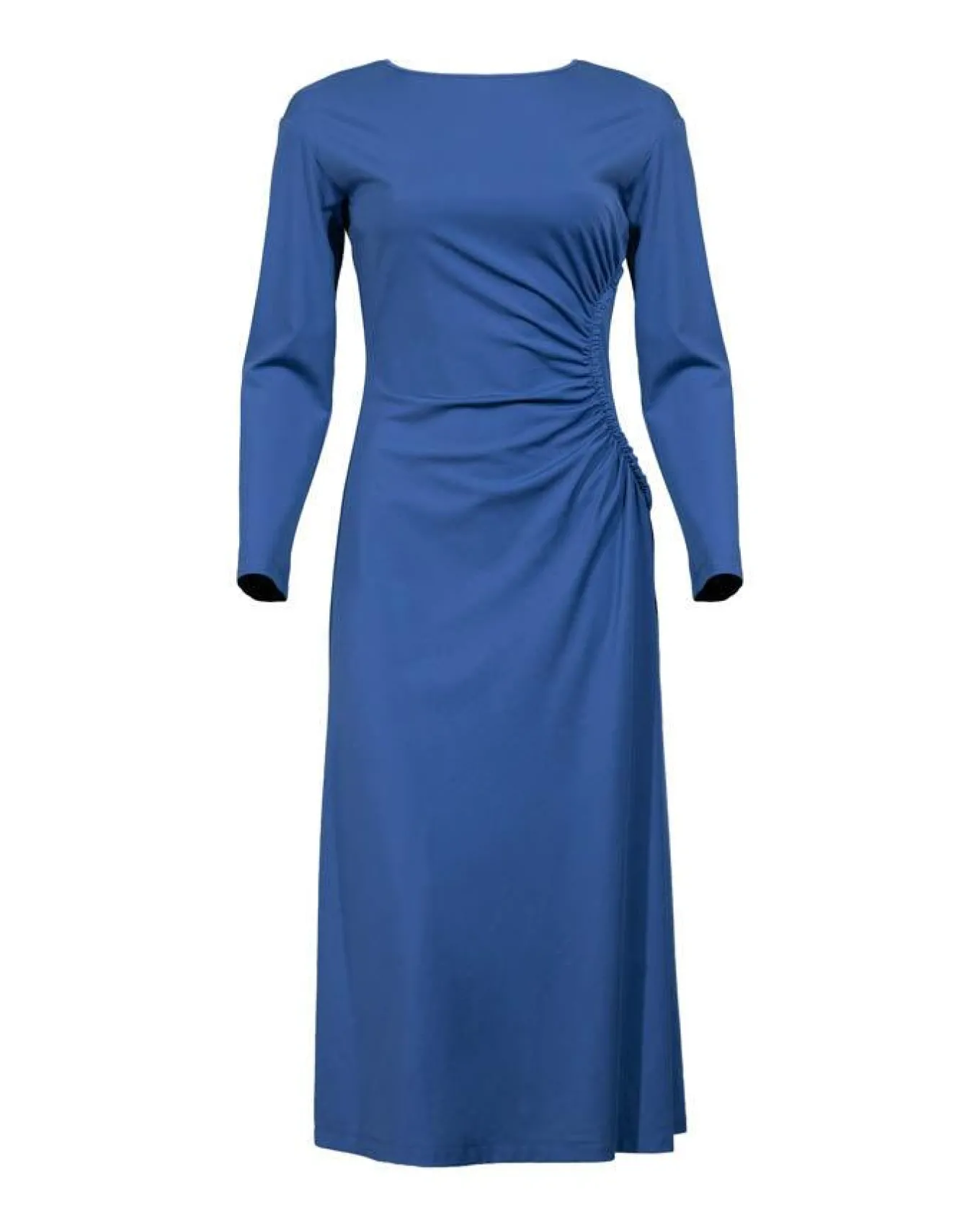 Max Mara mid length jersey long sleeve dress featuring ruching detail on the side, slightly dropped shoulders, back zip closure and an a-line skirt.