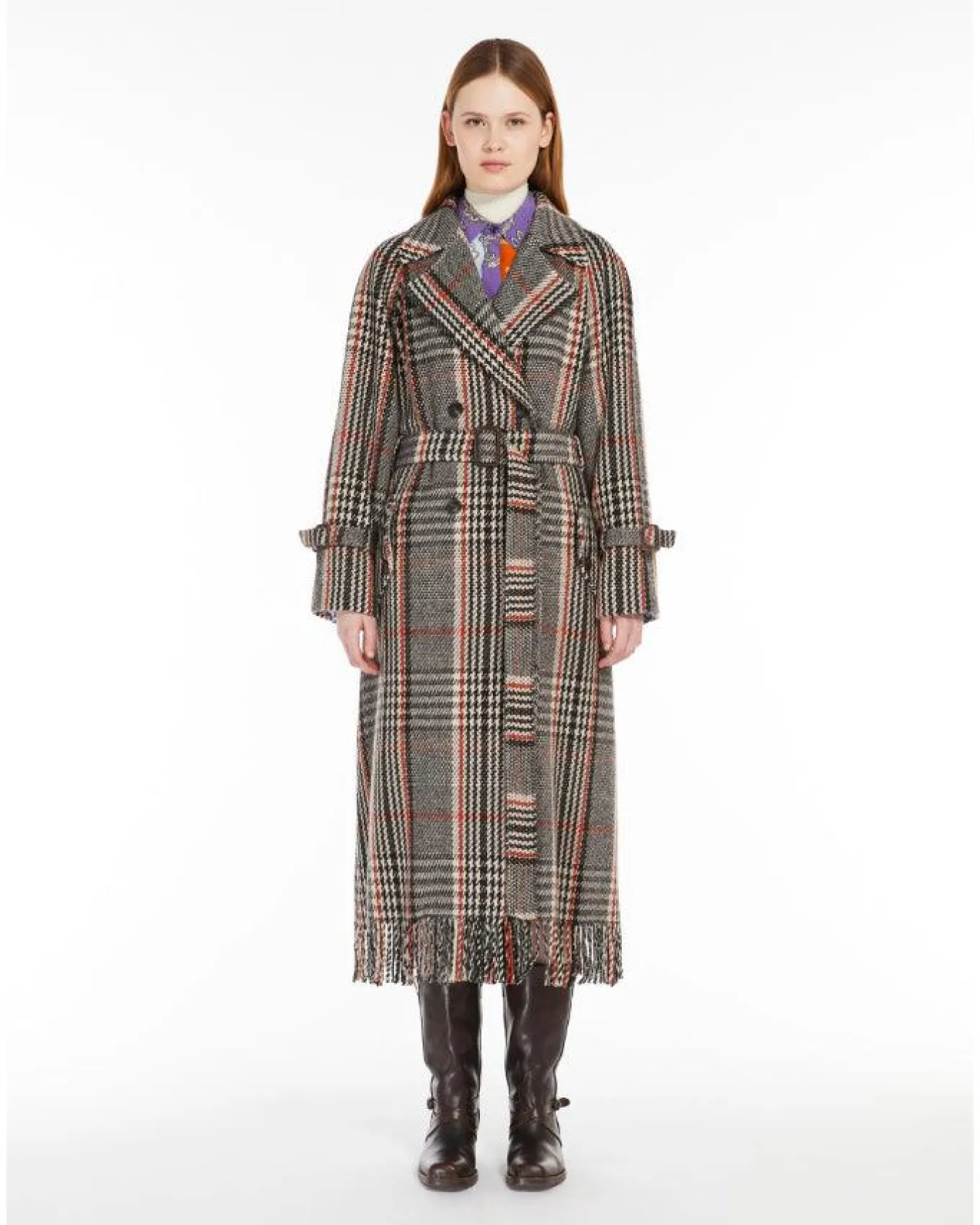 Max Mara Weekend Long double-breasted trench-style coat in wool-blend twill fabric featuring a classic check pattern. The half-lined model boasts a lapel collar, cuff tab-adorned long raglan sleeves and knotted fringe detail at the hem. Rain cape and a central rear vent. Horn-look button fastening and a waistline-accentuating matching belt.