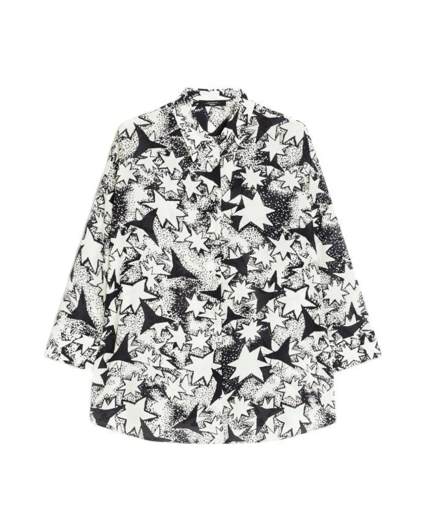 Max Mara Weekend slightly flared, relaxed-fit shirt in fine silk crepe de chine fabric featuring an all-over printed pattern, classic pointed collar and 3/4 sleeves, buttoned cuff and drop-shoulder detail. It also features a rounded hem and visible mother-of-pearl button fastening.